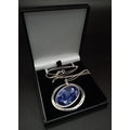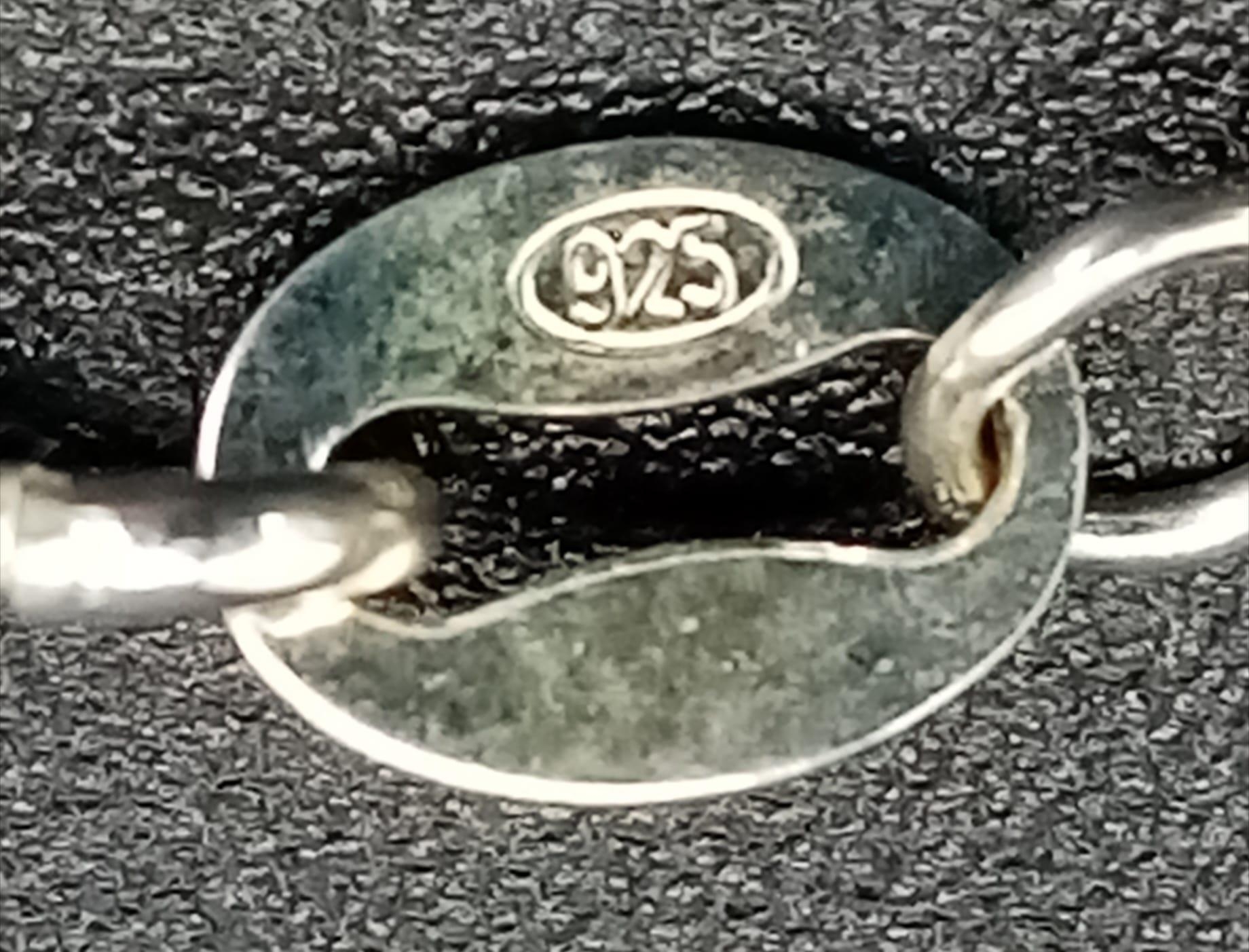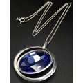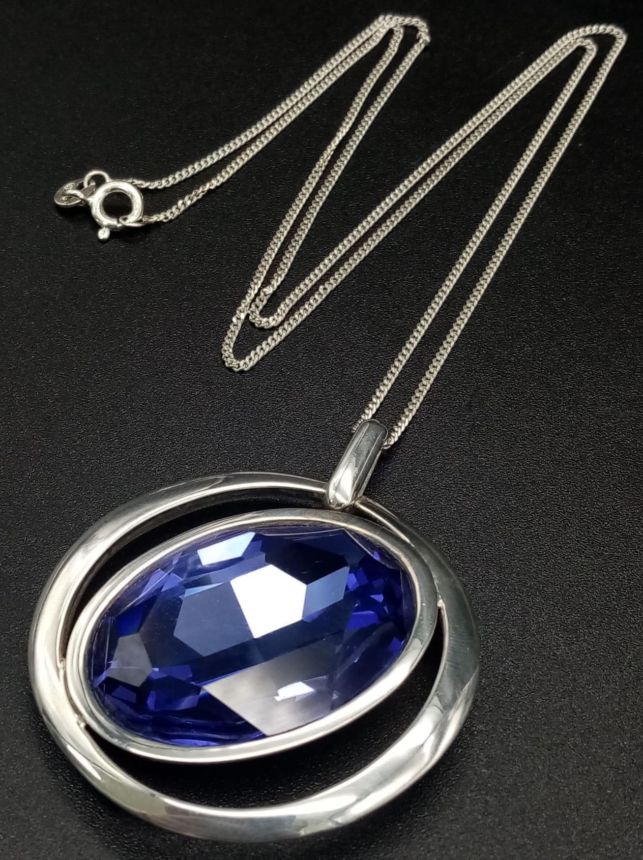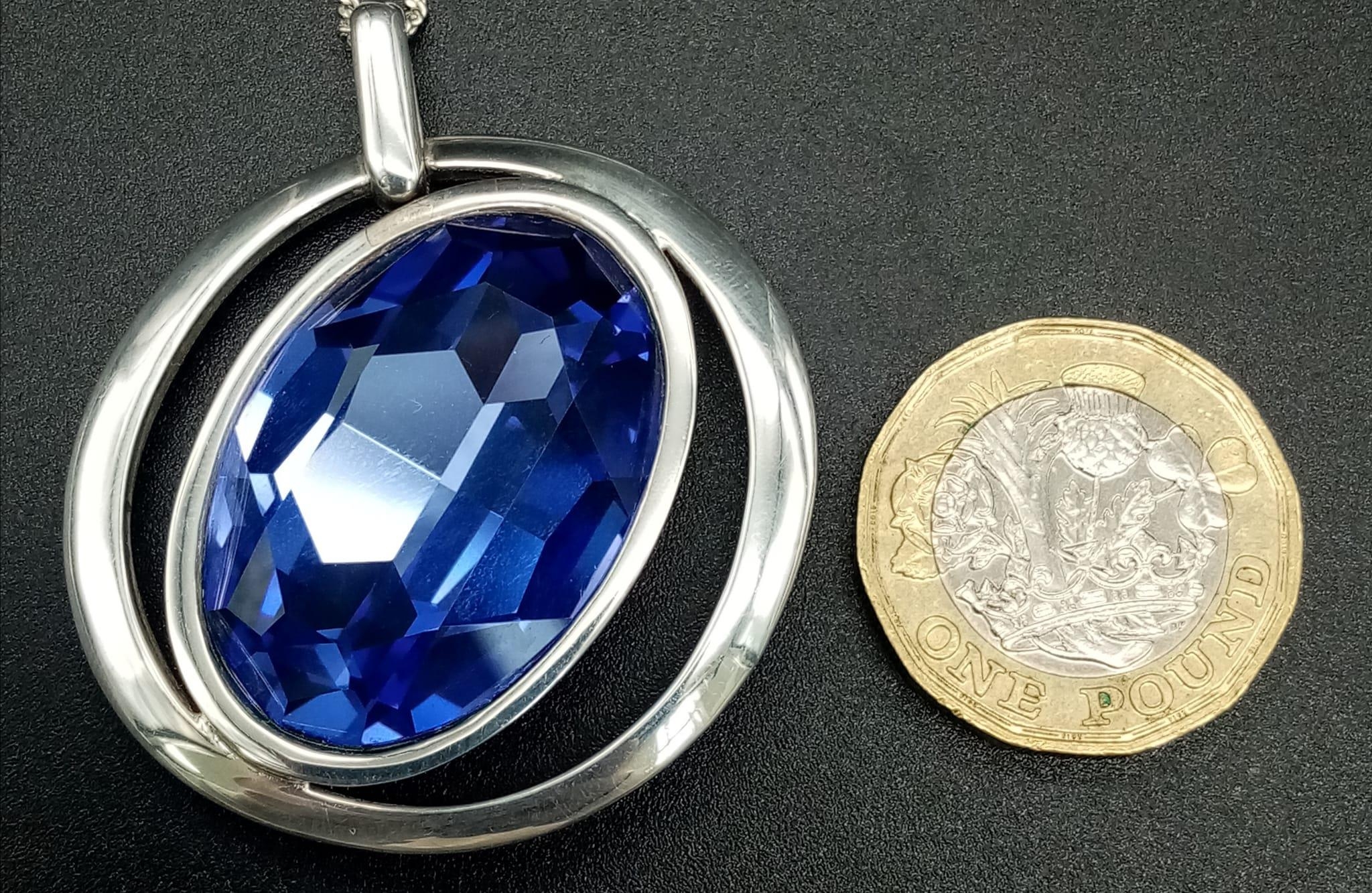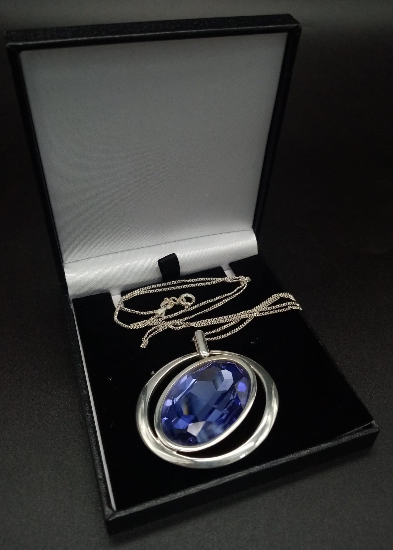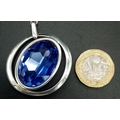 New Sterling Silver 3cm Length Oval Cut Tanzanite Colour Zircon Set. Necklace 50cm Length chain, Pendant measures 4cm wide. Weight 23.95 grams. In presentation box.