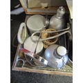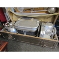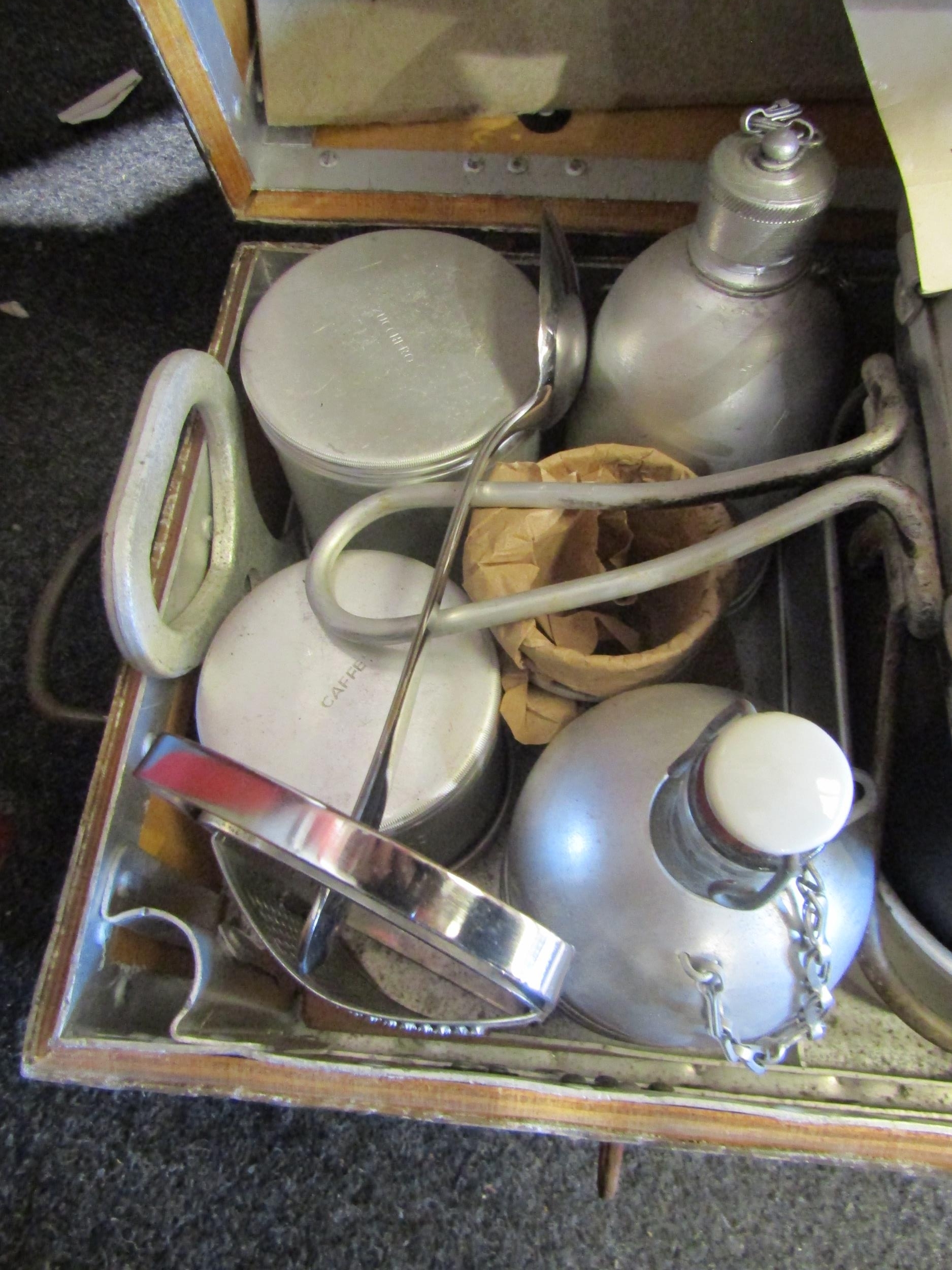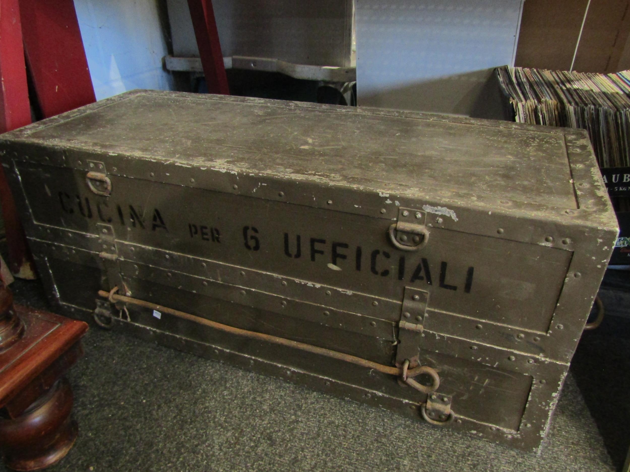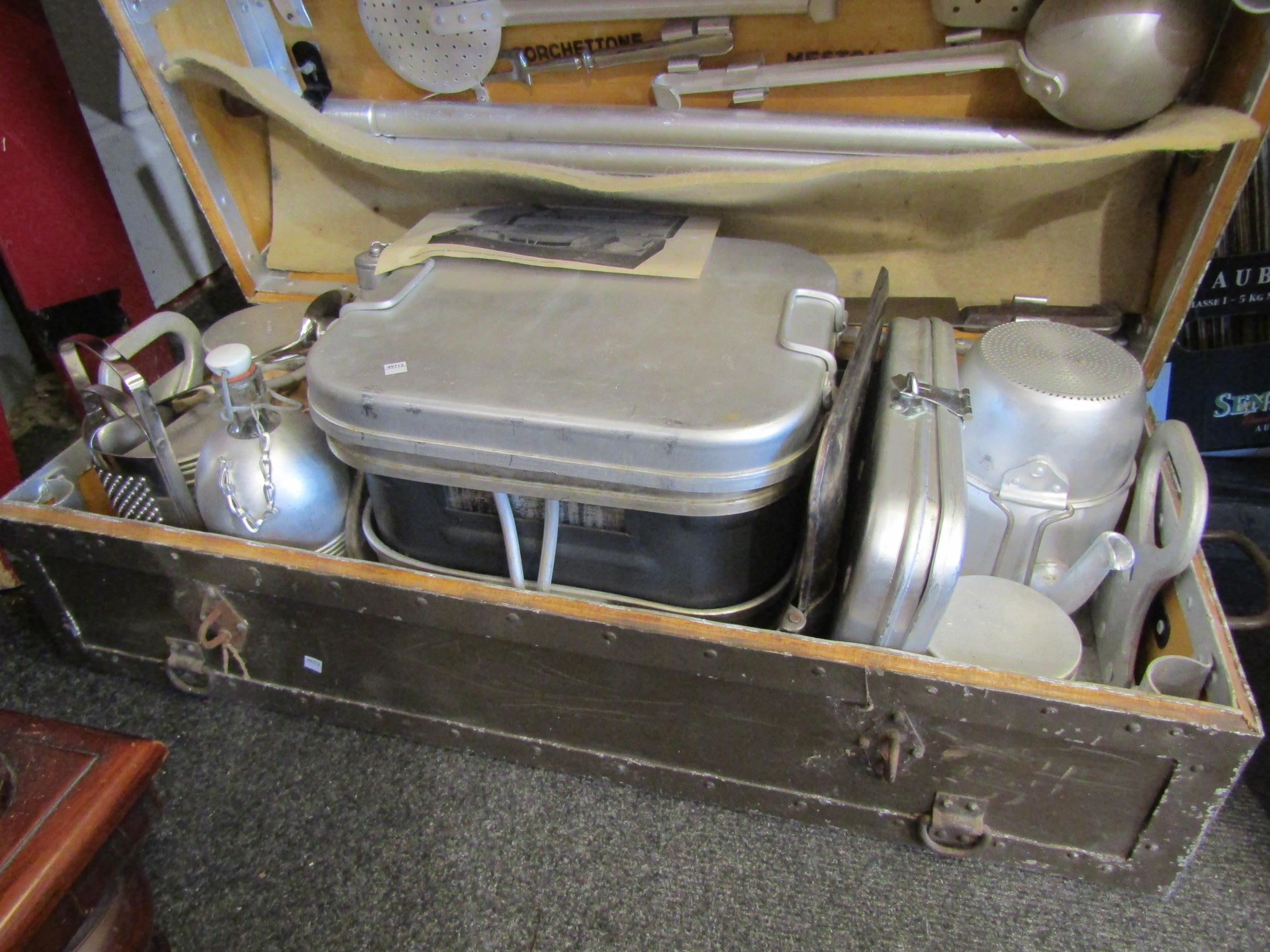 An Italian Army campaign camp kitchen, the green painted case stencilled 'Cucina Per 6 Ufficiali' containing various catering wares, thought to be WWII