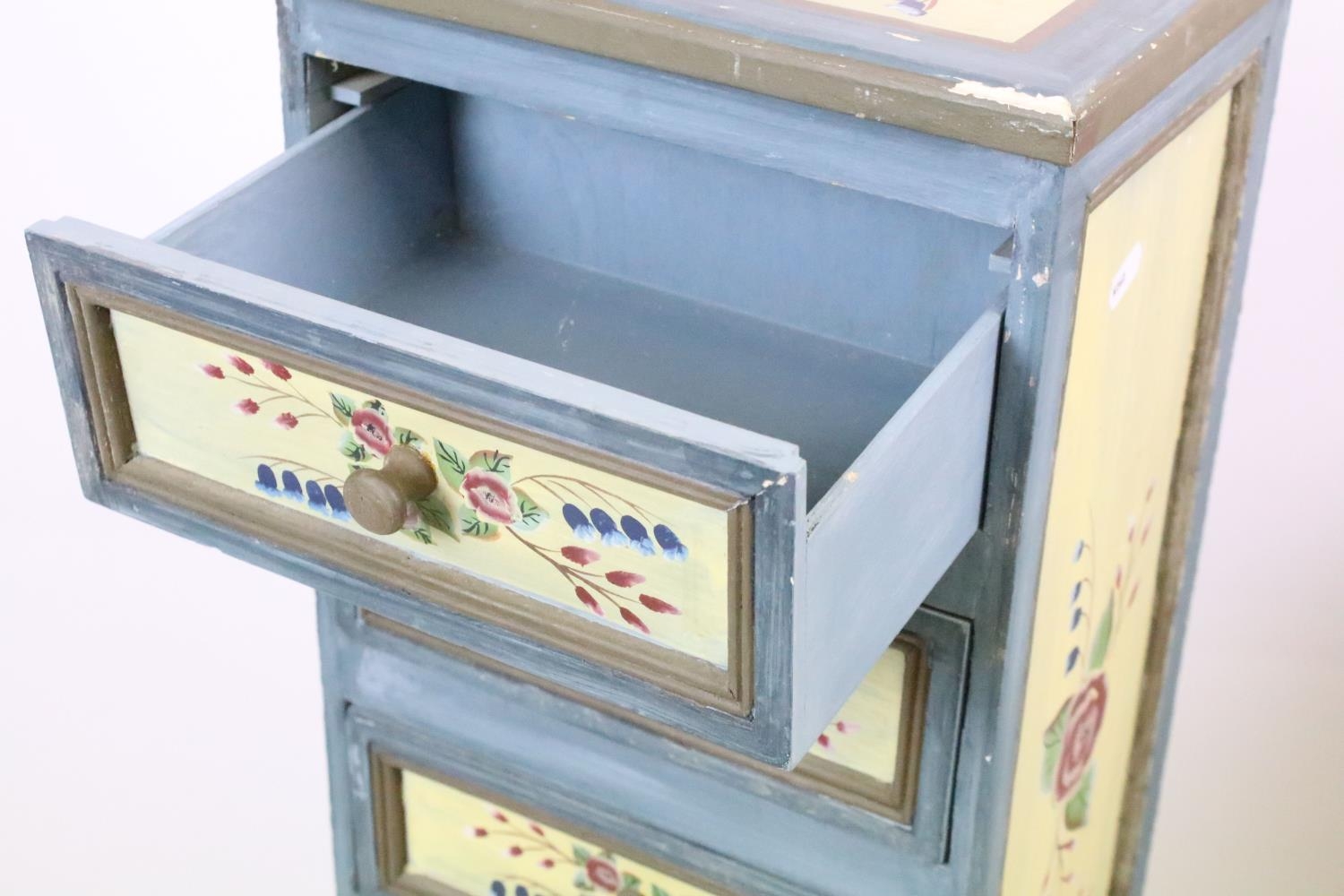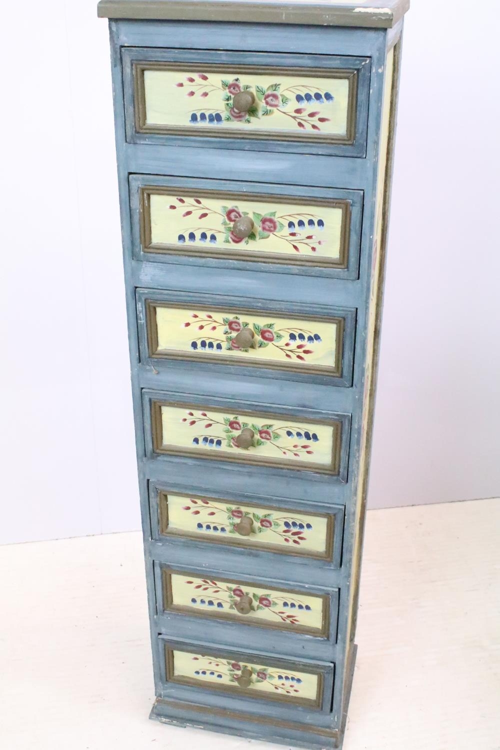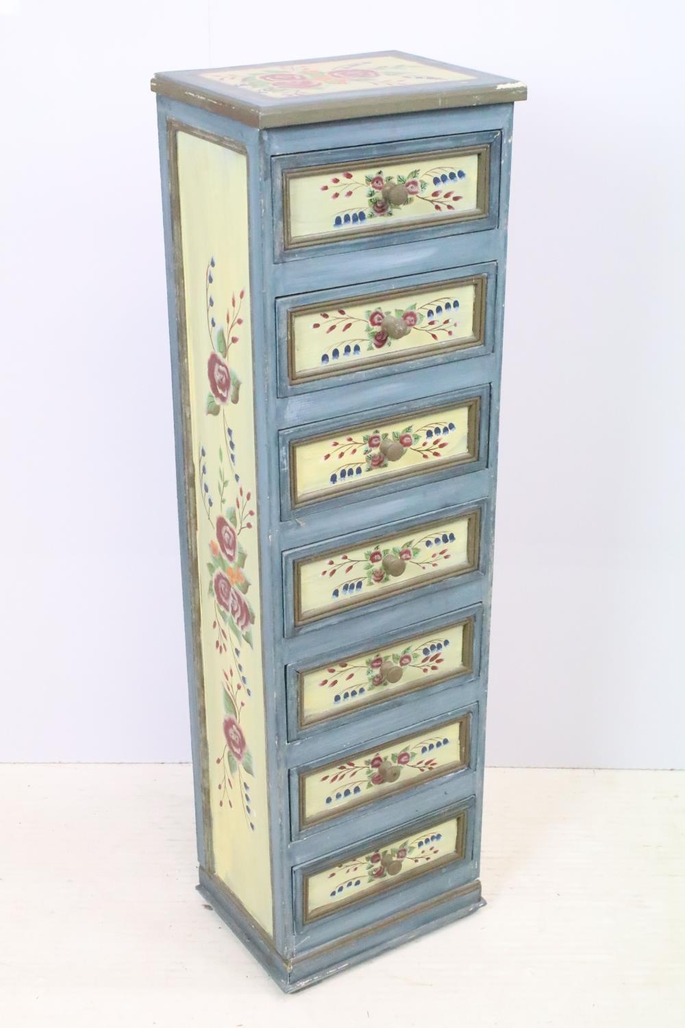 Chest of seven drawers, painted with floral sprays, 96cm high x 27.5cm wide x 21cm deep