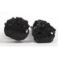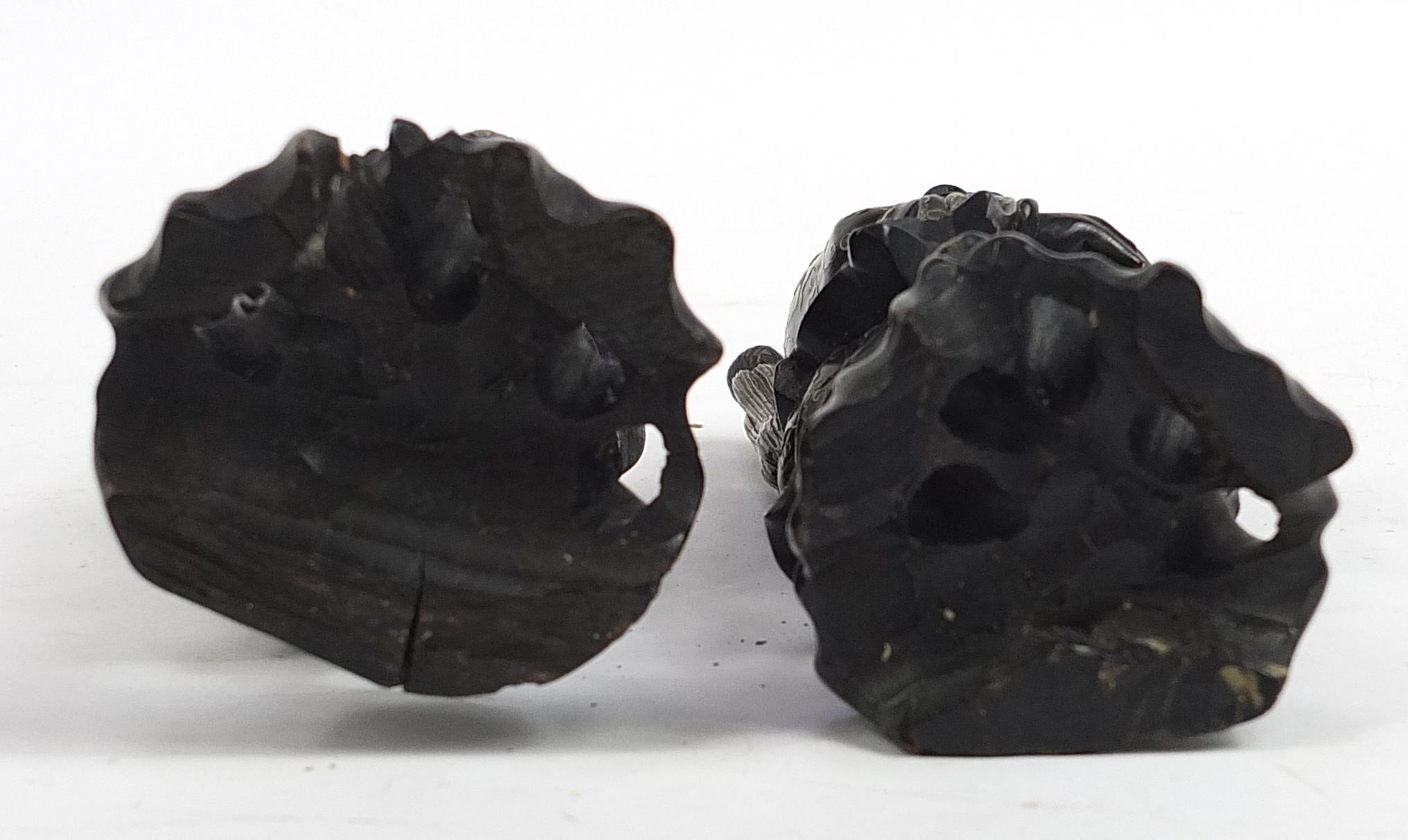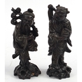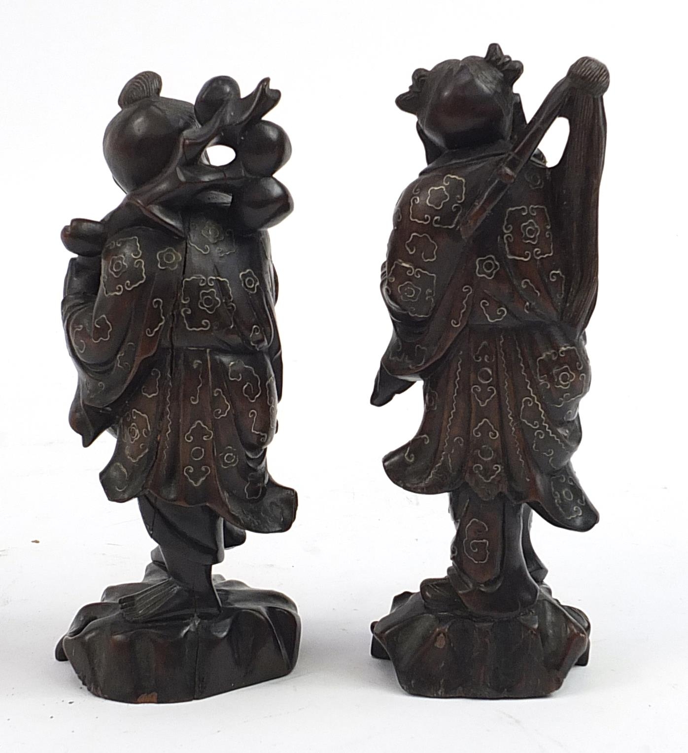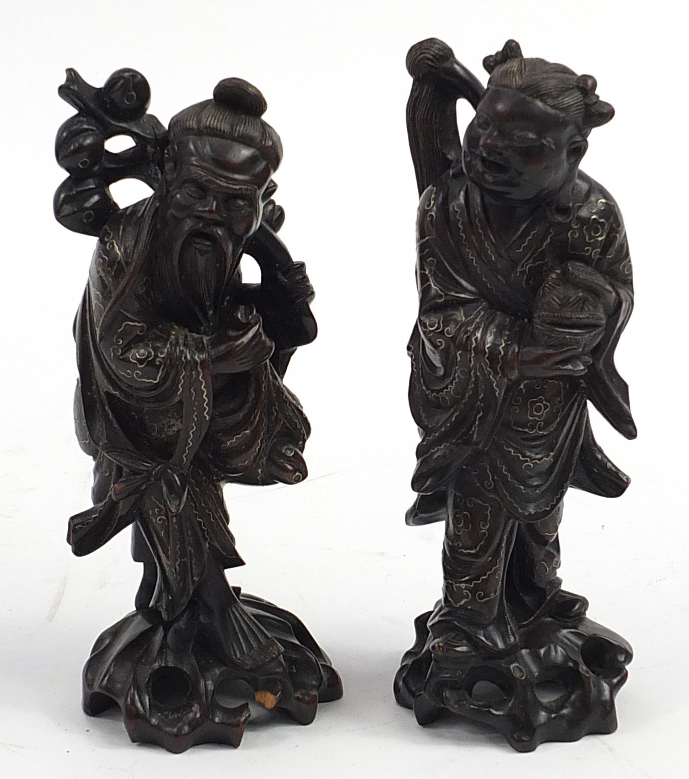 Pair of Chinese carved root wood figures with white metal inlay, 20.5cm high