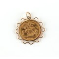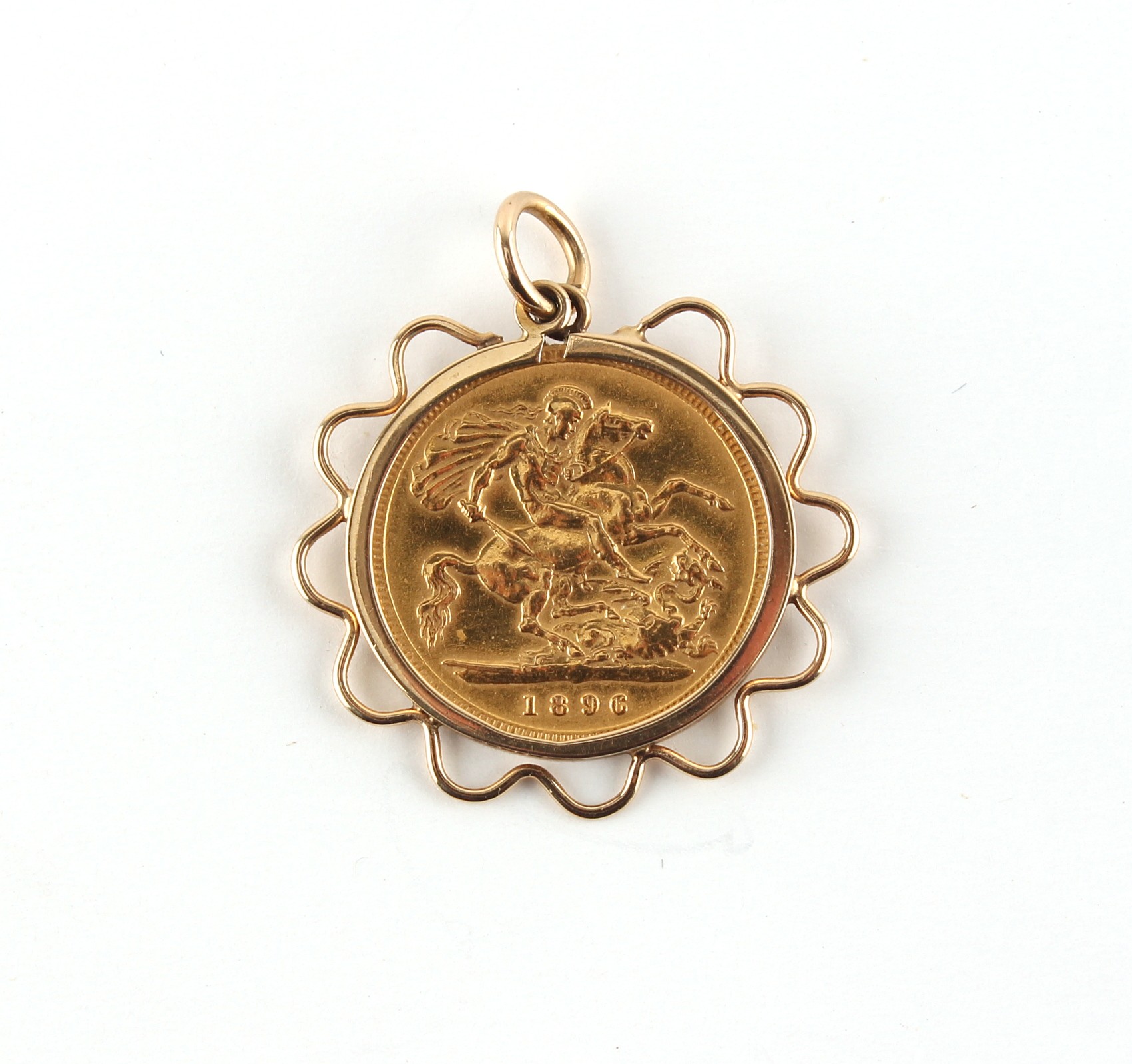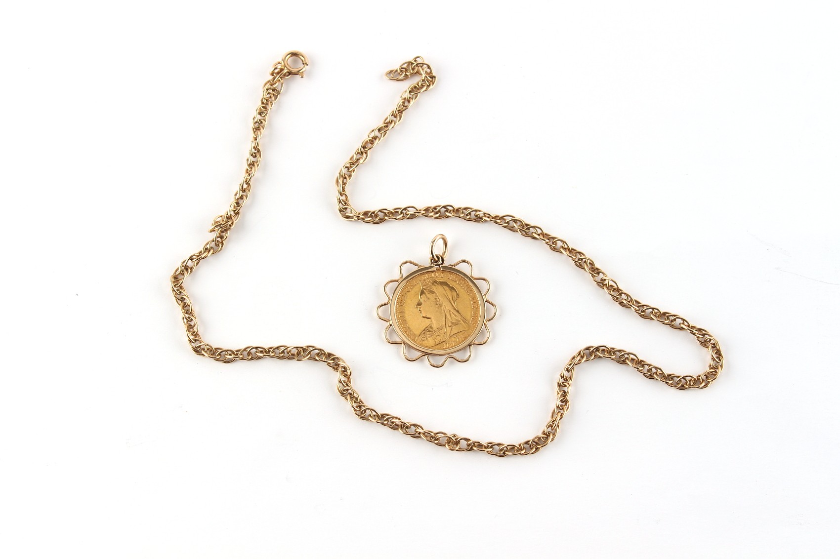 Property of a lady - gold coin - an 1896 Queen Victoria gold half sovereign, London mint, freely rotating in a 9ct gold pendant mount & suspended from a 9ct gold chain necklace, approximately 12.3 grams total, the chain 15.8ins. (40cms.) long.
