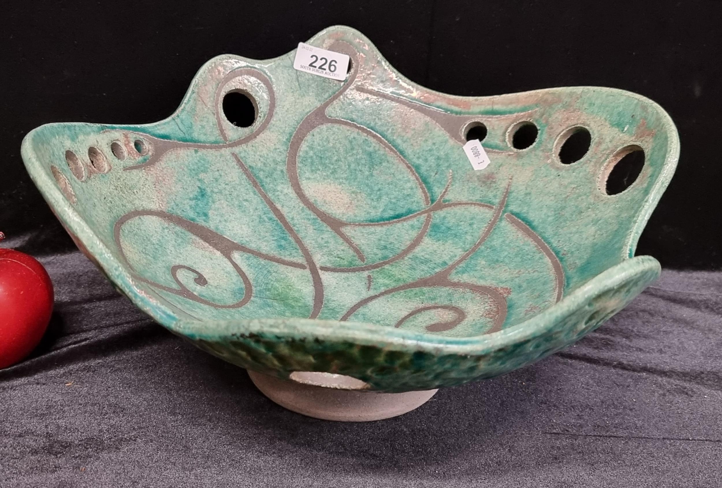 A vary large decorative bowl by "Design Yard", with pierced circular detail and Celtic swirls in a mottled glaze finish. Inspired by a painters plate.