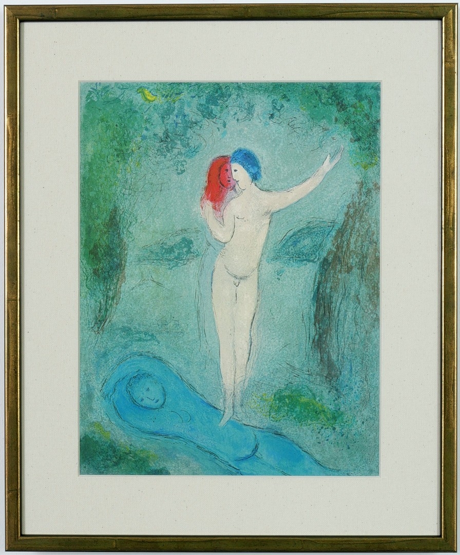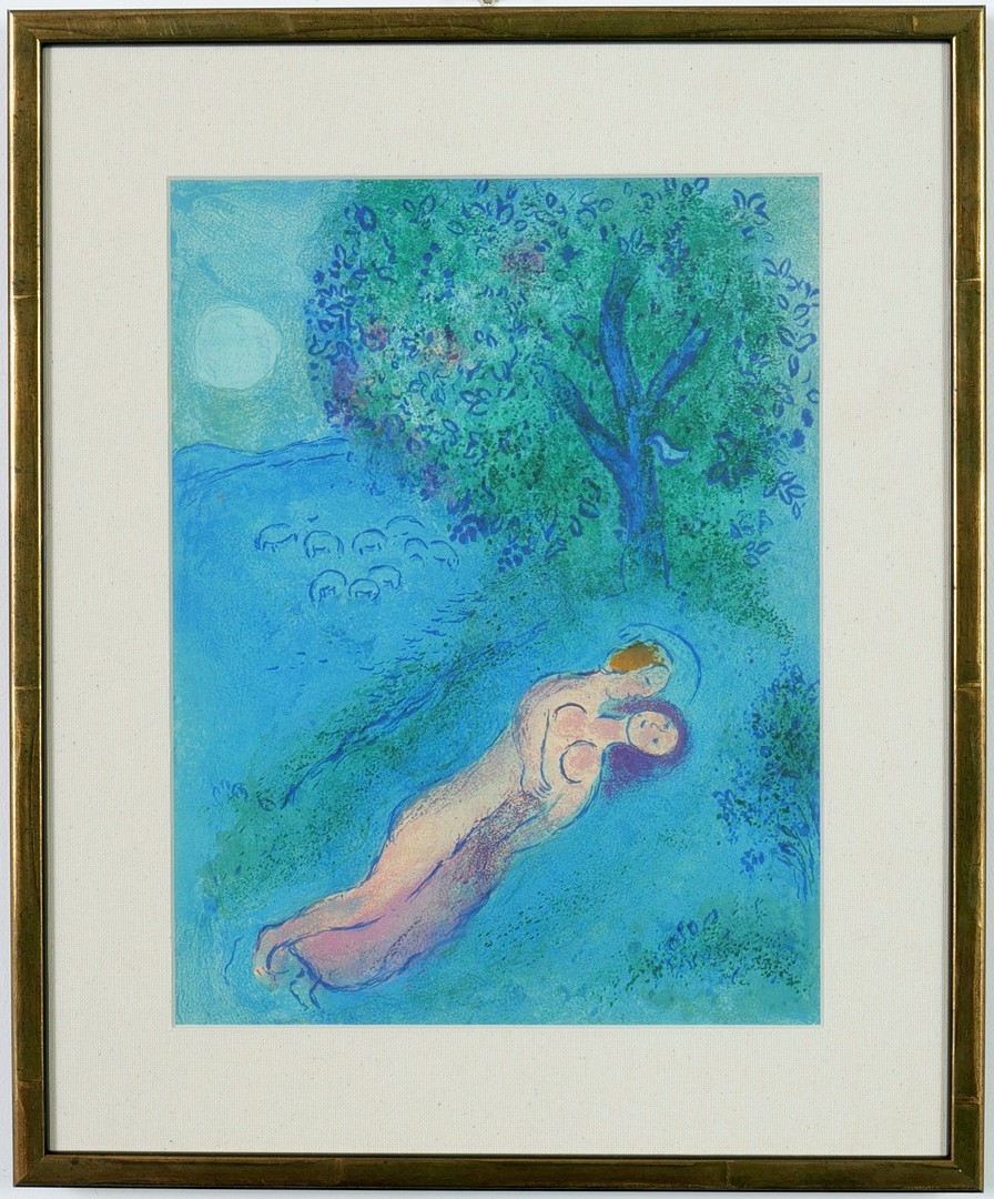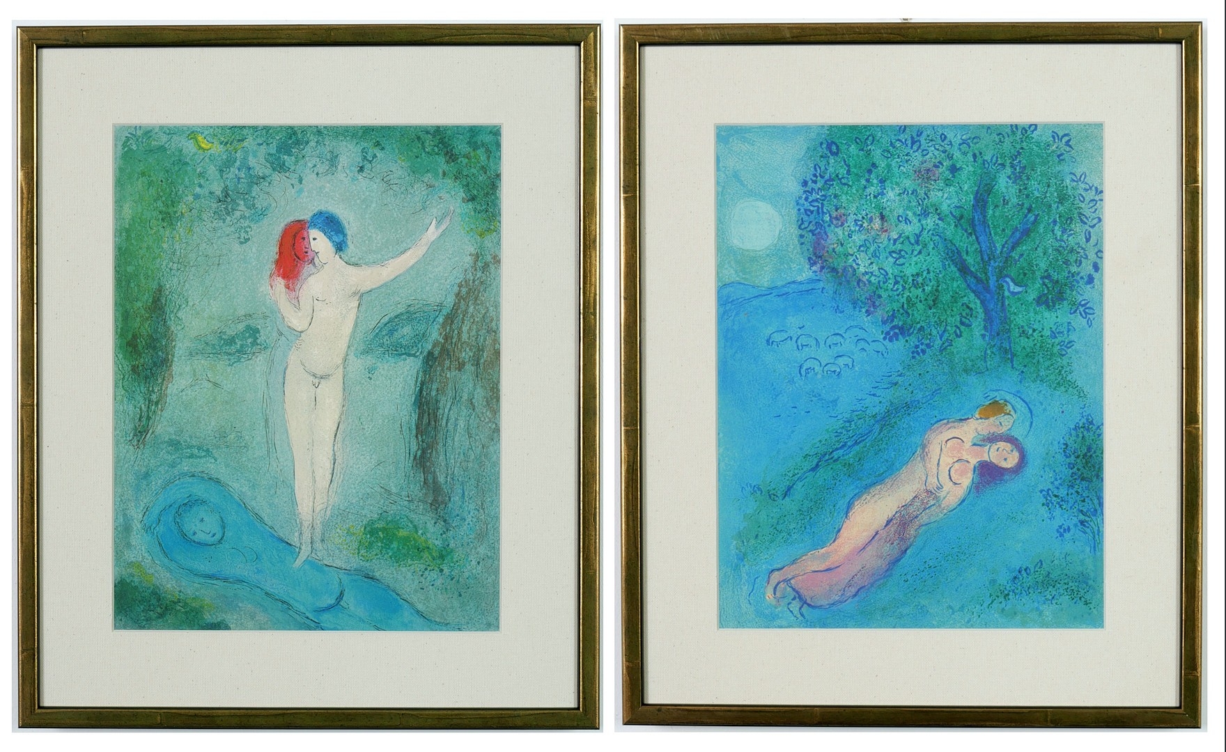AFTER MARC CHAGALL. 2 X OFFSET LITHOGRAPHS FROM DAPHNIS AND CHLOE. with linen mounts, 23cm x 30.5cm.