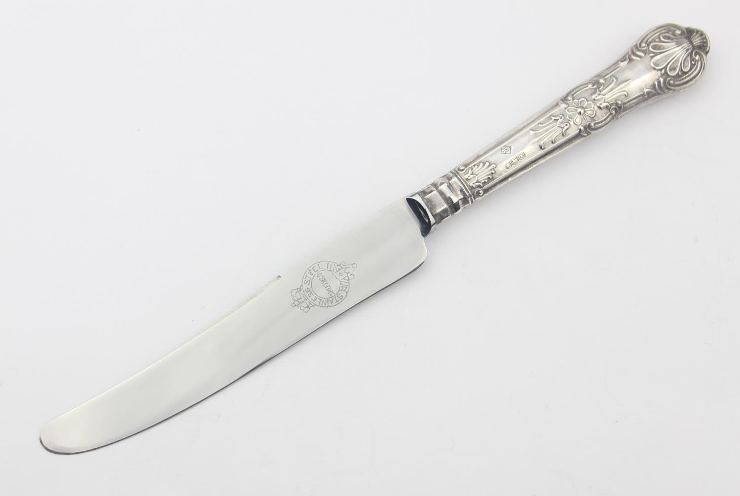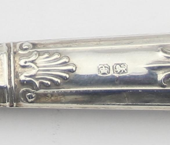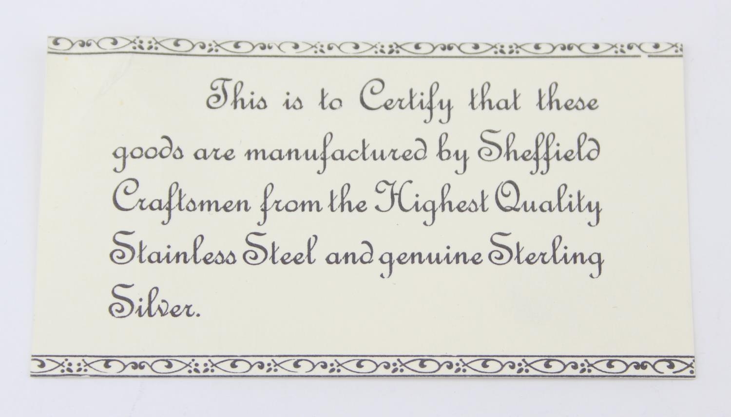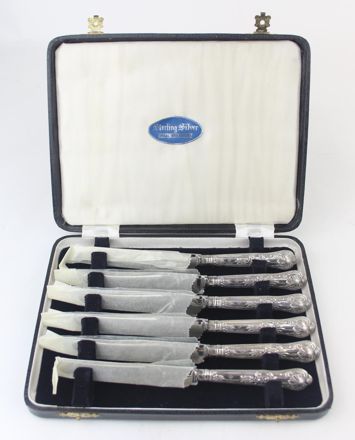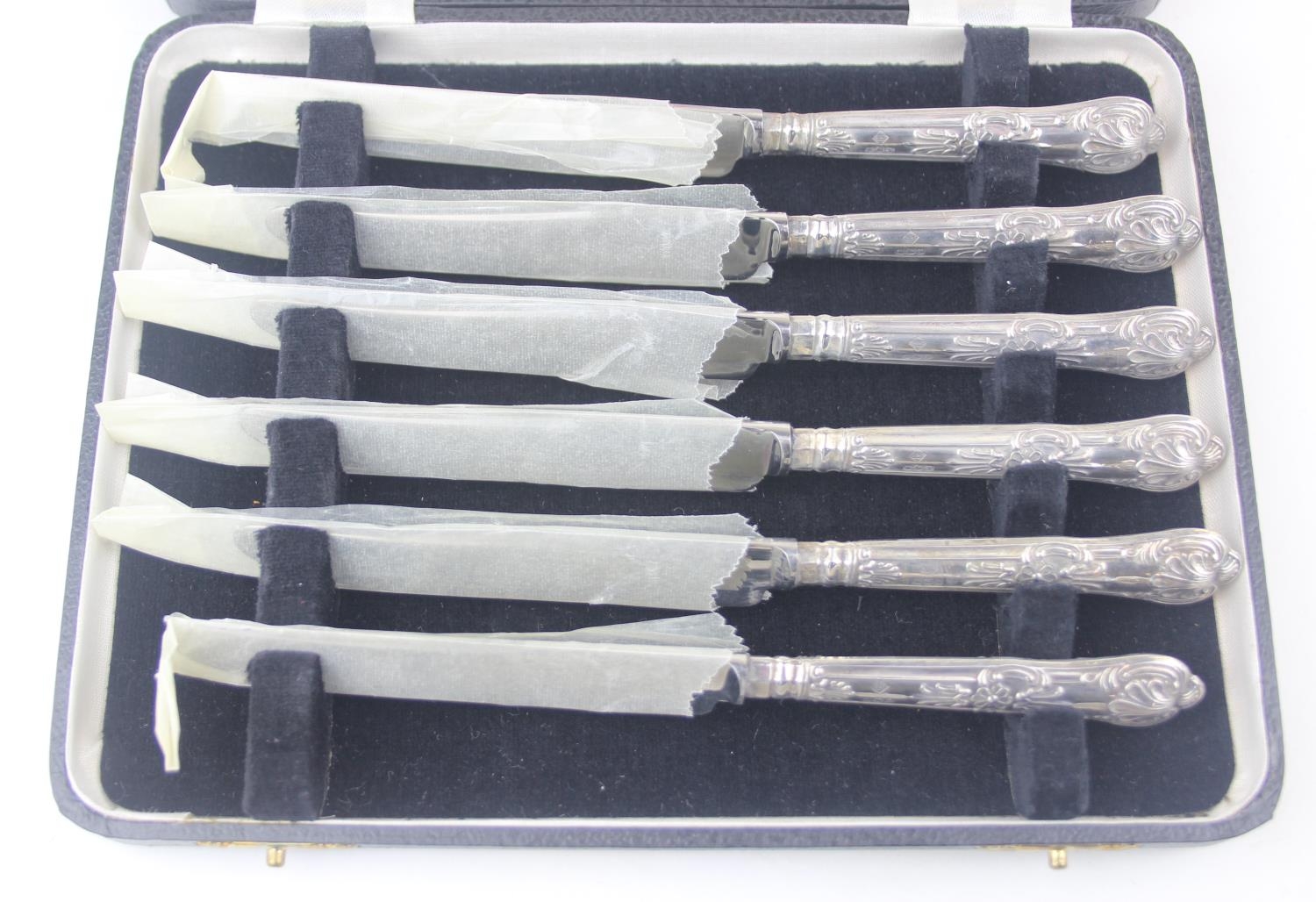 A boxed set of six silver handled butter knives, marked for Sheffield 1965 by Harrison Brothers, boxed with original paperwork, seemingly never used