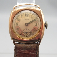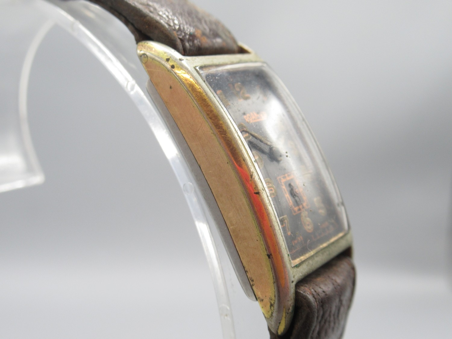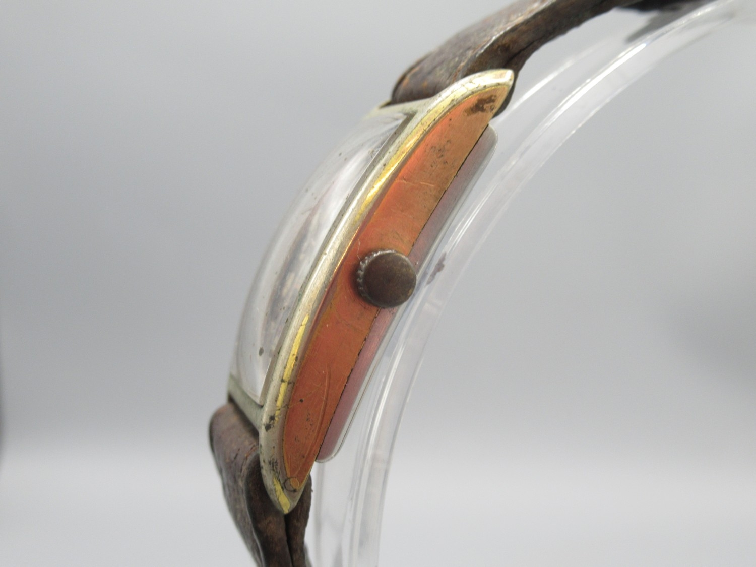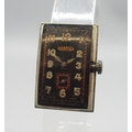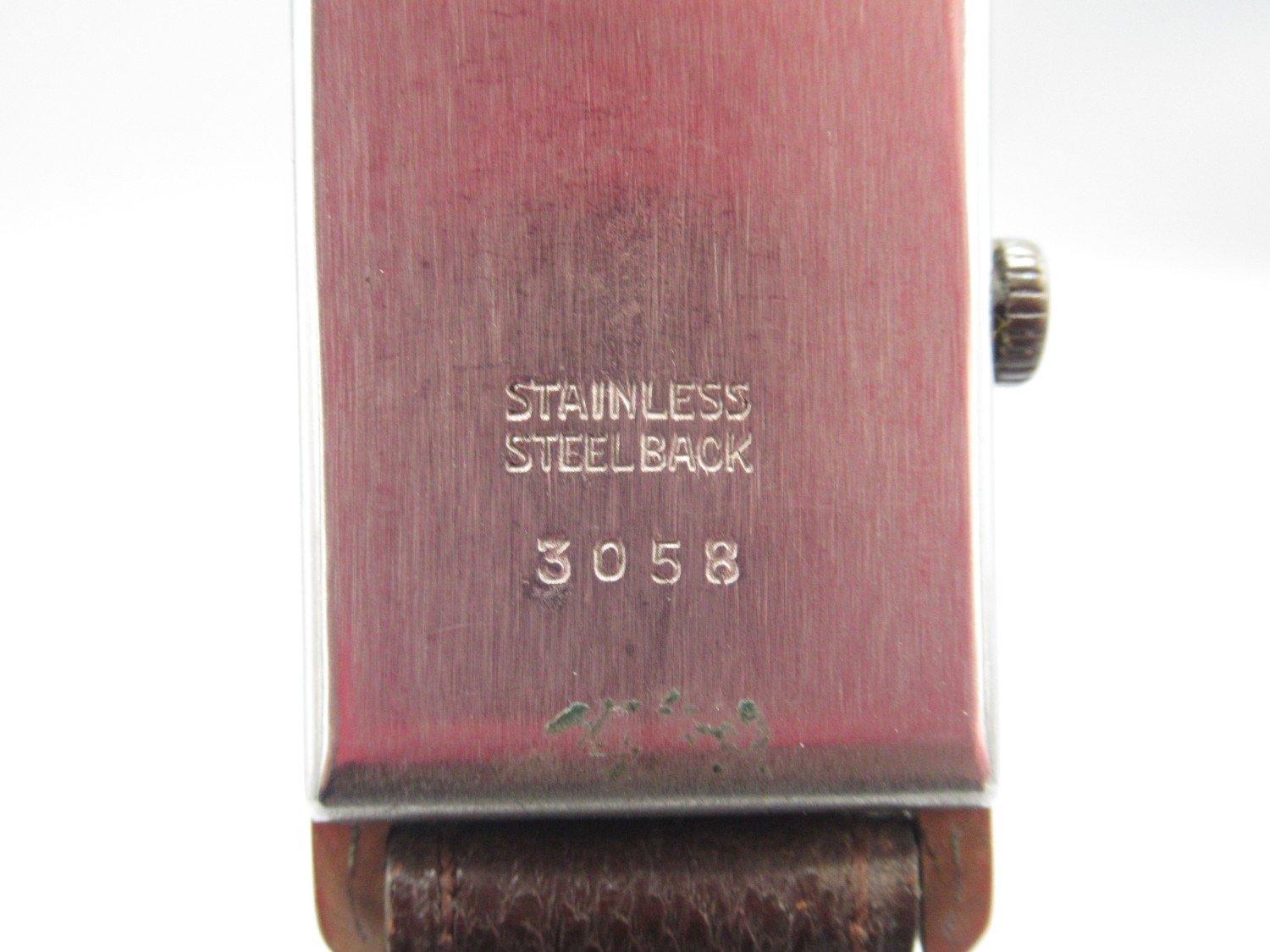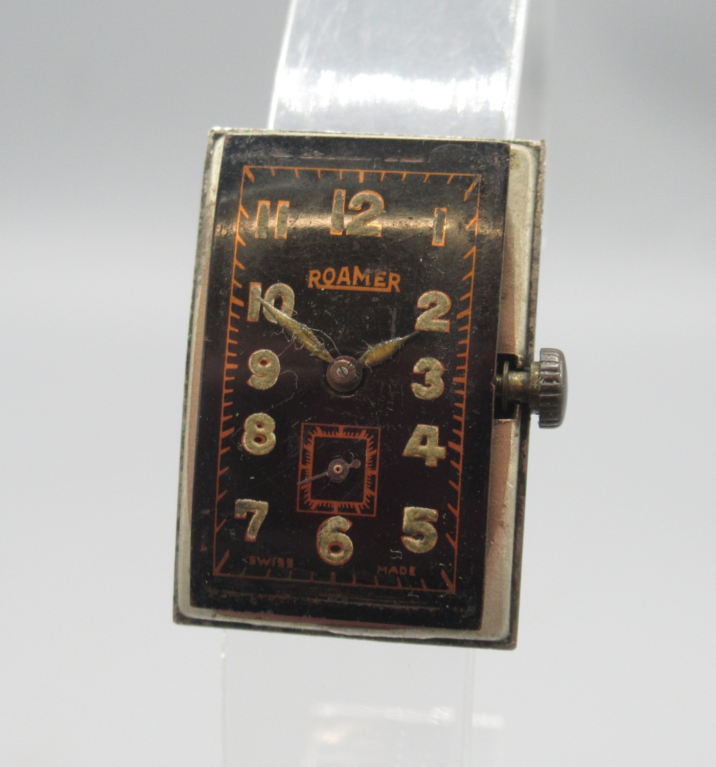 Roamer plated and stainless steel tank case wristwatch on period leather strap, signed black Arabic dial with subsidiary seconds, snap on case back no. 3058, Roamer 15 jewel movement, D19.5mm