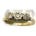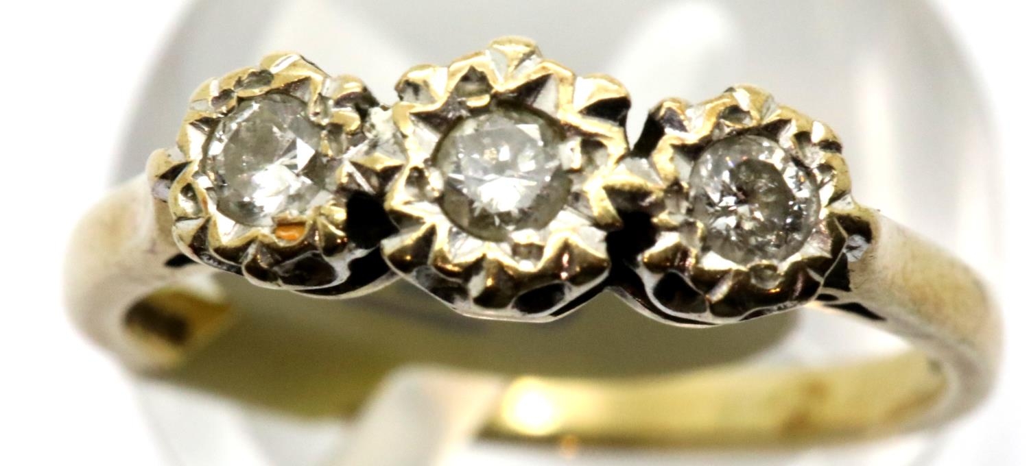 Ladies vintage 9ct gold three stone diamond ring, size O, 2.5g. P&P Group 1 (£14+VAT for the first lot and £1+VAT for subsequent lots)