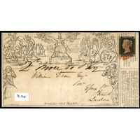 1840 1d Mulready envelope, Forme 1, Stereo A142, from Great Malvern to Northampton, neatly cancelled with a red MC. Â The reverse bears a superb Great Malvern cds for MY 10 1840, the first Sunday of use. Â Opens out very neatly for display. Â Very rare; BPA Certificate (19
