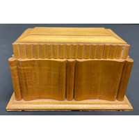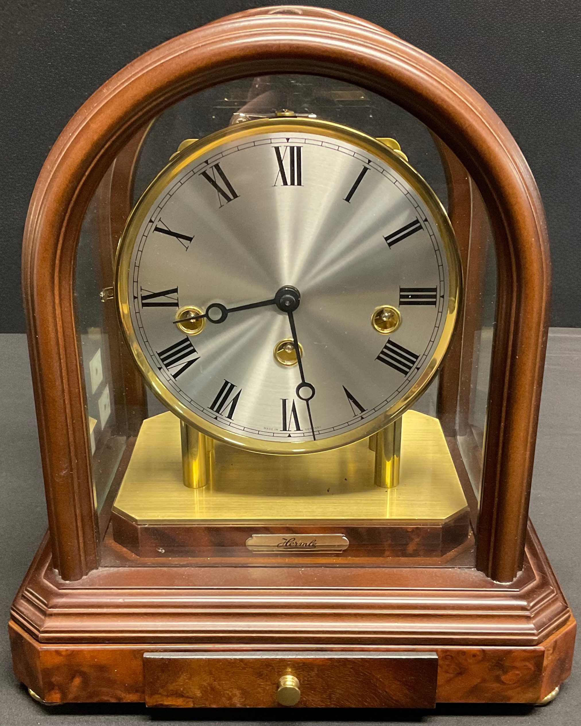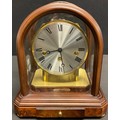 A Franz Hermle part skeleton mantel clock, the arch topped glass case enclosing a silvered circular dial inscribed with Roman numerals, visible escapement and chiming movement striking on four bells, brass bun feet, 28cm high