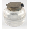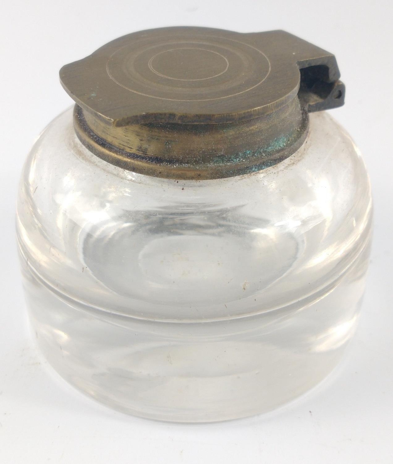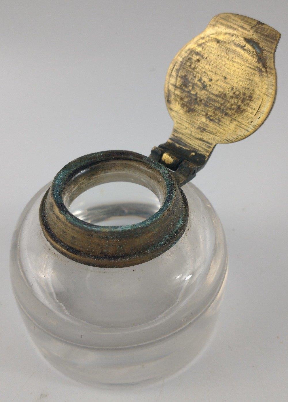 Vintage GLASS INK WELL with brass lid. An object with some weight to it.