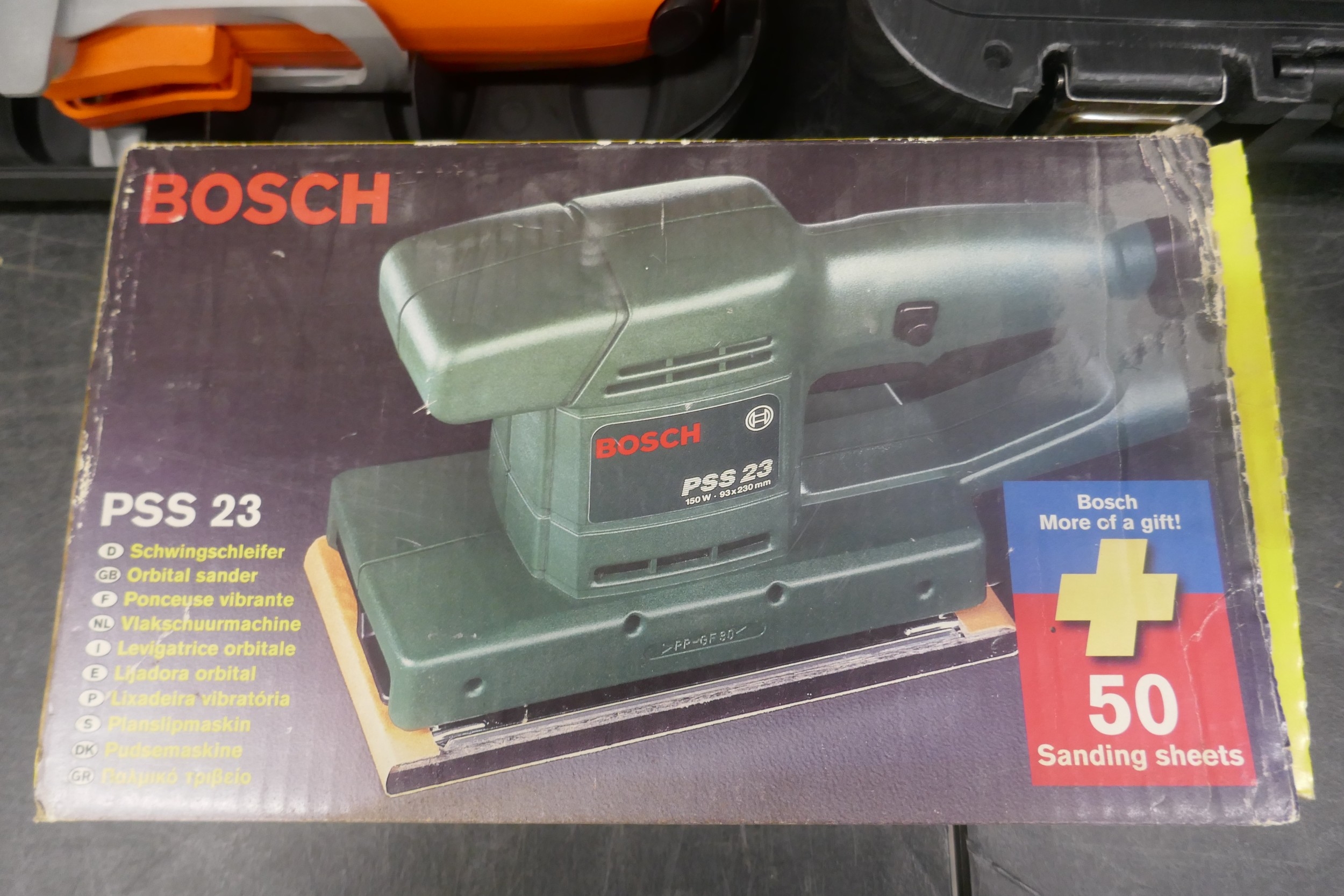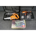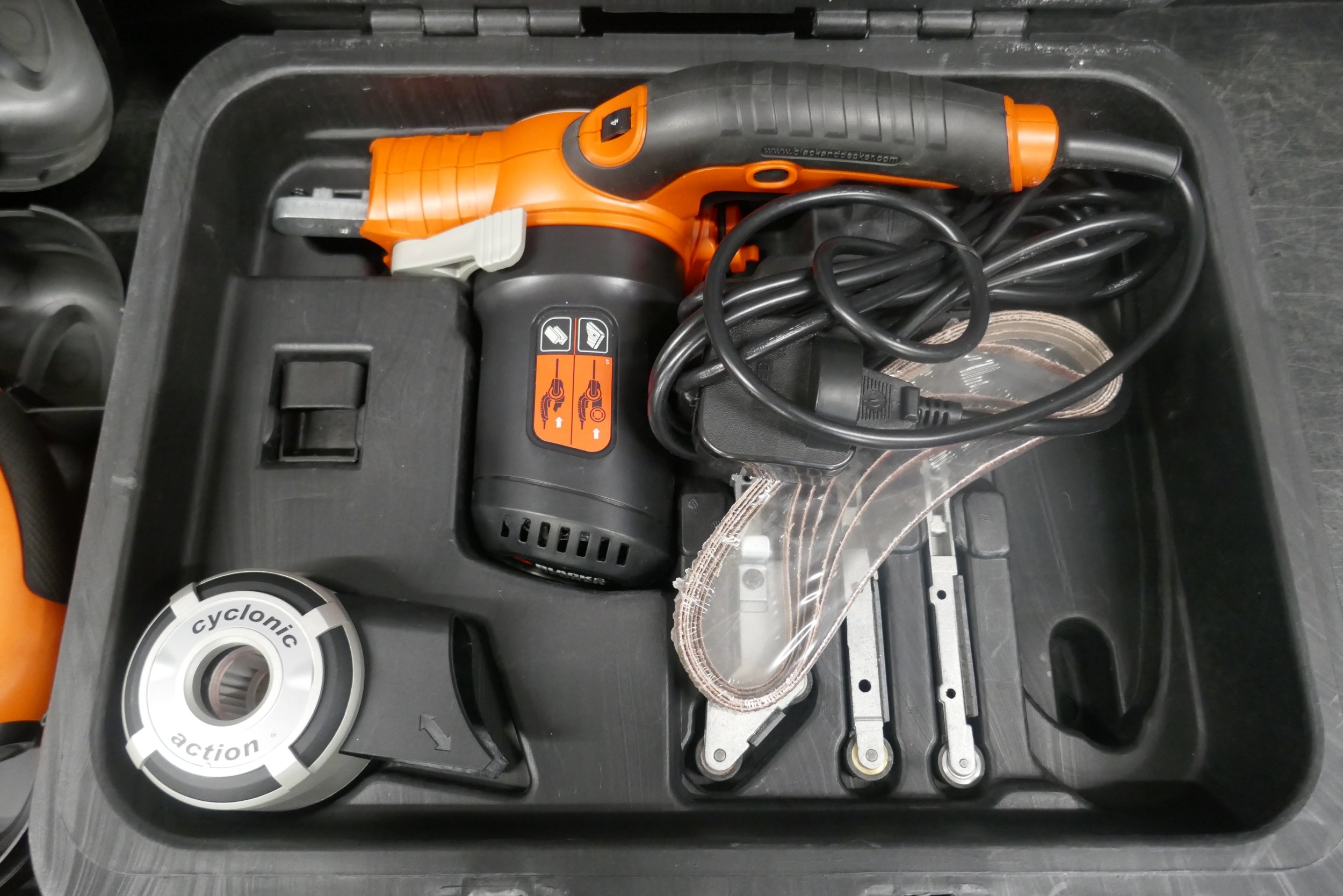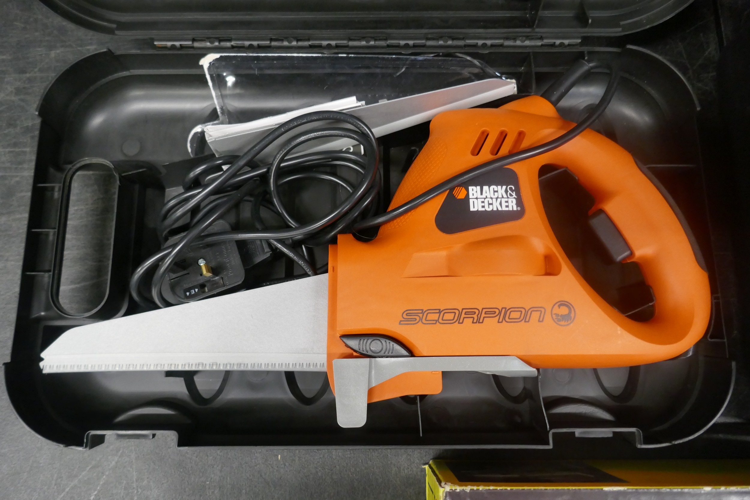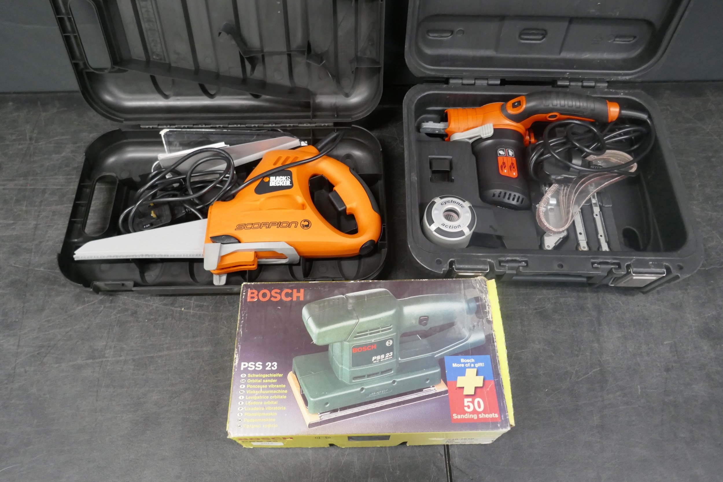 A Black and Decker Scorpion 240 saw, a Black and Decker KA902E mini belt sander and a Bosch PSS 23, 230V orbital sander
