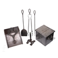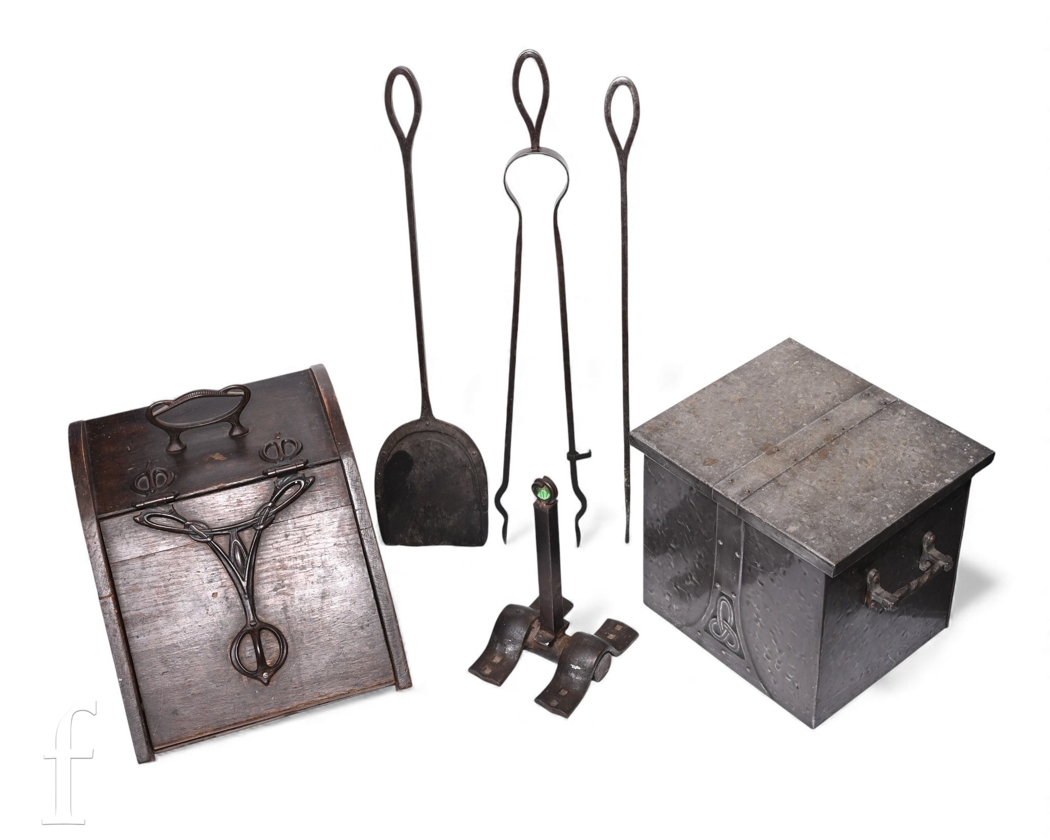 An Arts & Crafts pewter coal bin, an oak coal scuttle, a wrought iron fire dog and a set of three wrought iron fire tools. (6)