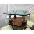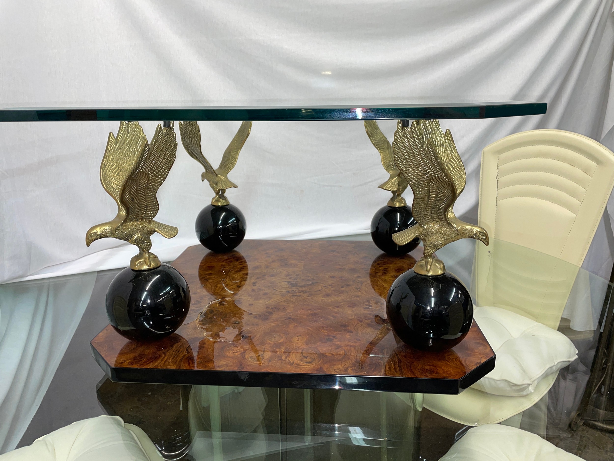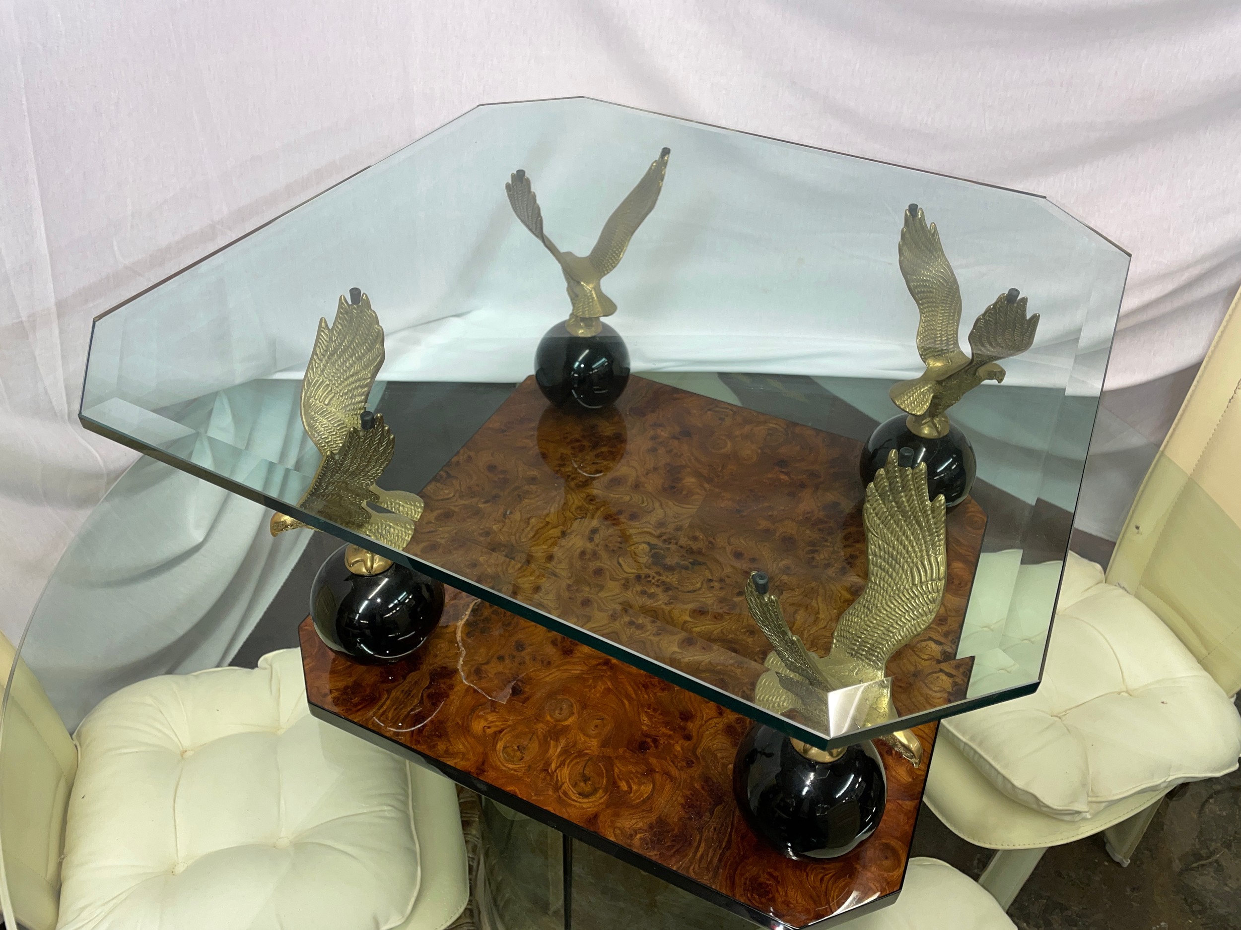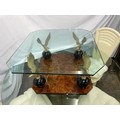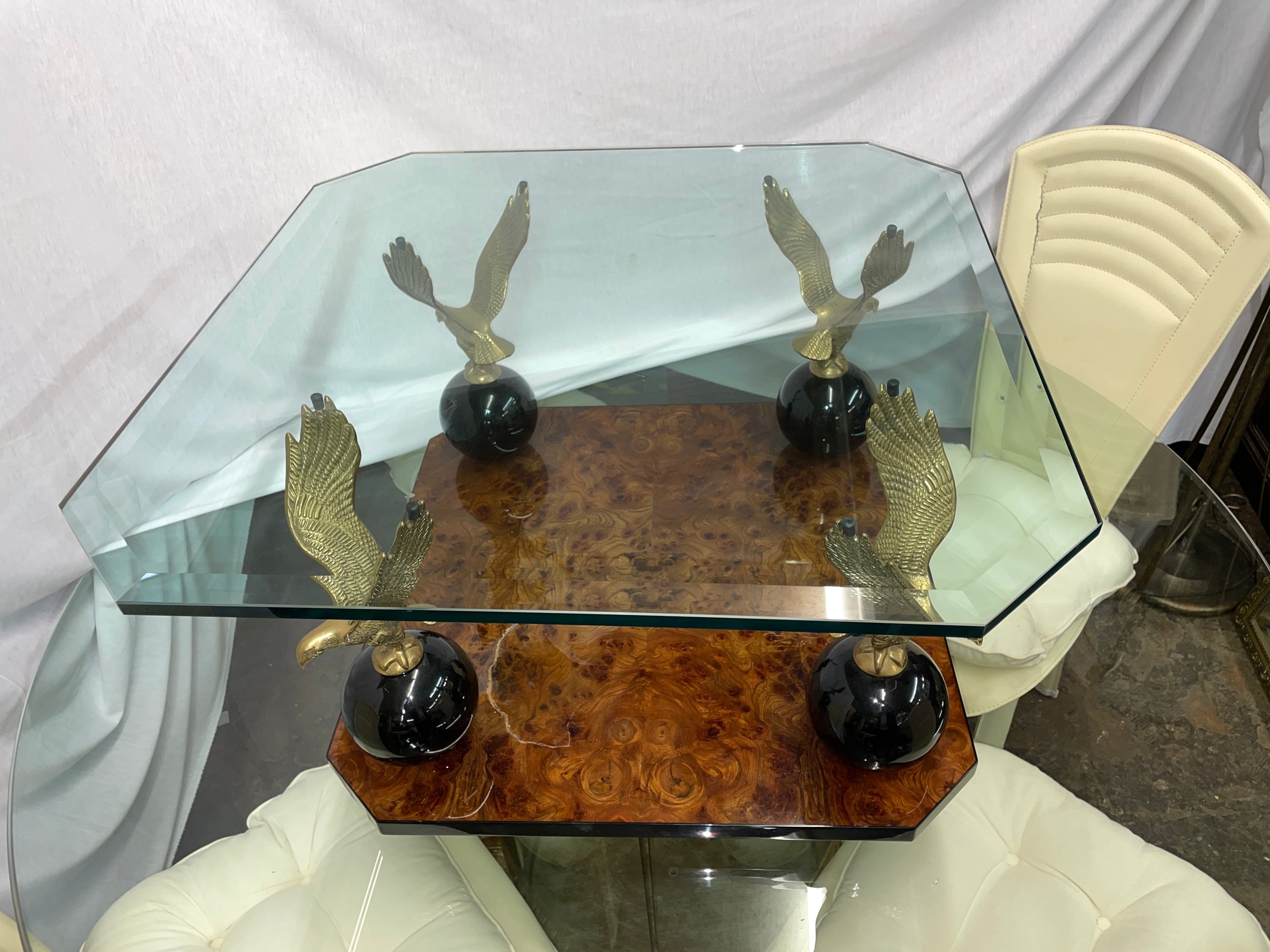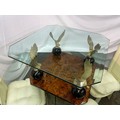 BURR WALNUT AND BEVELLED CUT GLASS COFFEE TABLE ON BRASS SPREAD EAGLE AND BALL SUPPORTS
