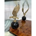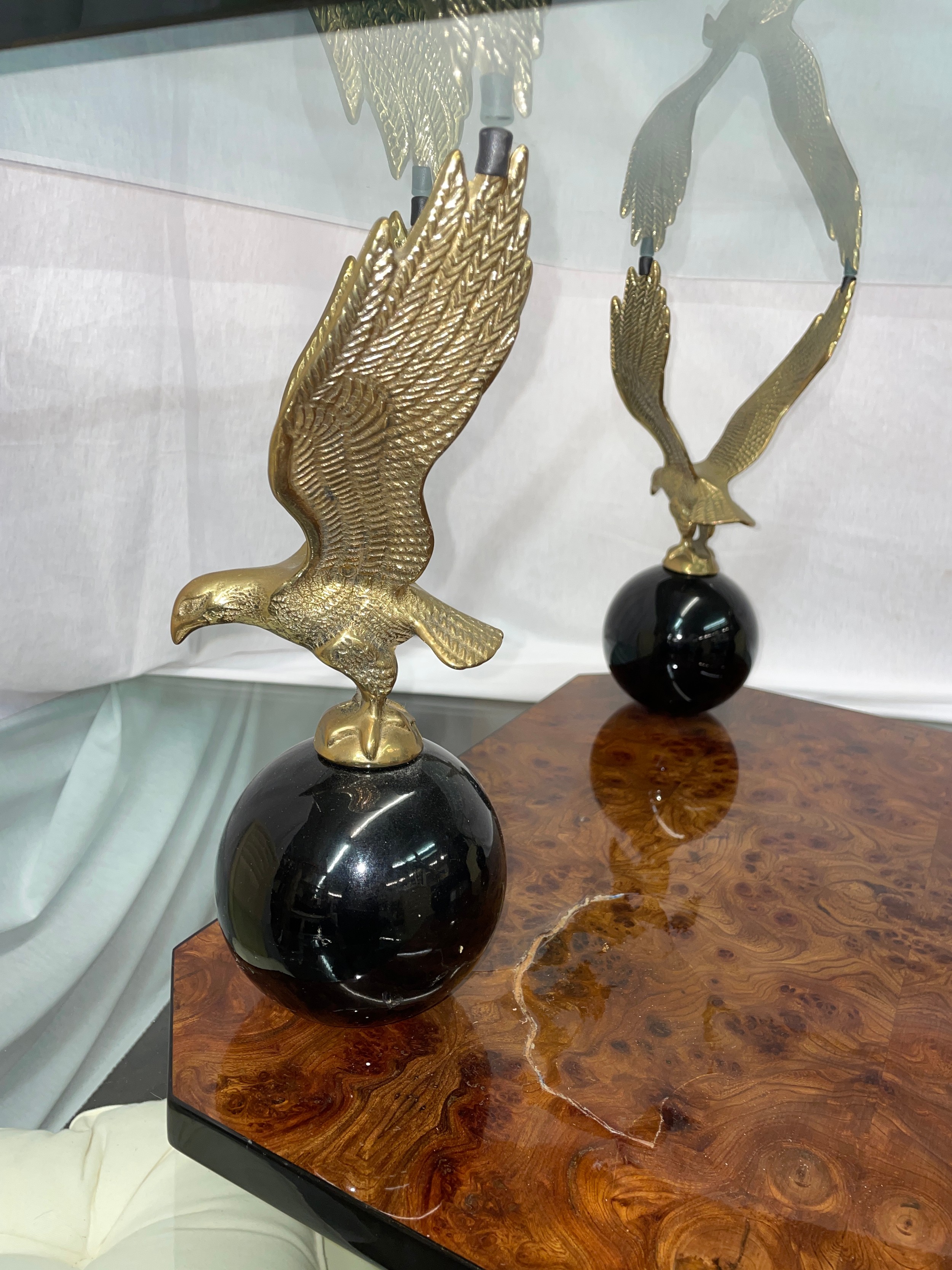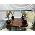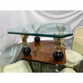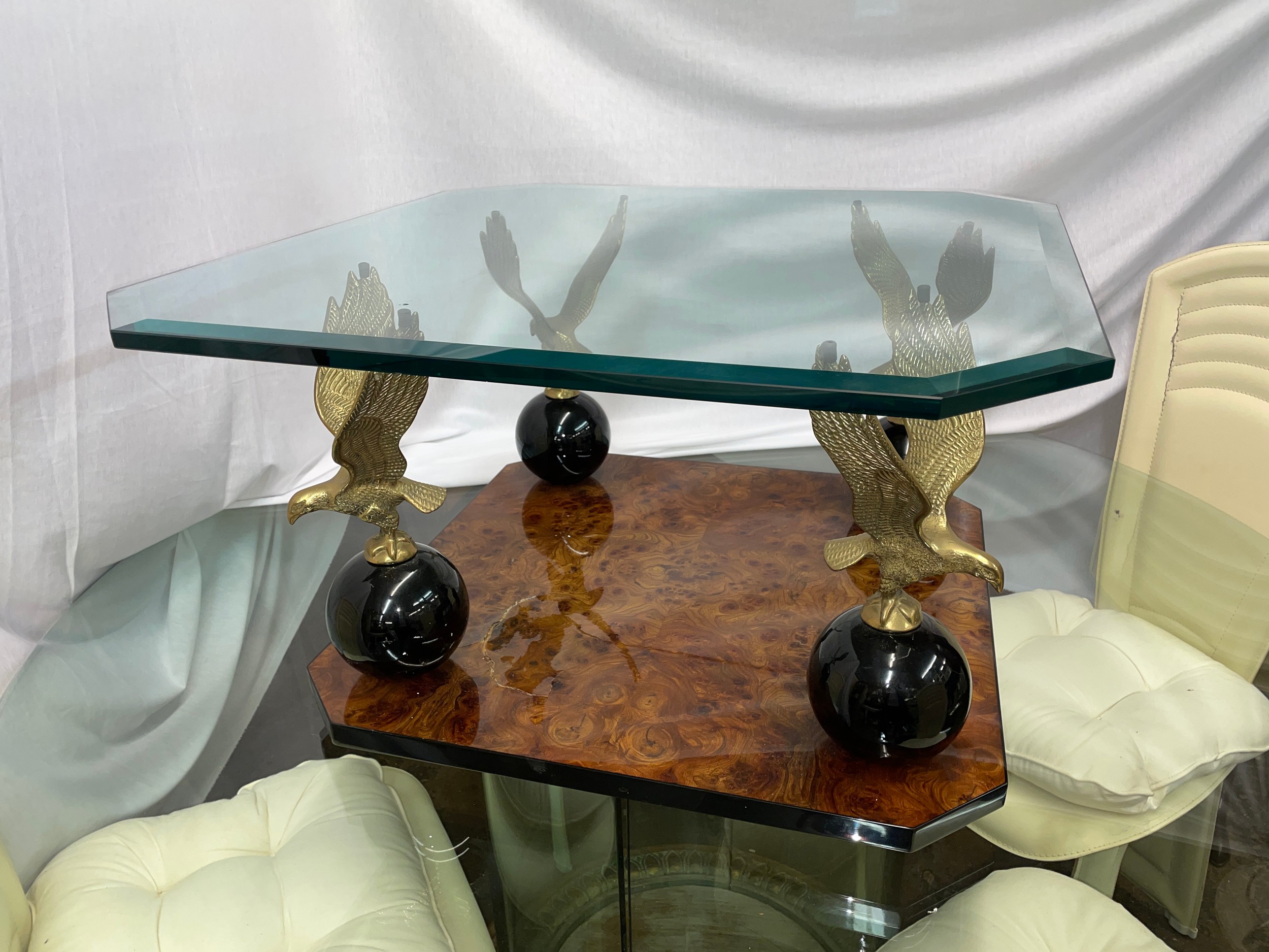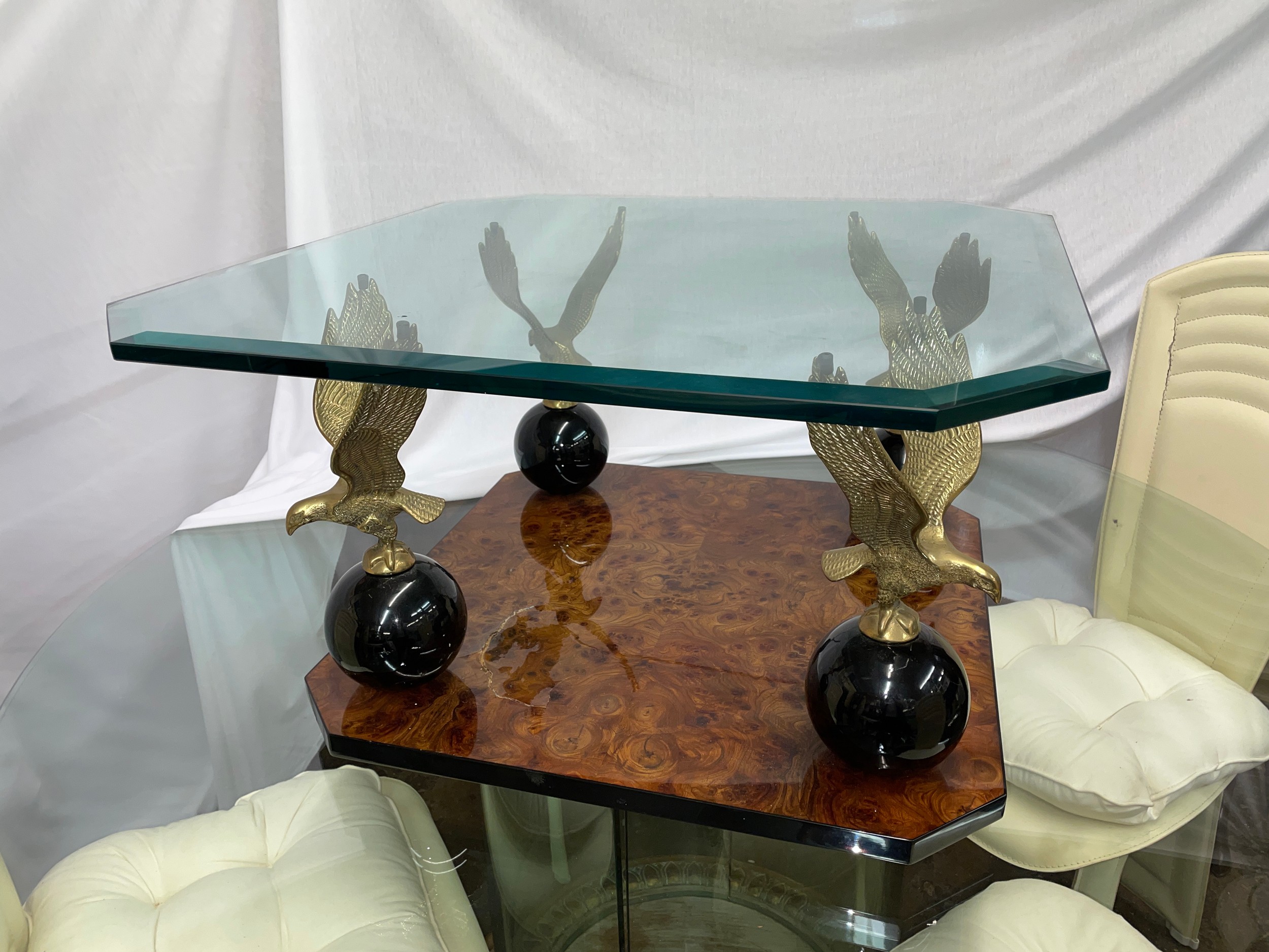 BURR WALNUT AND BEVELLED CUT GLASS COFFEE TABLE ON BRASS SPREAD EAGLE AND BALL SUPPORTS