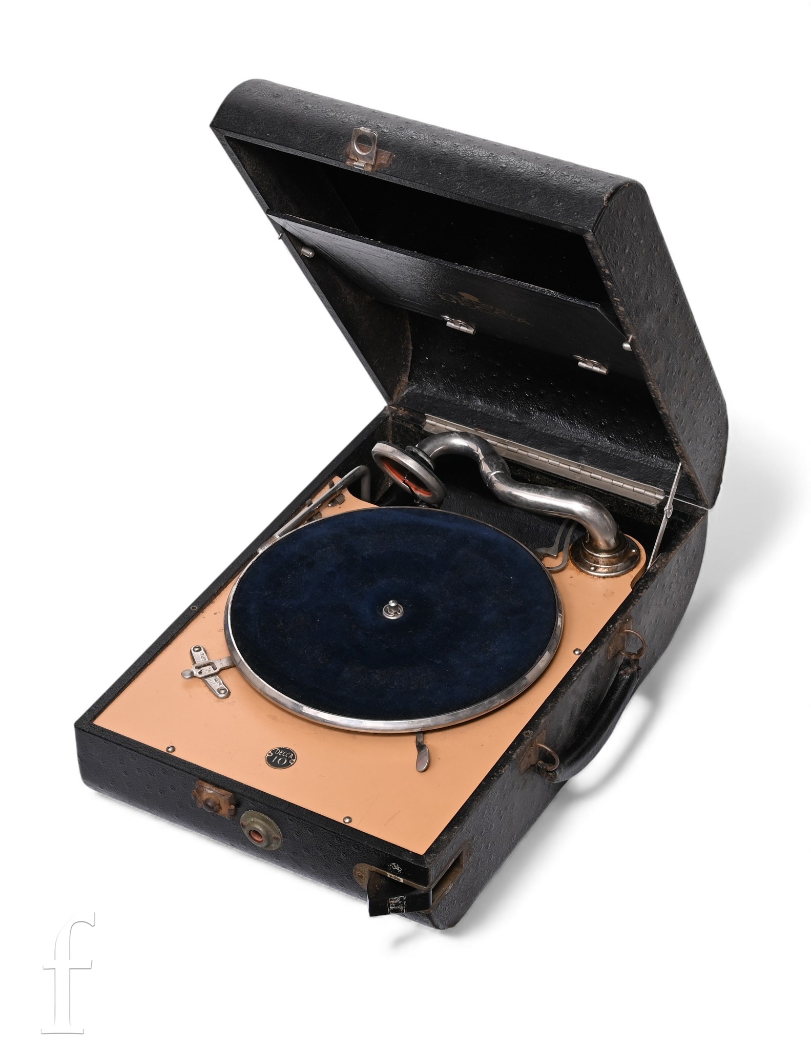 A Decca 10 portable wind up gramophone in black leather finish case, width 29cm.