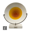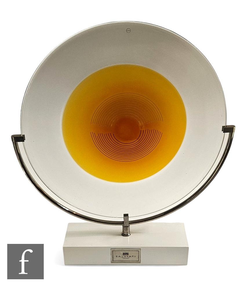 Francesco Lucchese - Salviati - A large early 21st Century limited edition Salviati glass charger designed by Francesco Lucchese in 2002, the circular plaque with a central deep orange incalmo roundel decorated with fine semi circular white lines, the whole mounted to a stainless steel display frame mounted to a white block with Salviati plaque, plaque diameter 56cm.