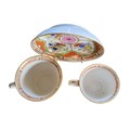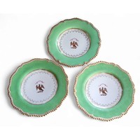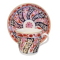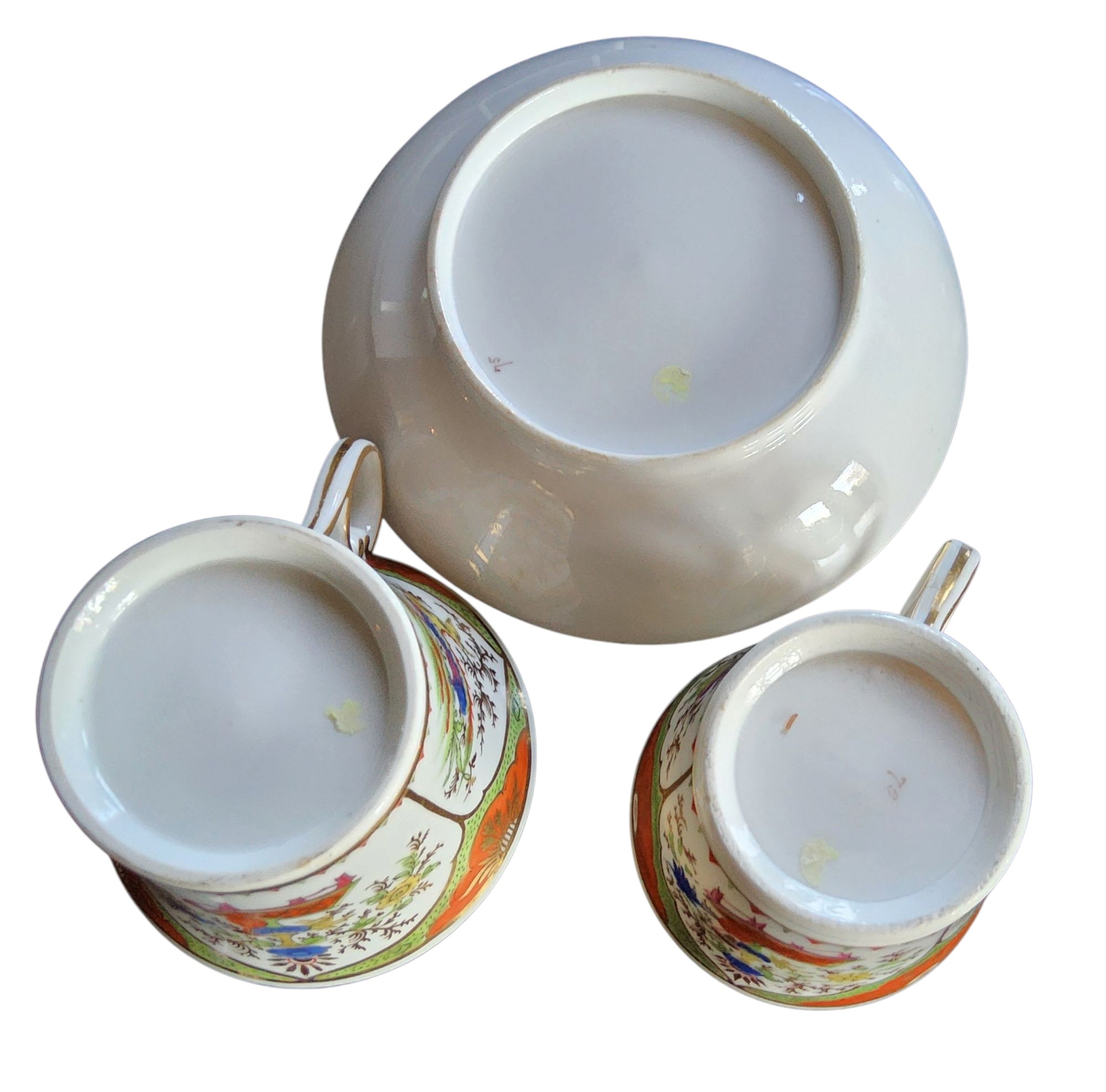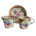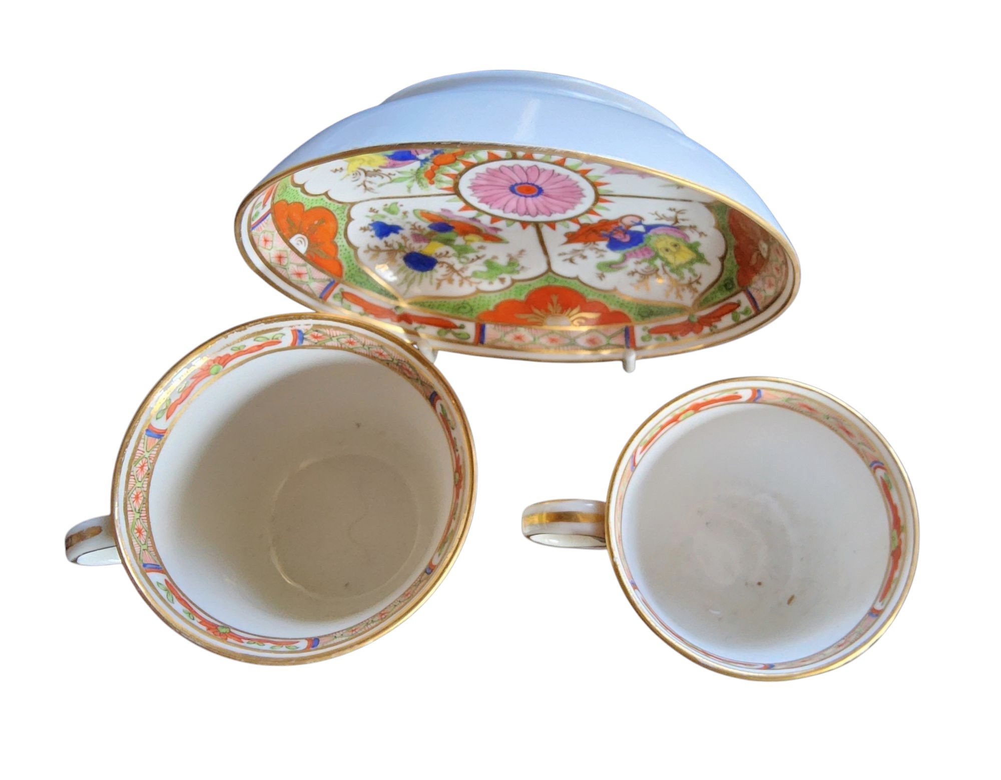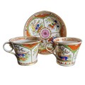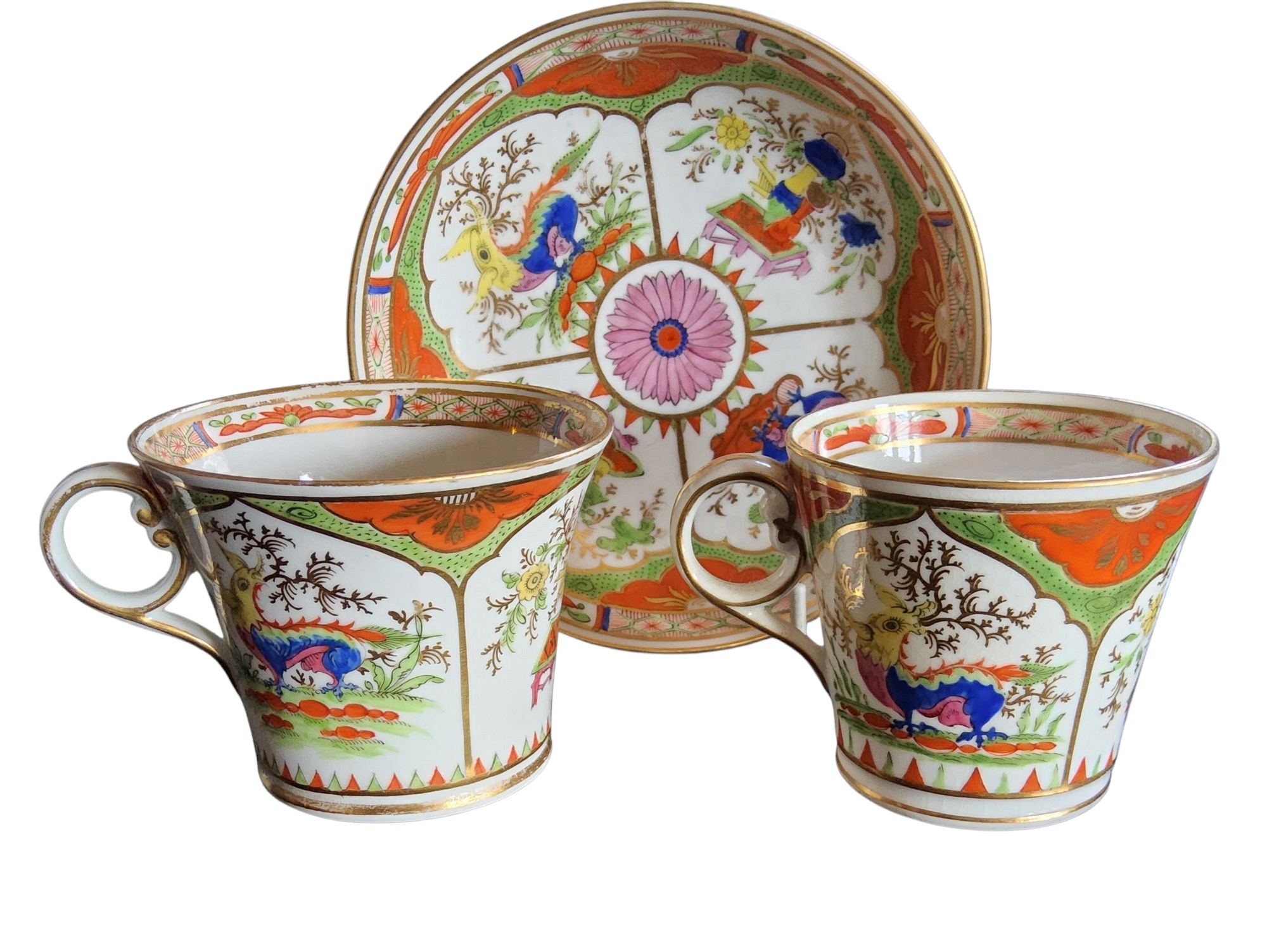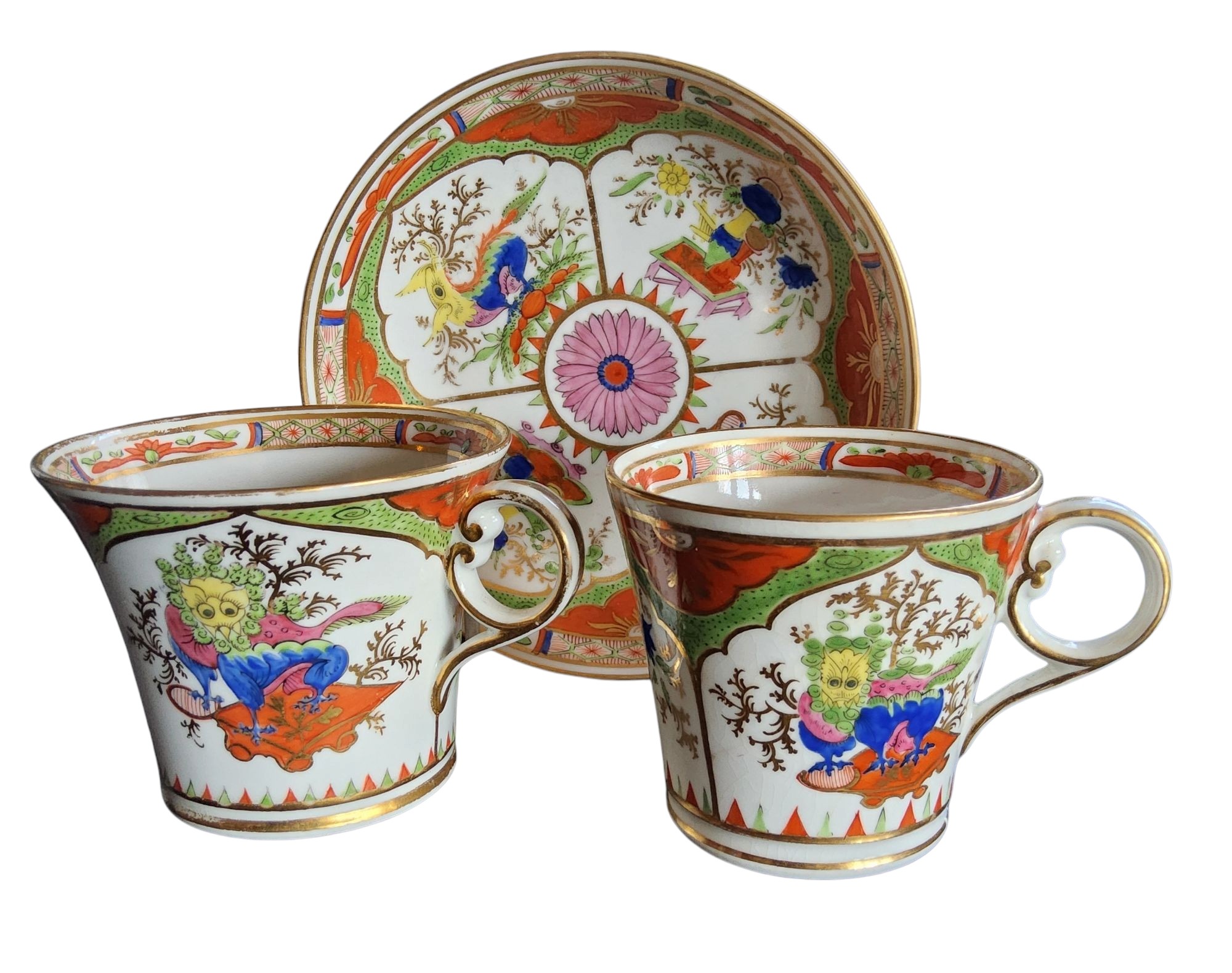 A Chamberlain Worcester Dragon in Compartments pattern teacup, coffee cup and saucer, coloured in the famille verte palette with alternating panels of Chinese dragons and precious objects, pattern 75 in gold