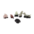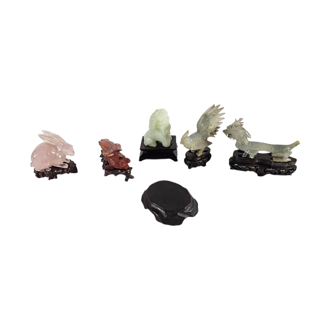 Comprising a pale celadon jade style dragon and rooster on fitted hardwood stands, a rose quartz rabbit, a carnelian style agate koi fish on a rootwood base, and a pale green stone Foo dog, late 19th/20th Century.