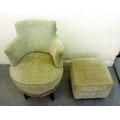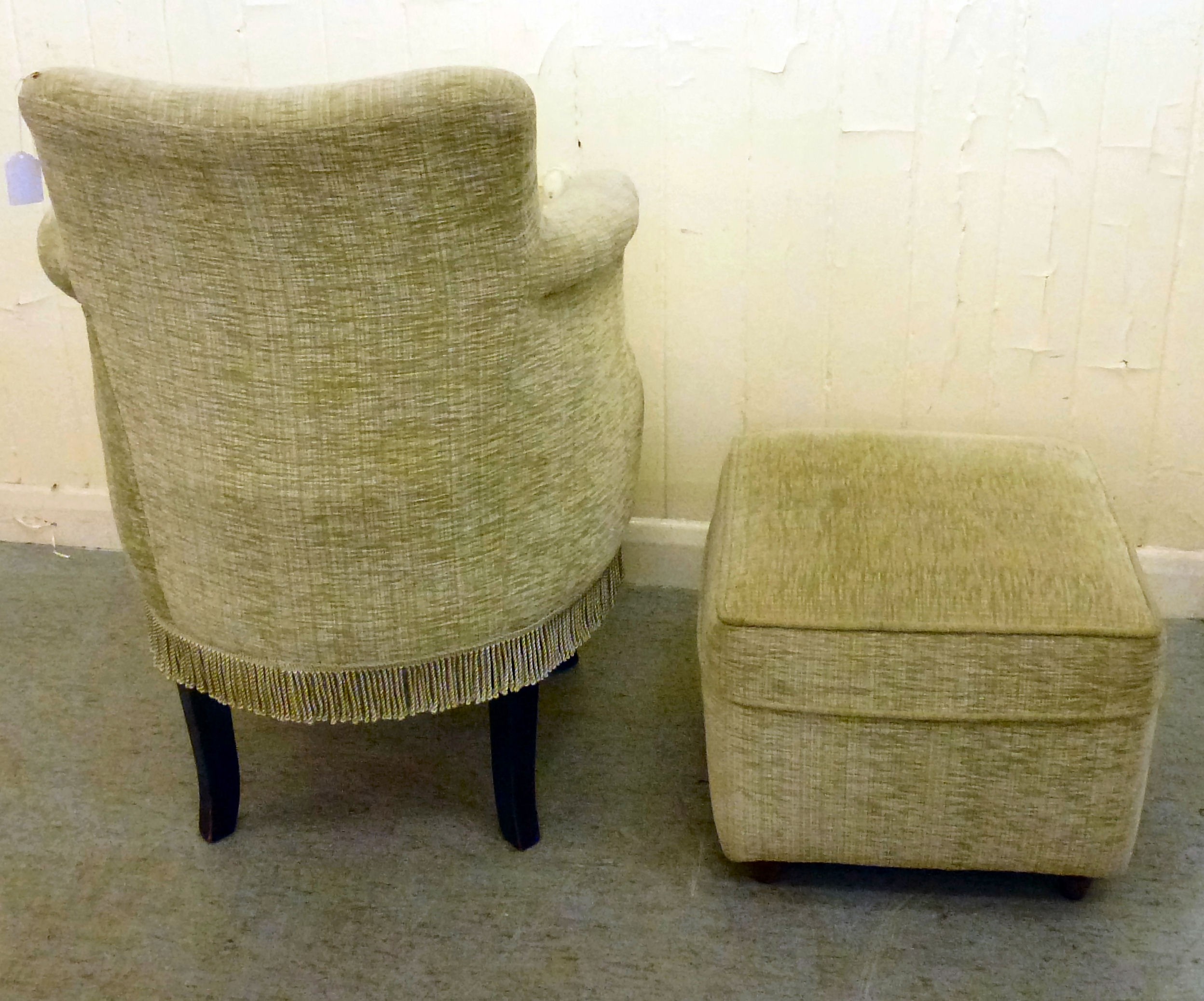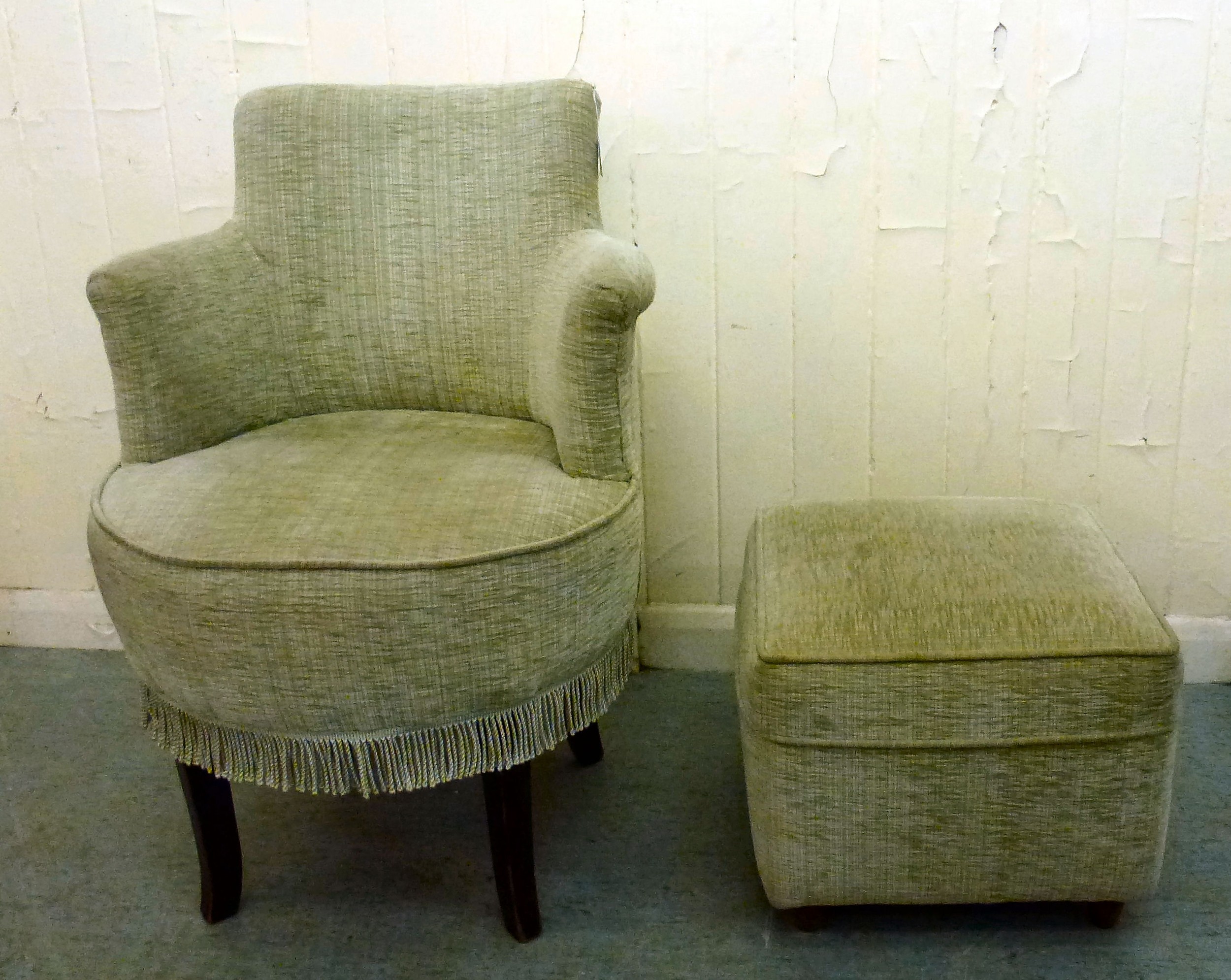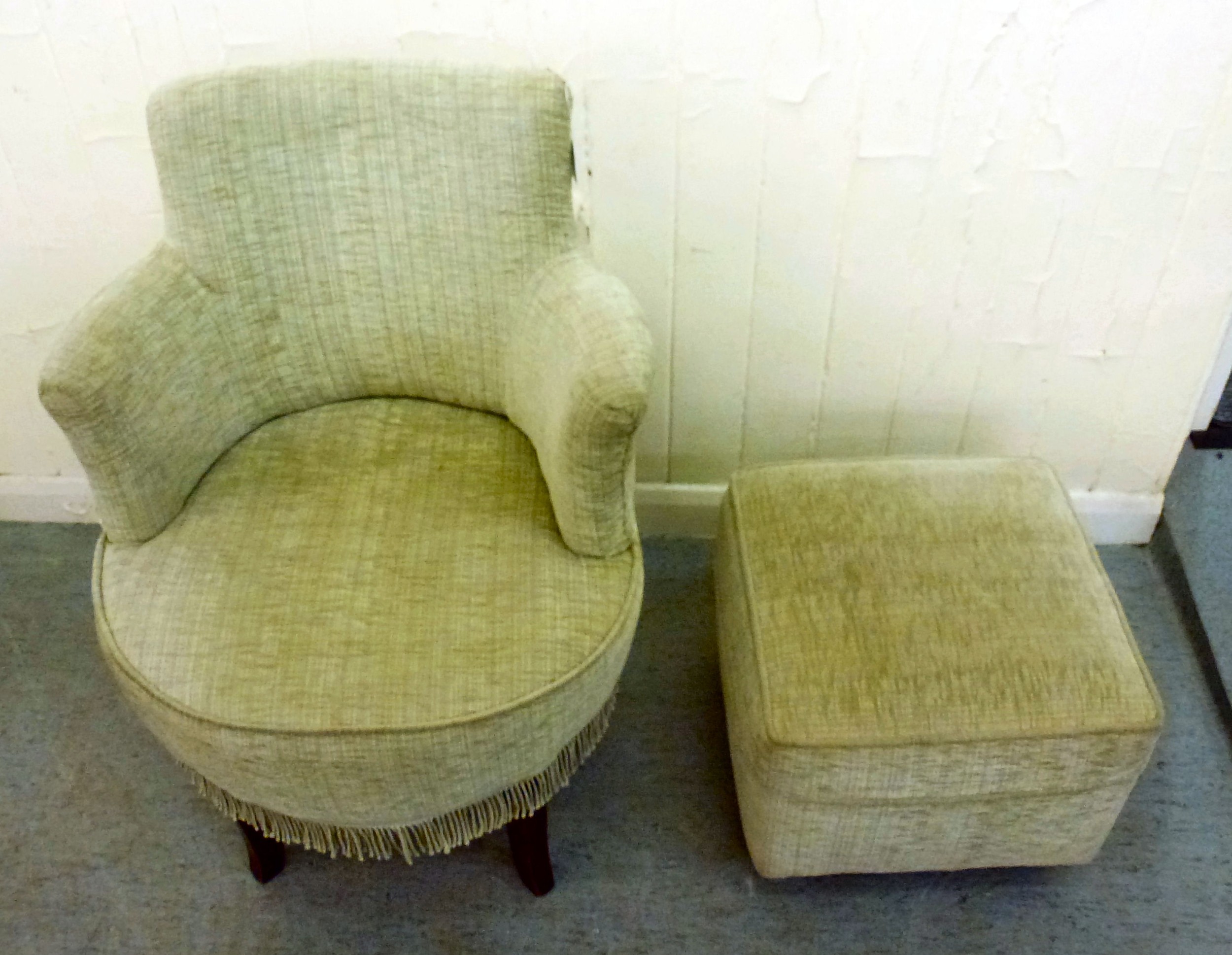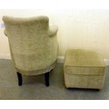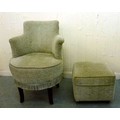 A modern bedroom chair and matching stool, upholstered in beige fabric, raised on splayed legs