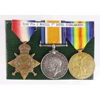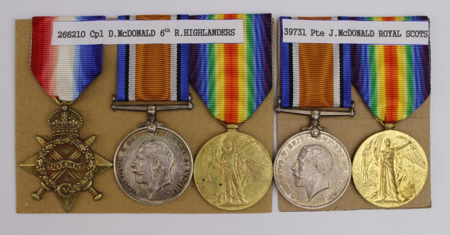 1915 Star Trio to 3511 Pte D McDonald R.Highlanders. Served with 6th Bn. With a BWM & Victory Medal to 39731 Pte J McDonald R.Scots. (3+2)