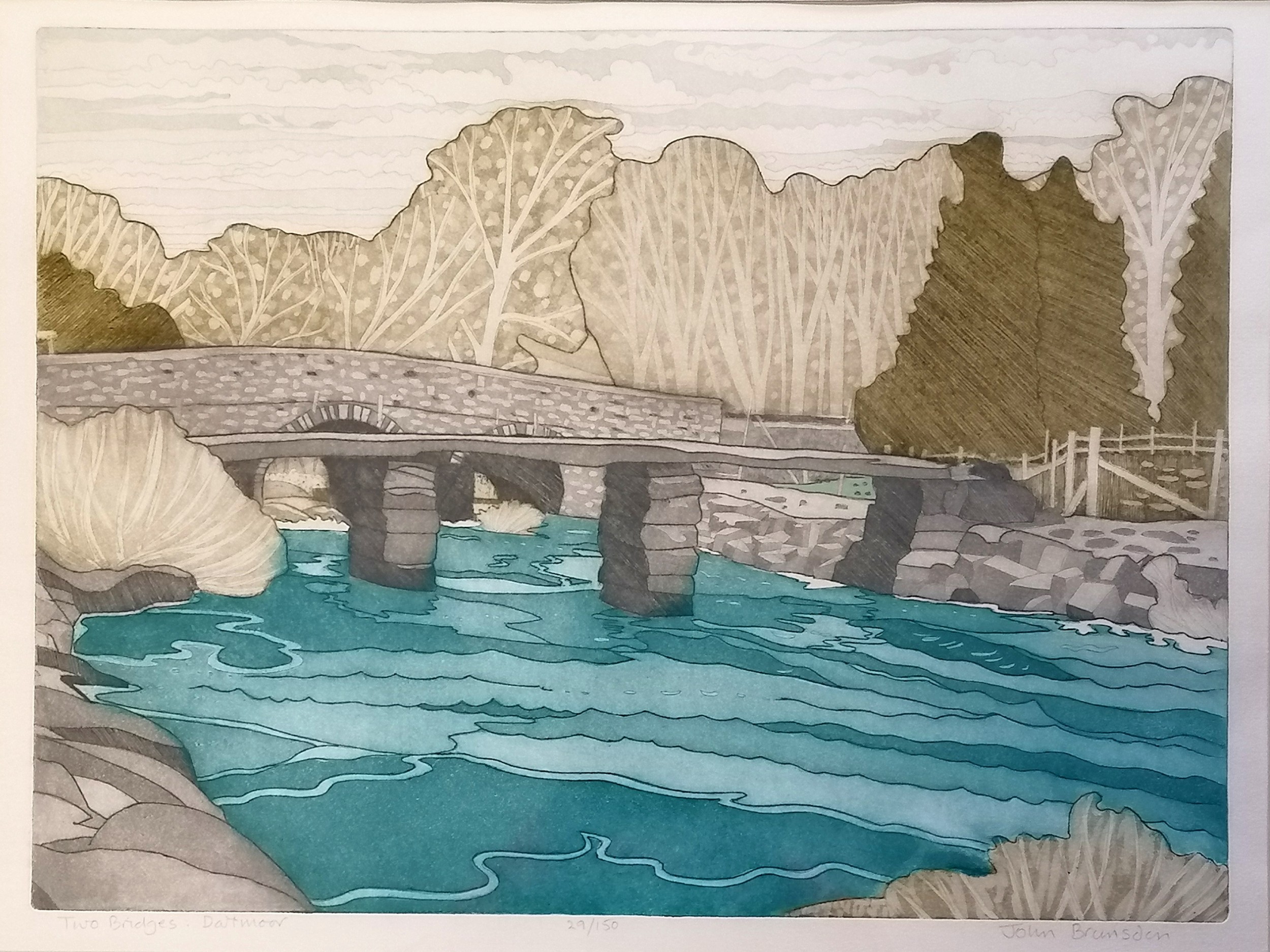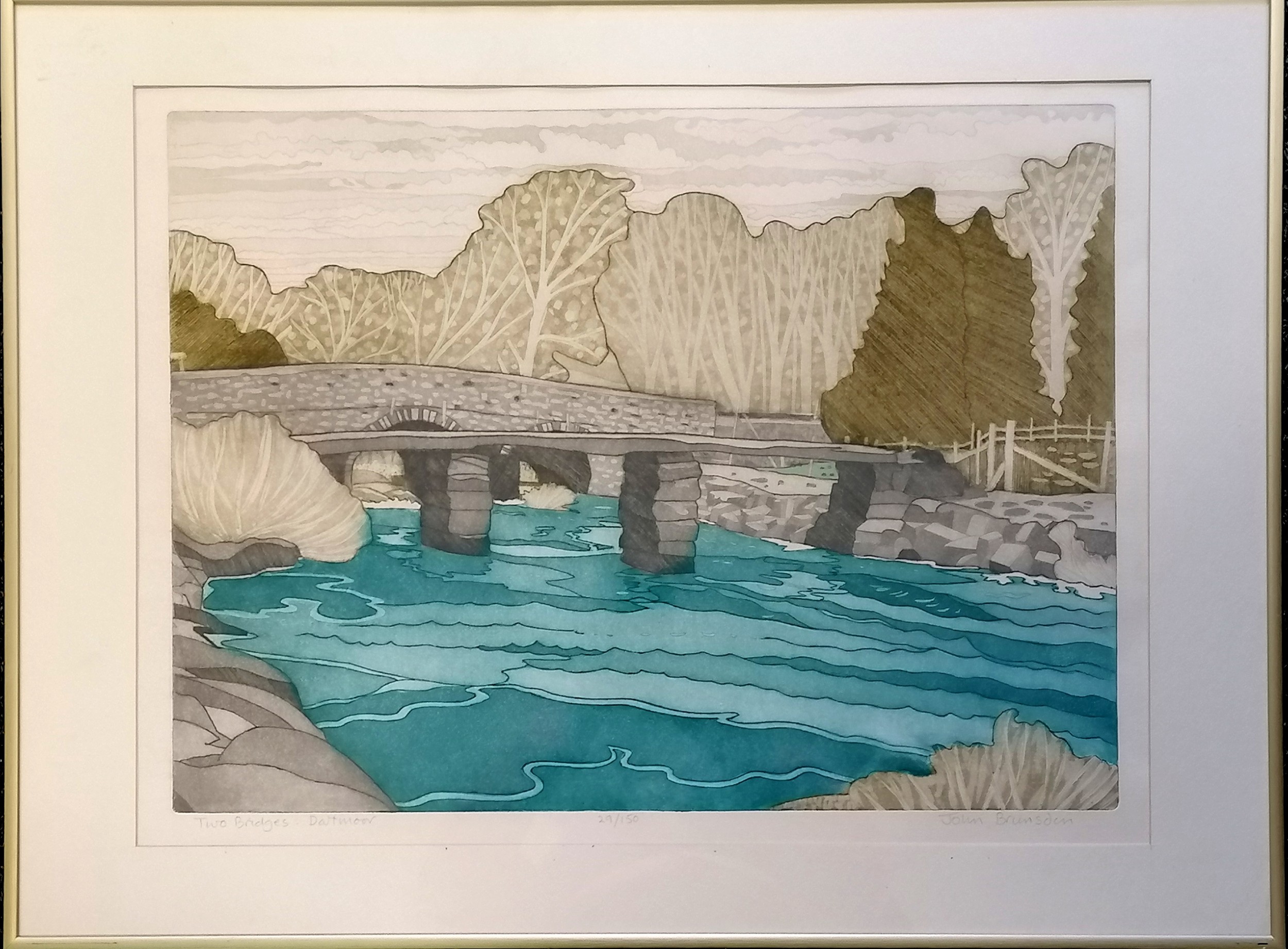 John Brunsdon (1933-2014) signed engraving of 'Two bridges : Dartmoor' from a ltd ed of 150 - frame 61cm x 81cm