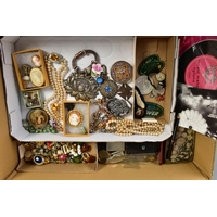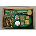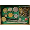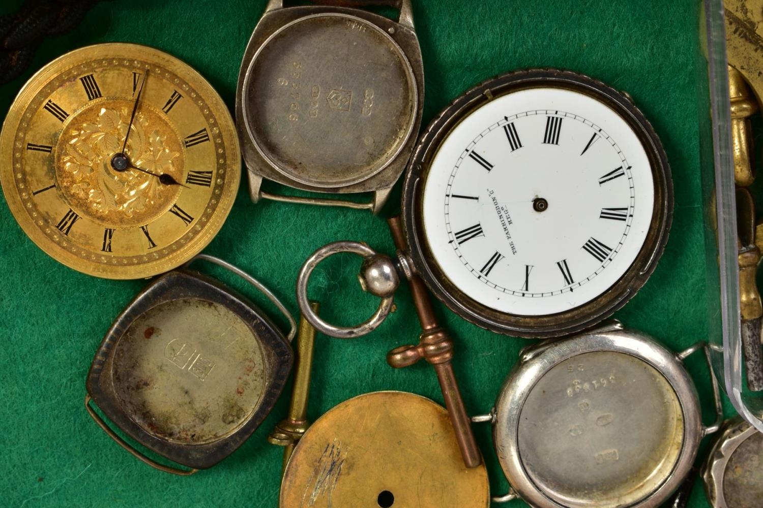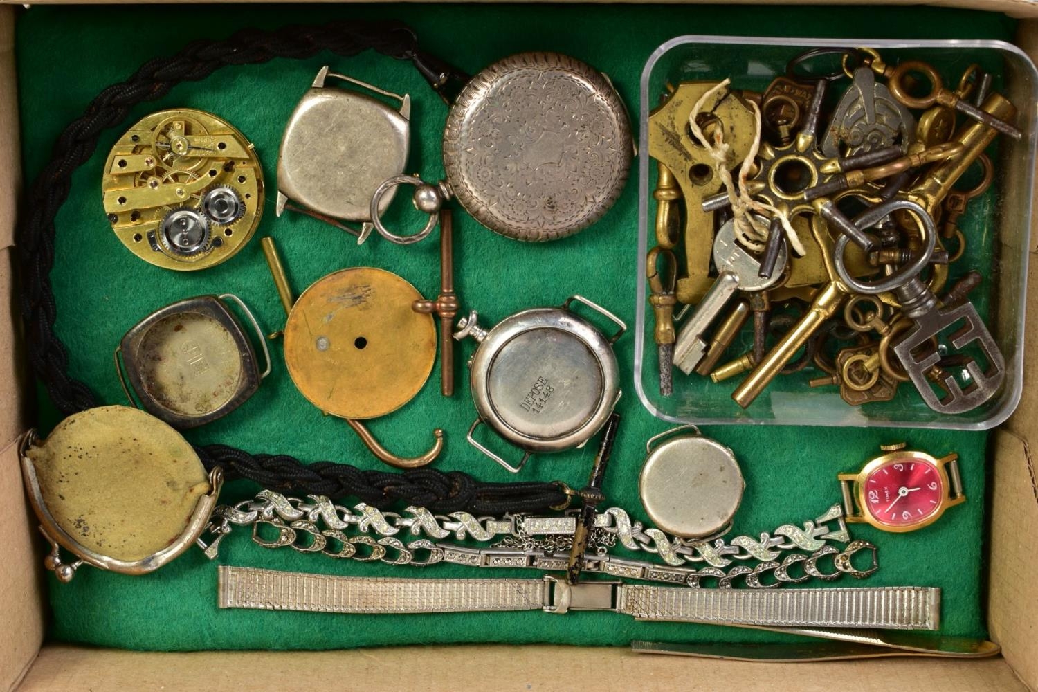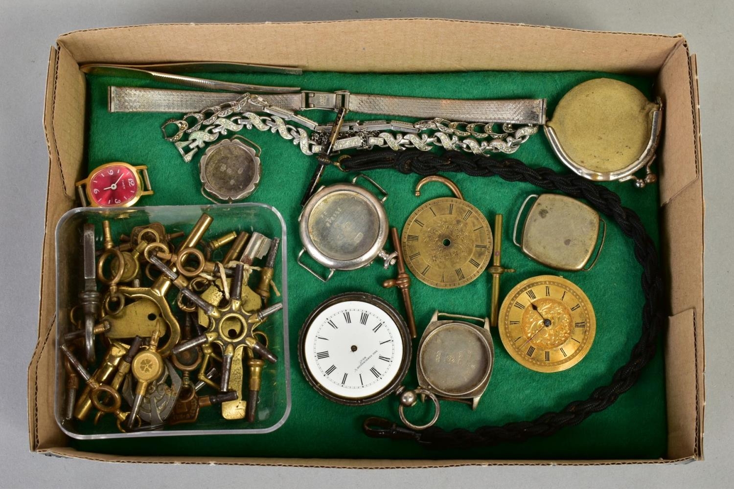A SELECTION OF WATCH CASES, WATCH BRACELETS AND WATCH KEYS, to include five silver watch cases, three watch bracelets such as a marcasite openwork bracelet, a black rope twist Albert, a watch pouch, two loose T-bars, together with a small box of assorted watch keys