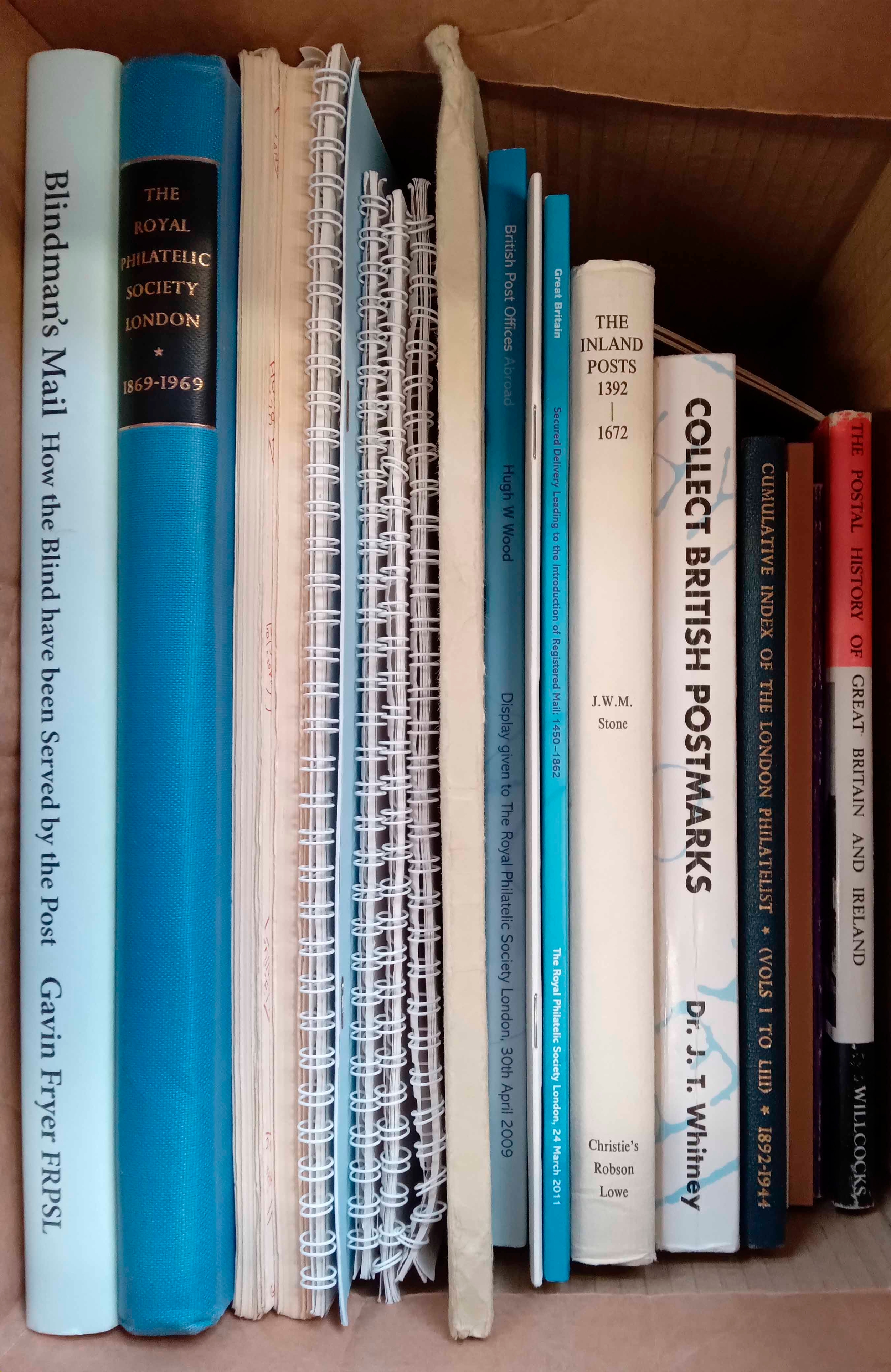 POSTAL HISTORY, POSTMARKS, INDEXES, ETC.: Carton containing Blindmans Mail by Fryer; The Inland Posts 1392-1672 by Stone; The Postal History of G.B. & Ireland by Willcocks; The Royal Philatelic Society London 1869-1969, plus cumulative indexes for the London Philatelist 1-53 & 1-77, and several display hand books; plus a few books on Special Event & Slogan Postmarks by Pearson. (20) Cross Reference: GREAT BRITAIN, CANCELLATIONS, POSTAL HISTORY