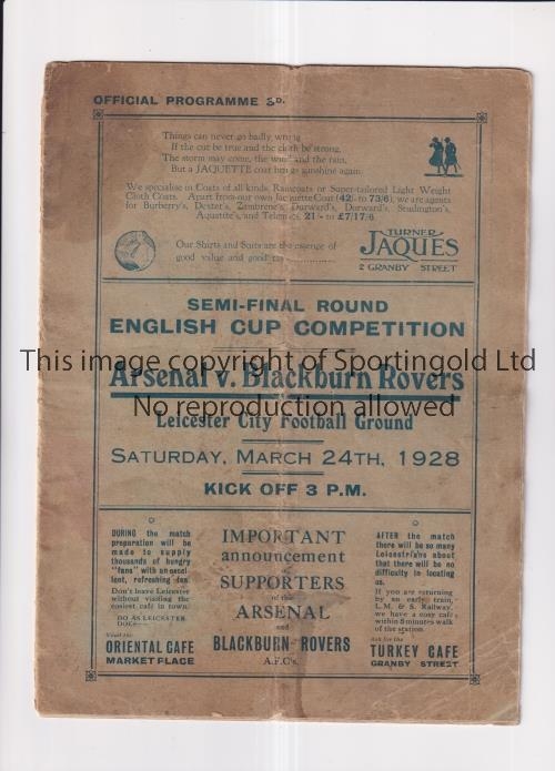 1928 FA CUP SEMI-FINAL / ARSENAL v BLACKBURN ROVERS Programme for the match 24/3/1928 at Leicester City FC, vertical fold, staple removed, slightly worn and marked throughout. Fair