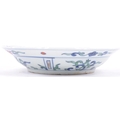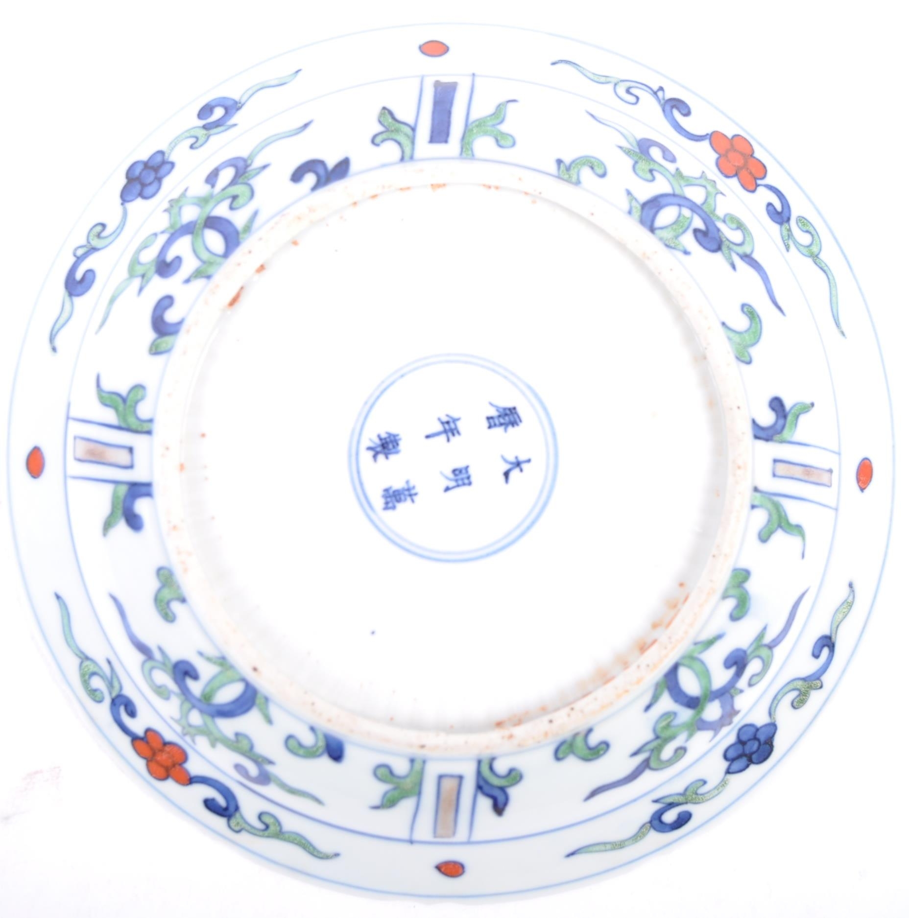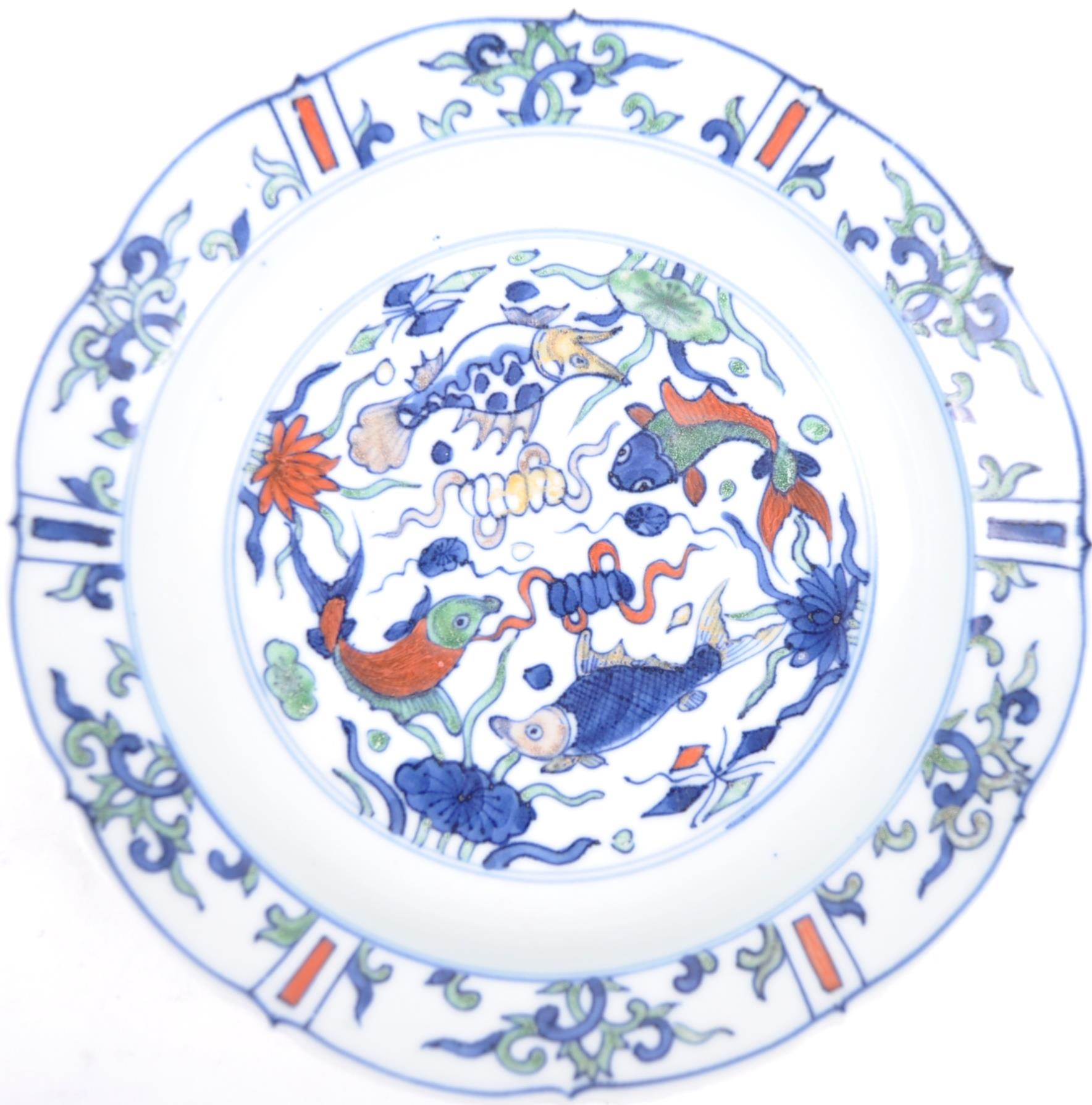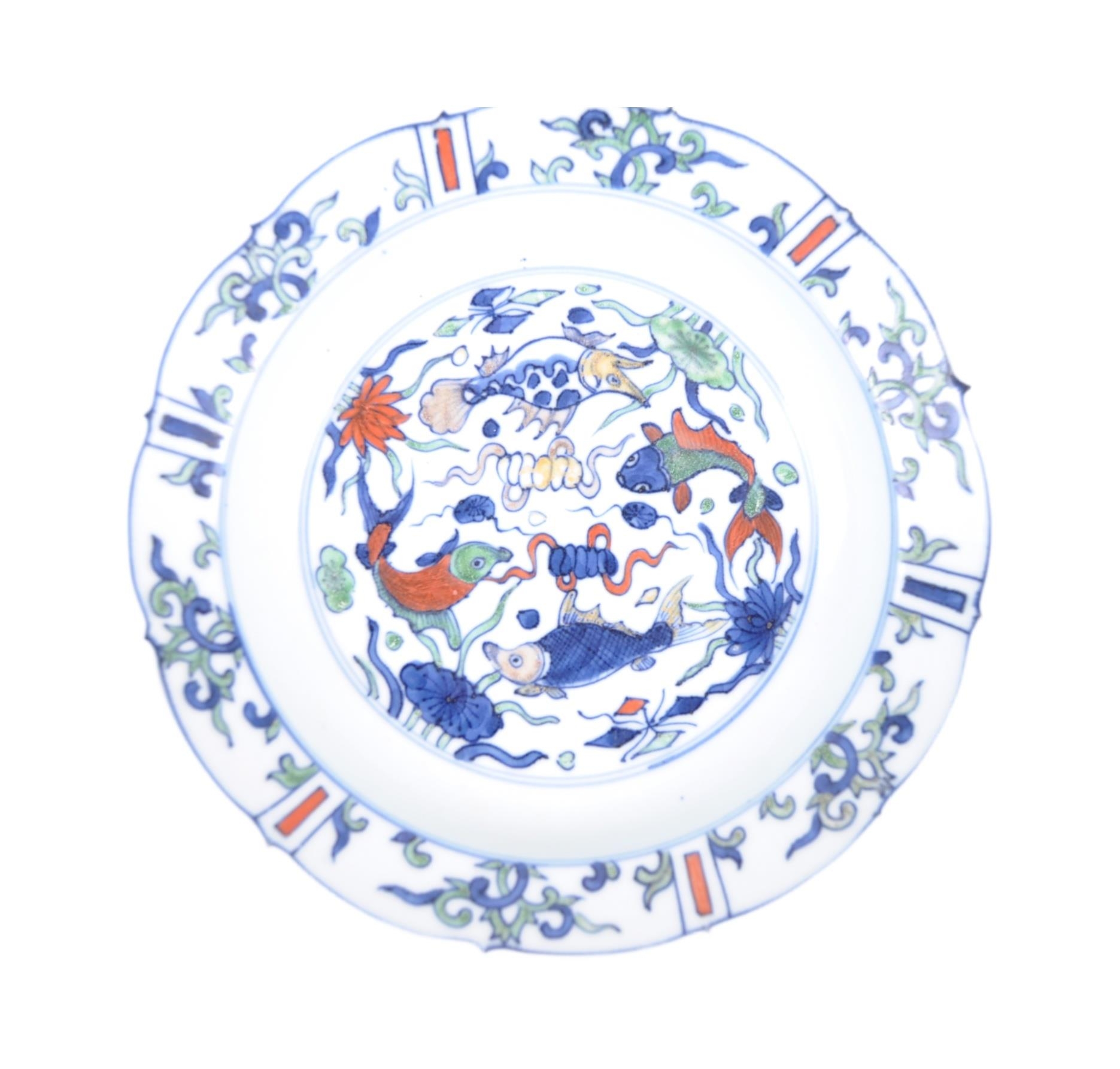 A 20th century Ming dynasty marked to base porcelain bowl / plate, decorated with carps and floral motifs in a wucai palette. The underside having a six character Ming dynasty marks. Measures approximately 23cm.