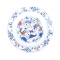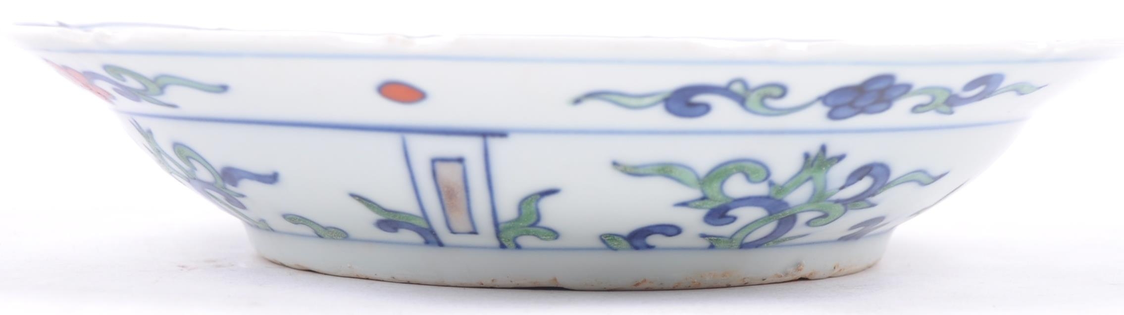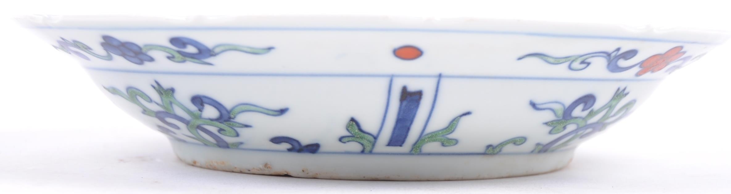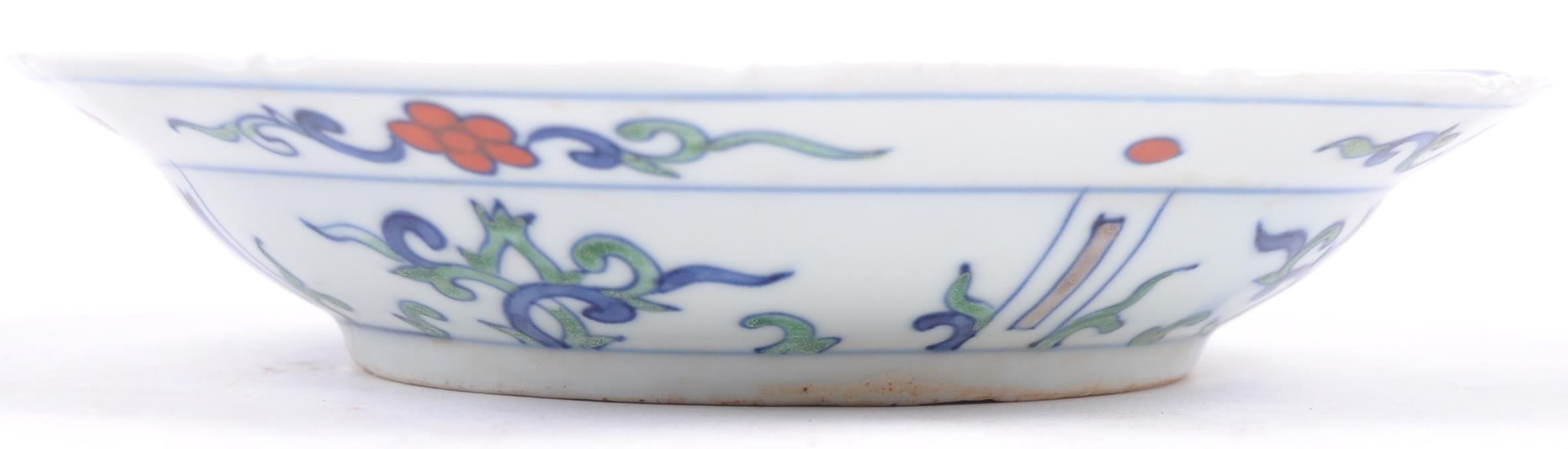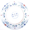 A 20th century Ming dynasty marked to base porcelain bowl / plate, decorated with carps and floral motifs in a wucai palette. The underside having a six character Ming dynasty marks. Measures approximately 23cm.