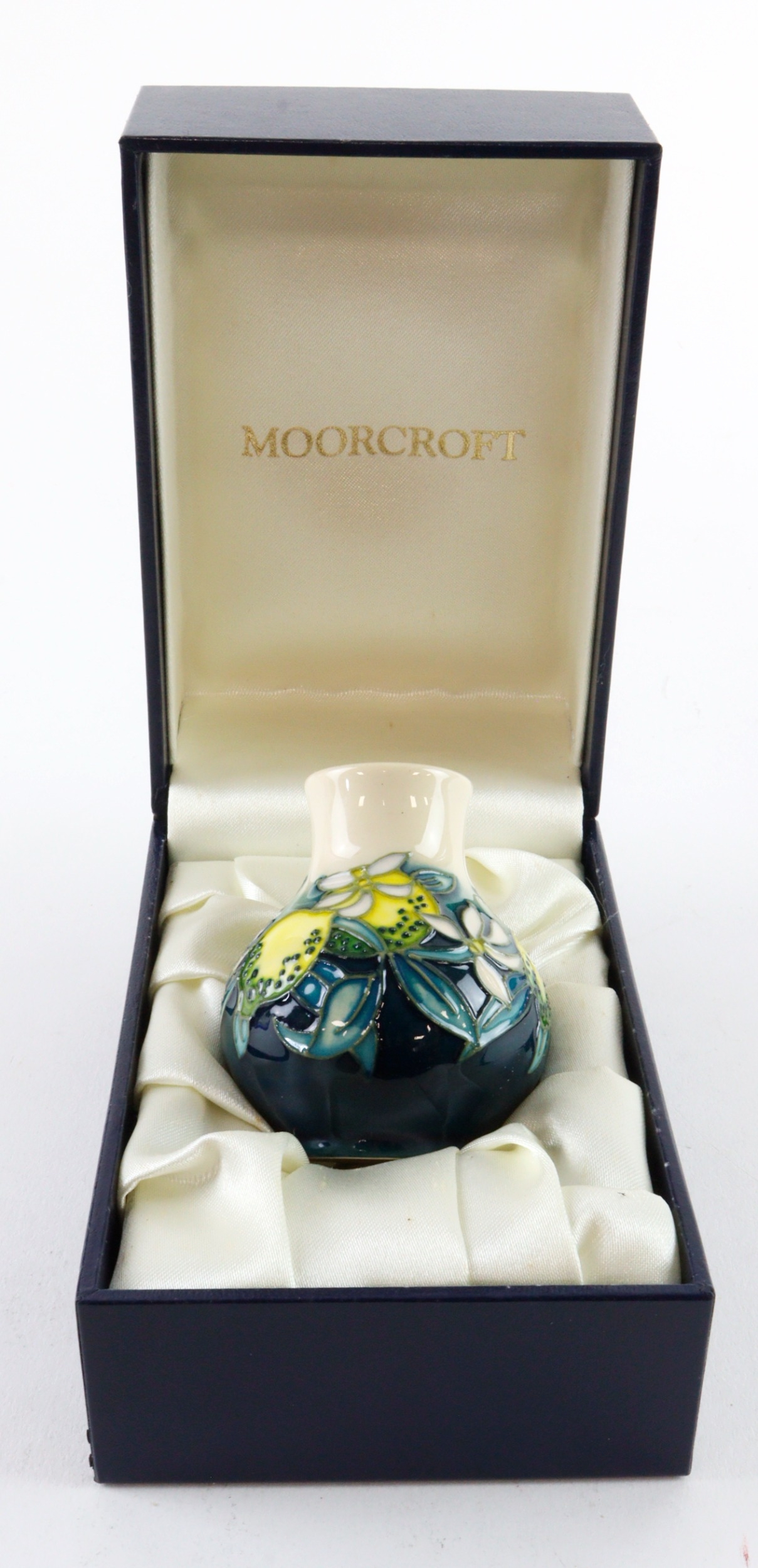 Moorcroft 'Lemon Hill' pattern miniature vase, makers marks to base, height 5.5cm approx., contained in fitted Moorcroft box