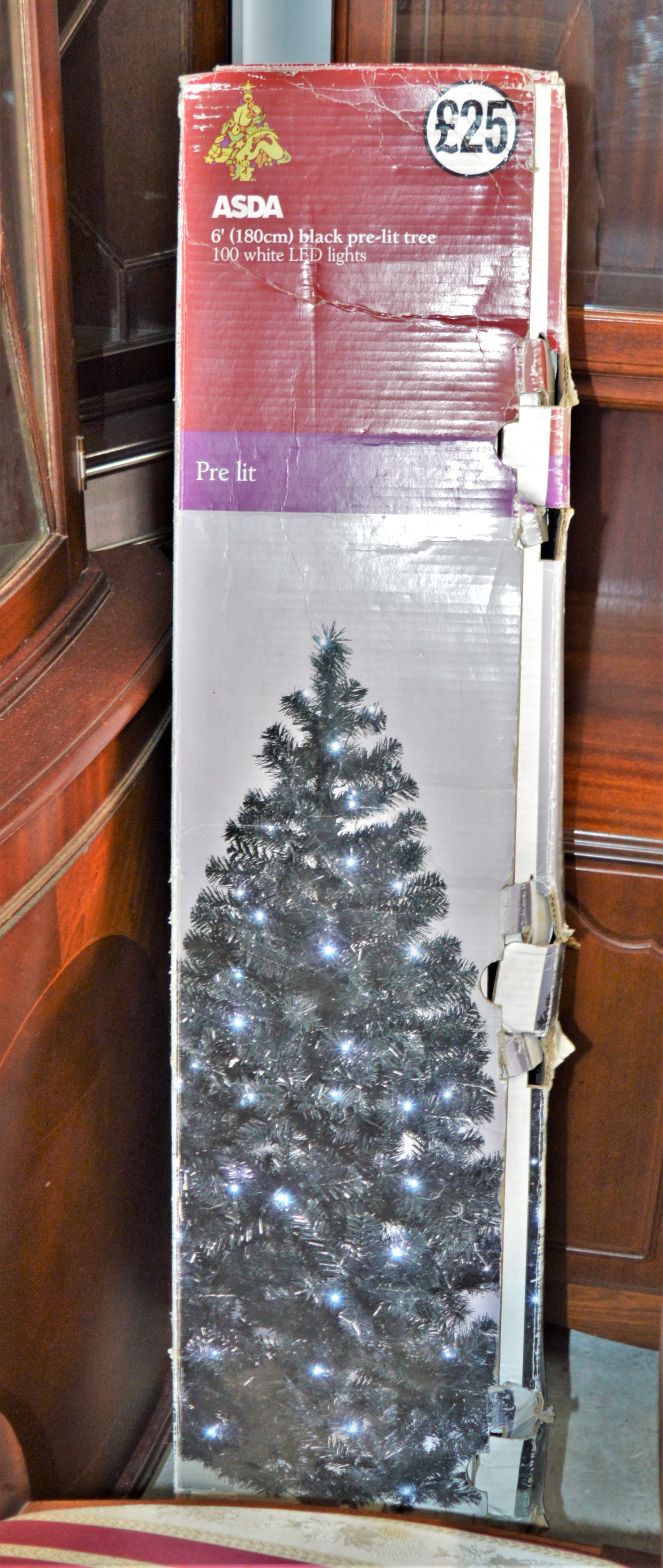 Boxed ASDA 6 Ft Black Pre-Lit Christmas Tree with 100 White LED Lights