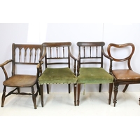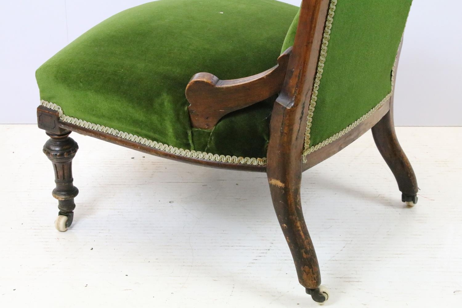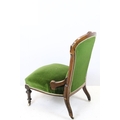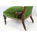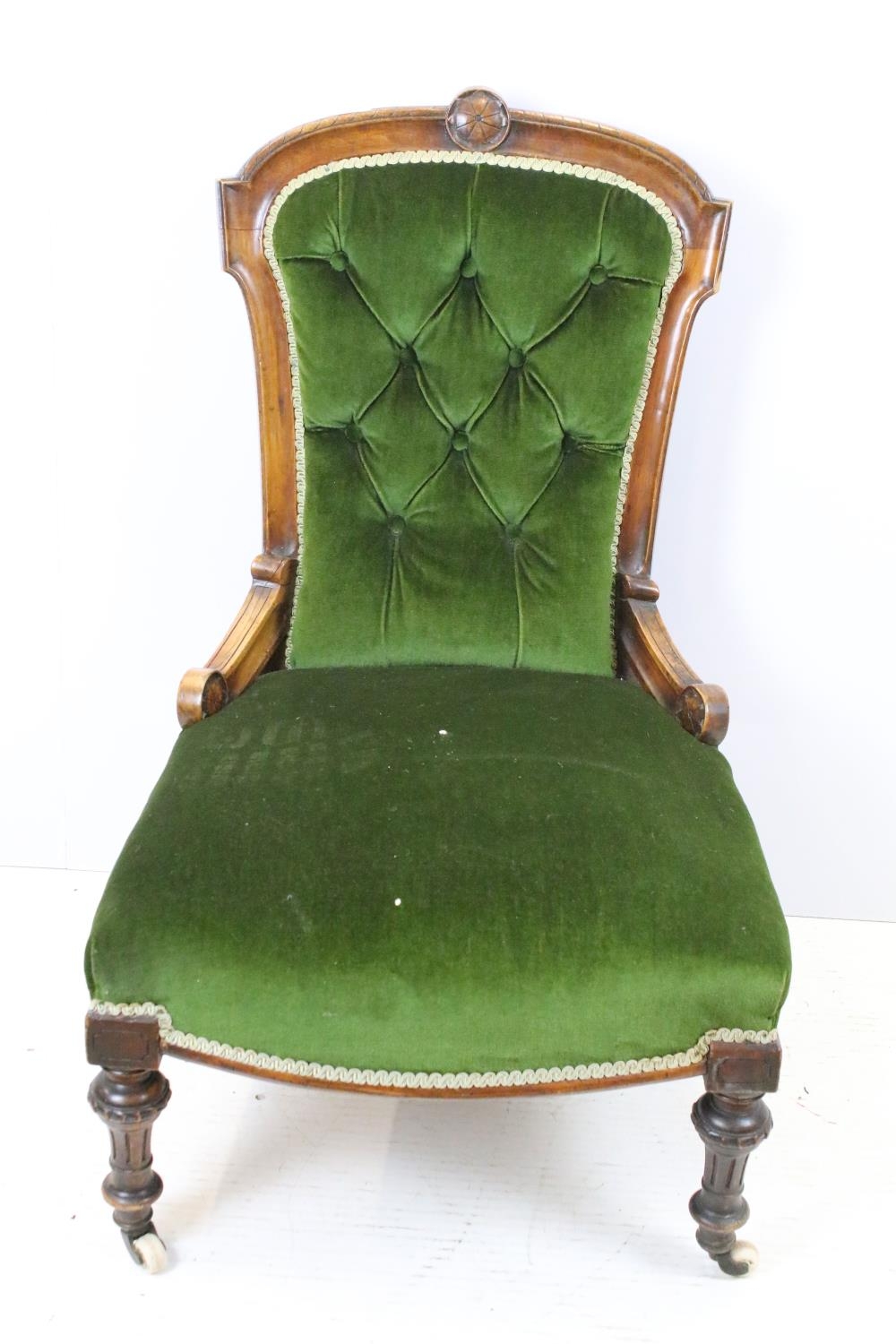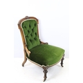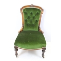 Edwardian nursing chair, with carved back, upholstered in green with button back, on turned legs and castors, 90cm high x 58cm wide x 50cm deep (seat)
