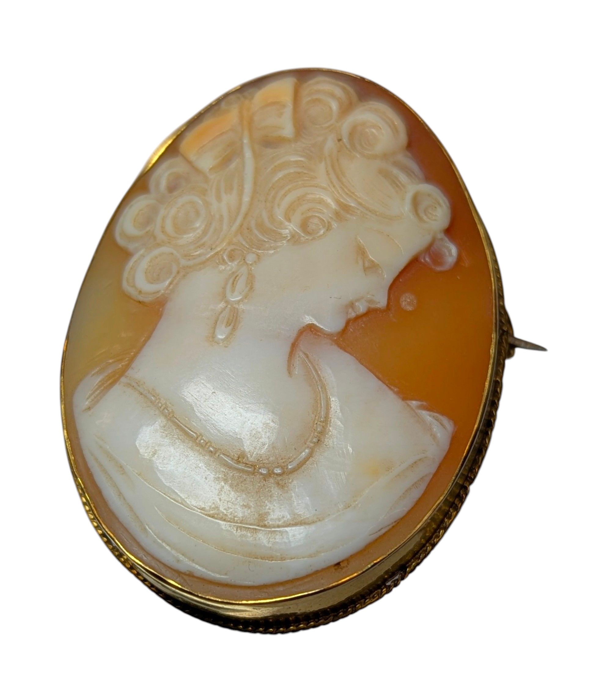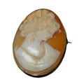 the shell cameo carved with a right facing lady in high relief, stamped "9CT", measuring approx. 4.7cm's high x 3.5cm's max width, approx. 13.3g gross, a/f