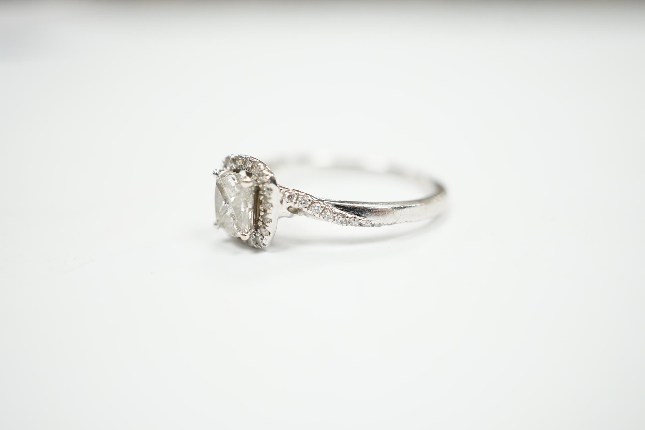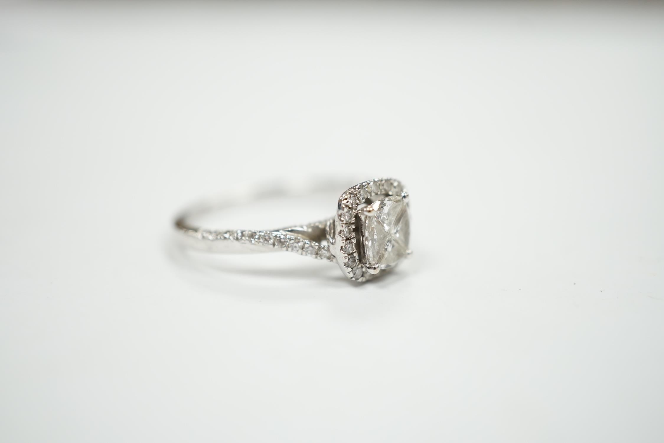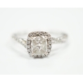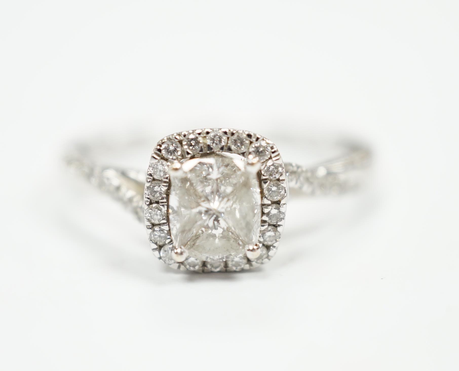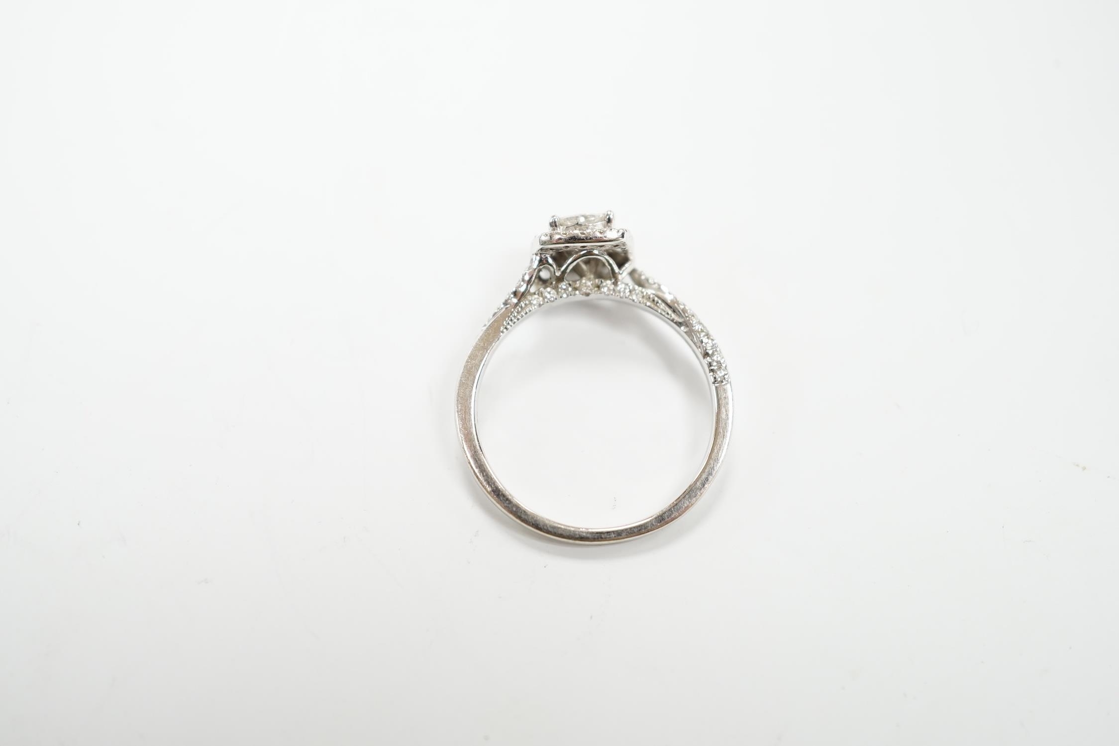 A modern 14ct white gold and diamond set cluster ring, size M/N, gross weight 2.7 grams.