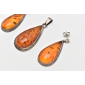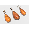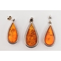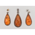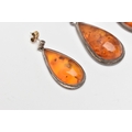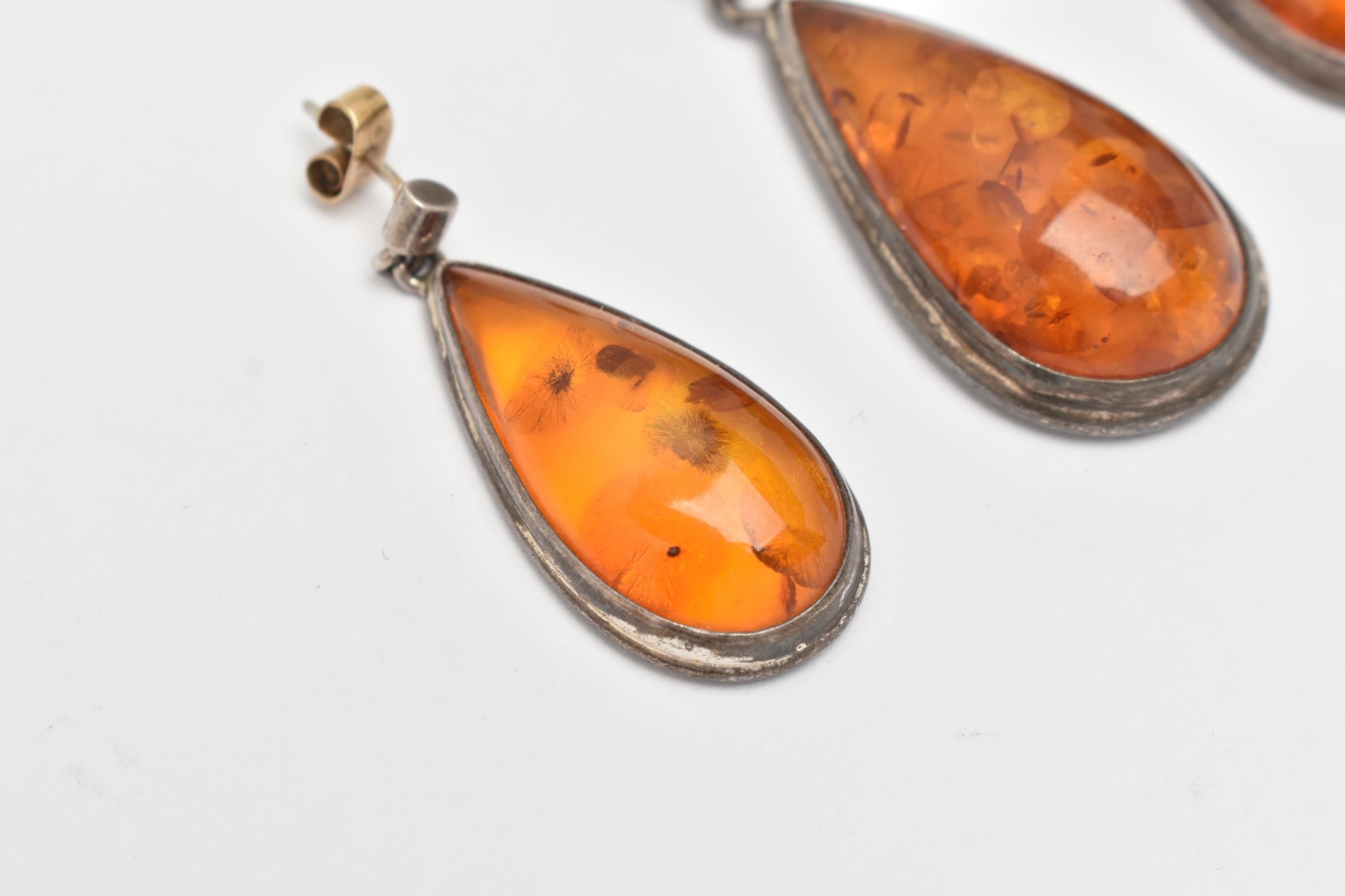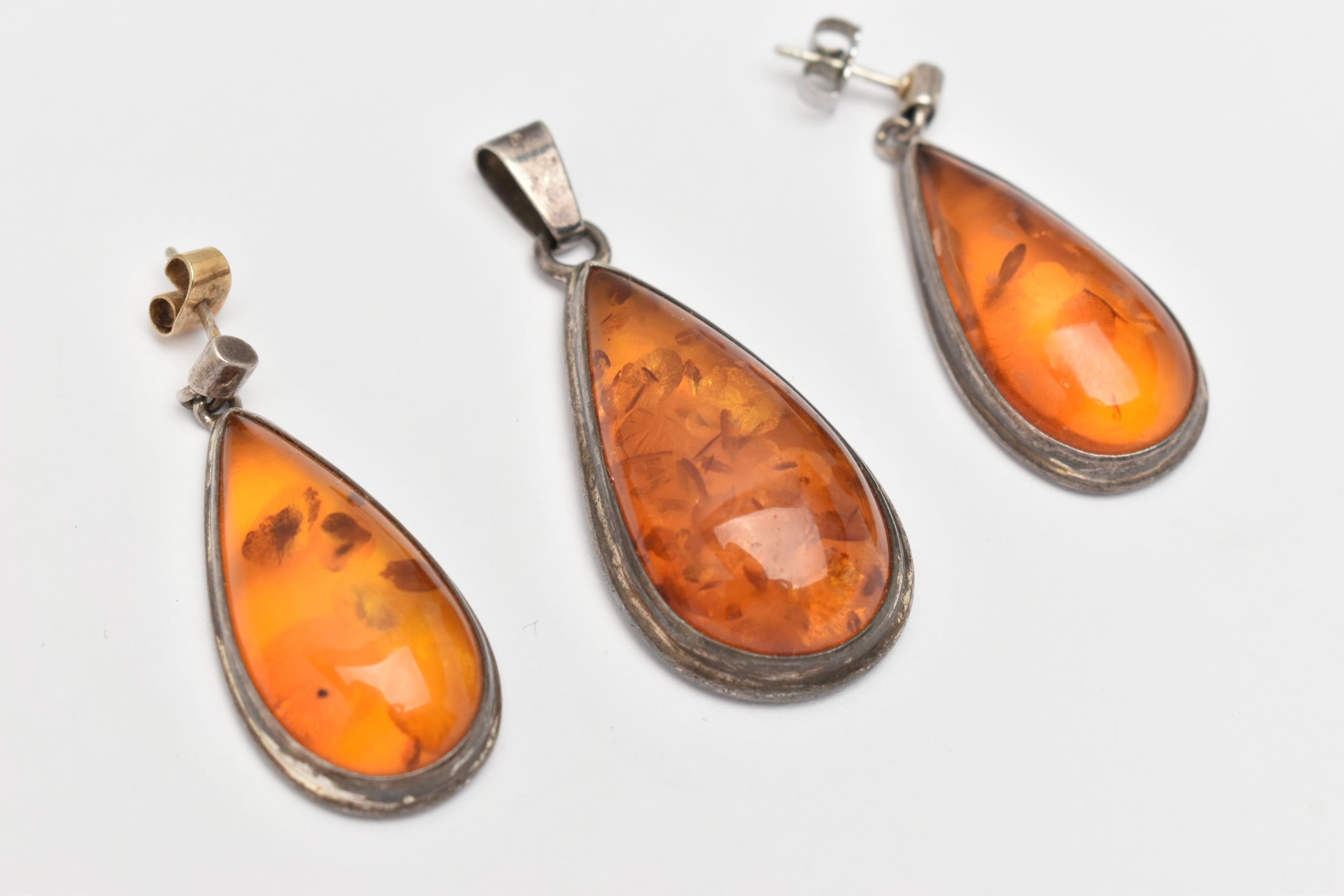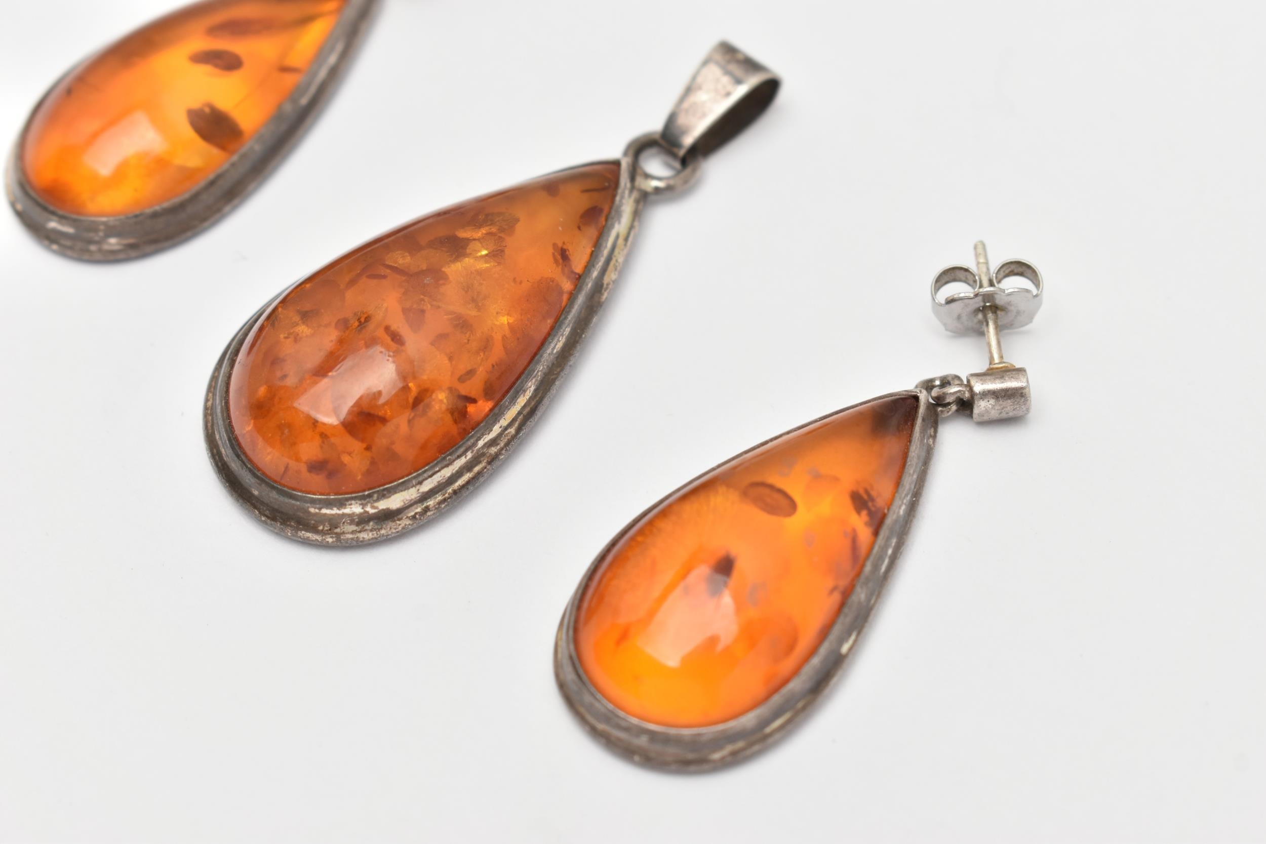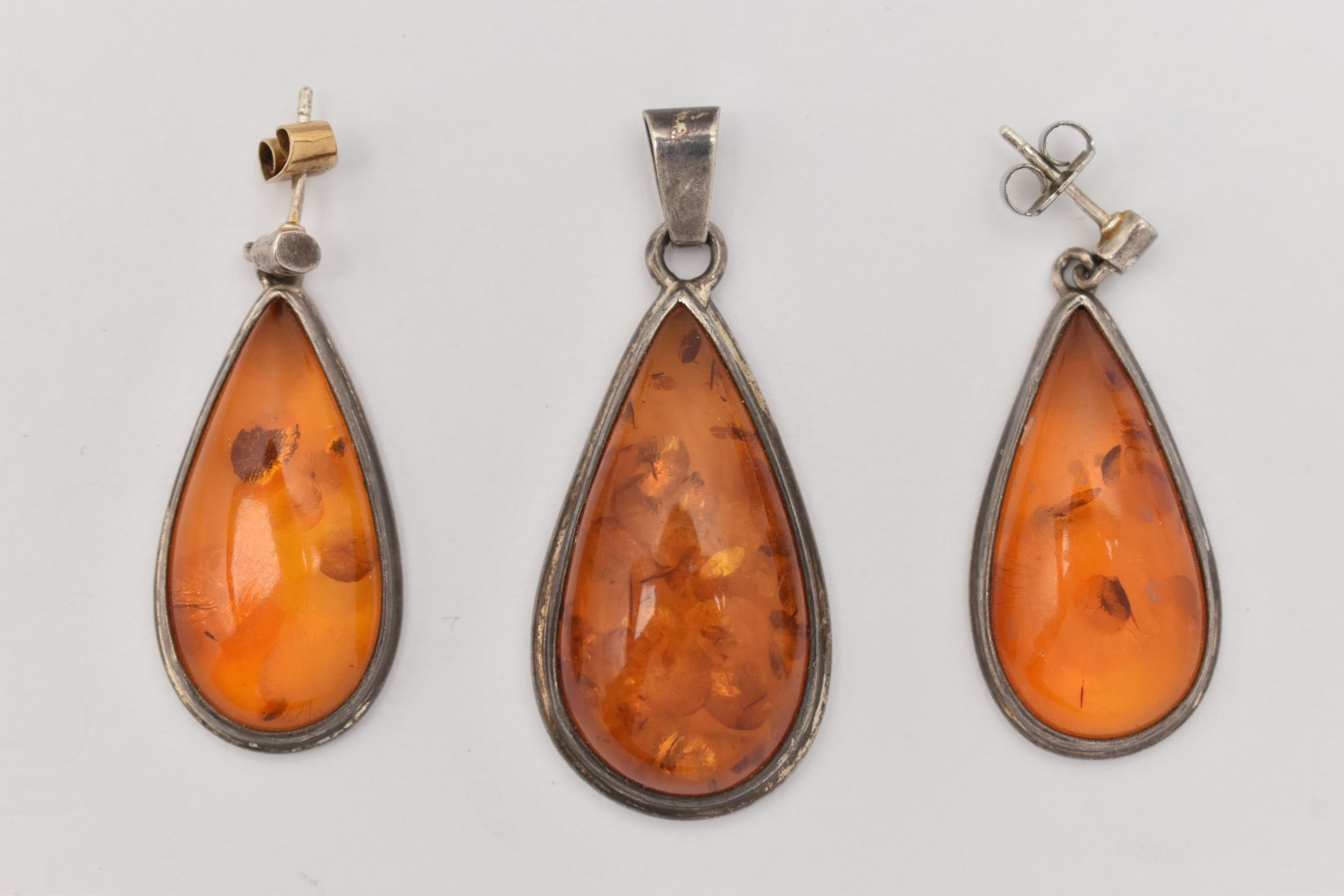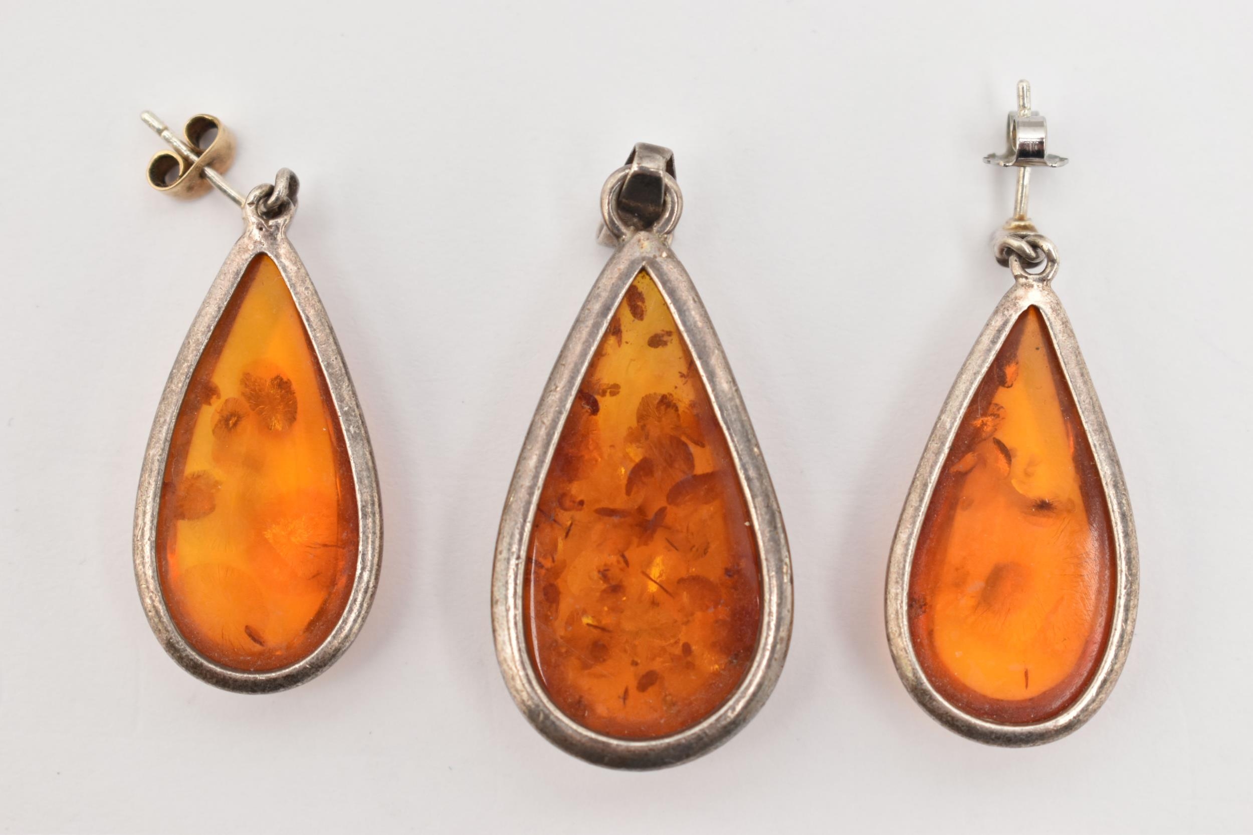 A PAIR OF WHITE METAL AMBER SET EARRINGS AND MATCHING PENDANT, all of a pear drop form, visible sun spangles throughout all three pieces, pendant fitted with a tapered bail stamped 925, earrings with post and scroll fittings, unmarked (condition report: general light wear, some discoloration to the metal in places)