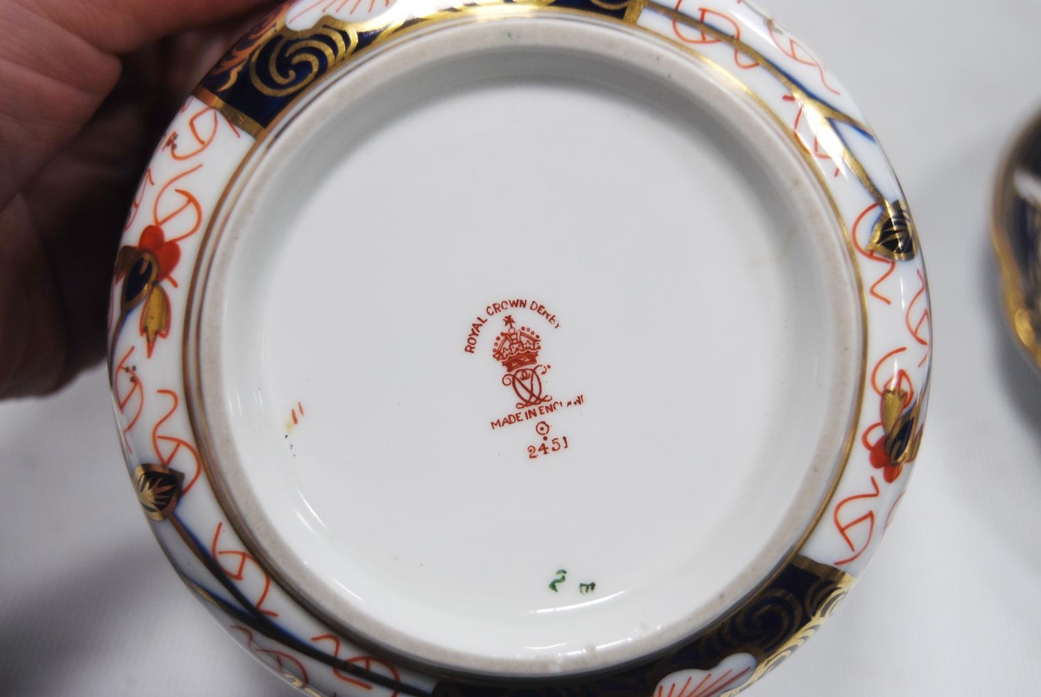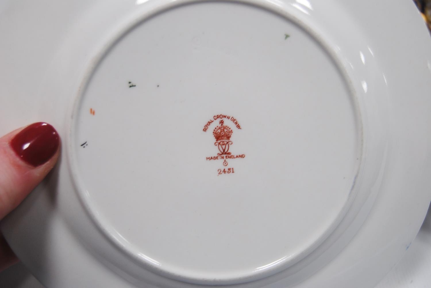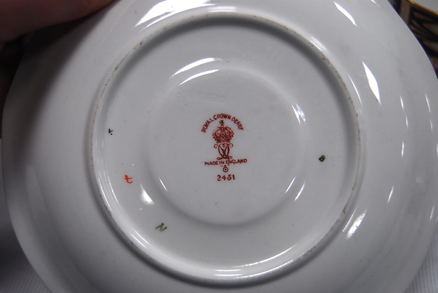 Royal Crown Derby part tea set comprising four side plates, six saucers, six tea cups and sugar bowl, with backstamp, no. 2451, and a pair of similar biscuit plates, no. 8731 stamped to one biscuit plate. (19)