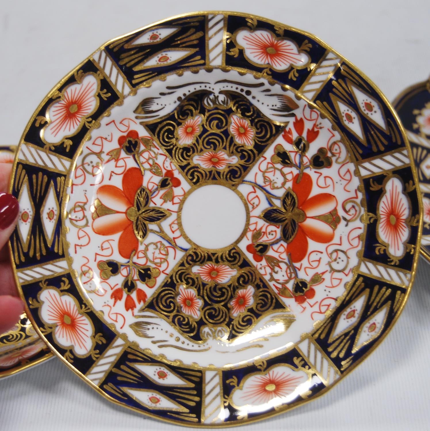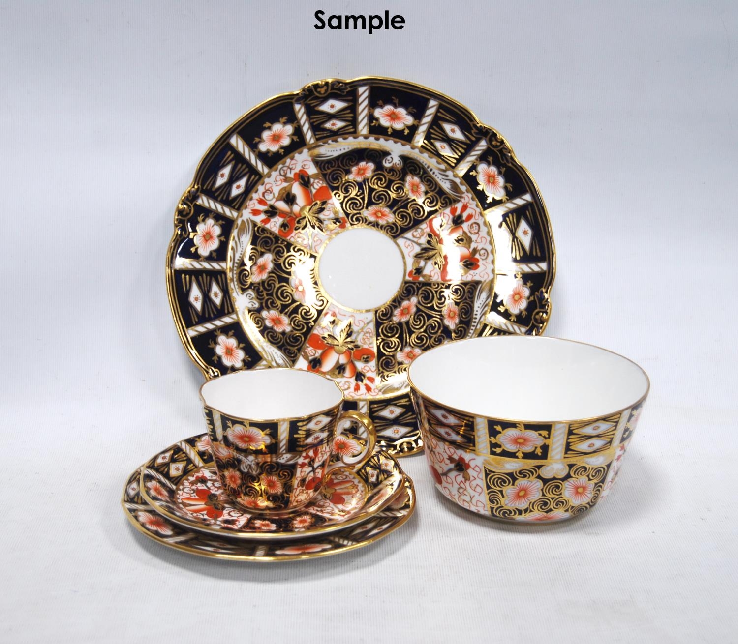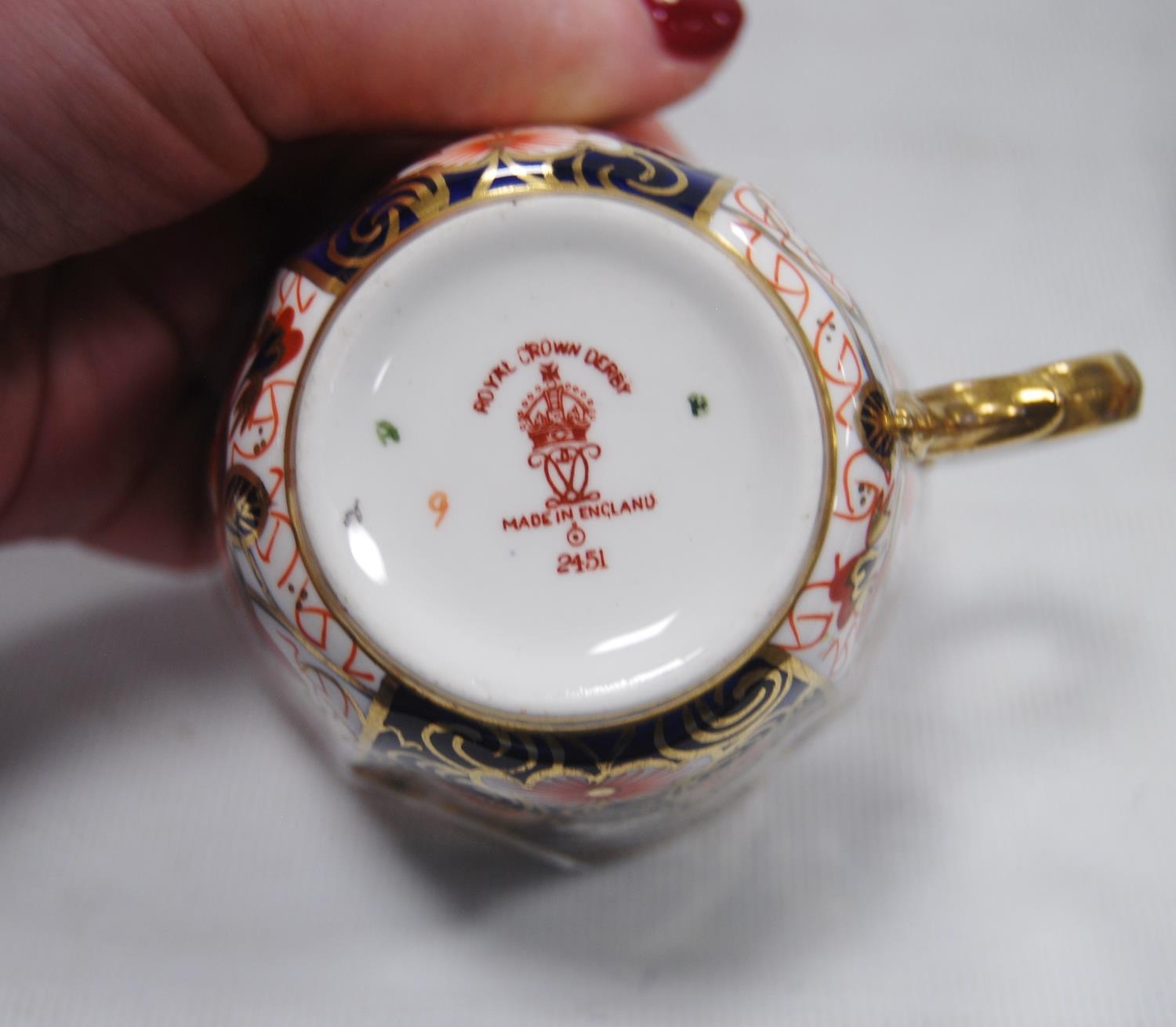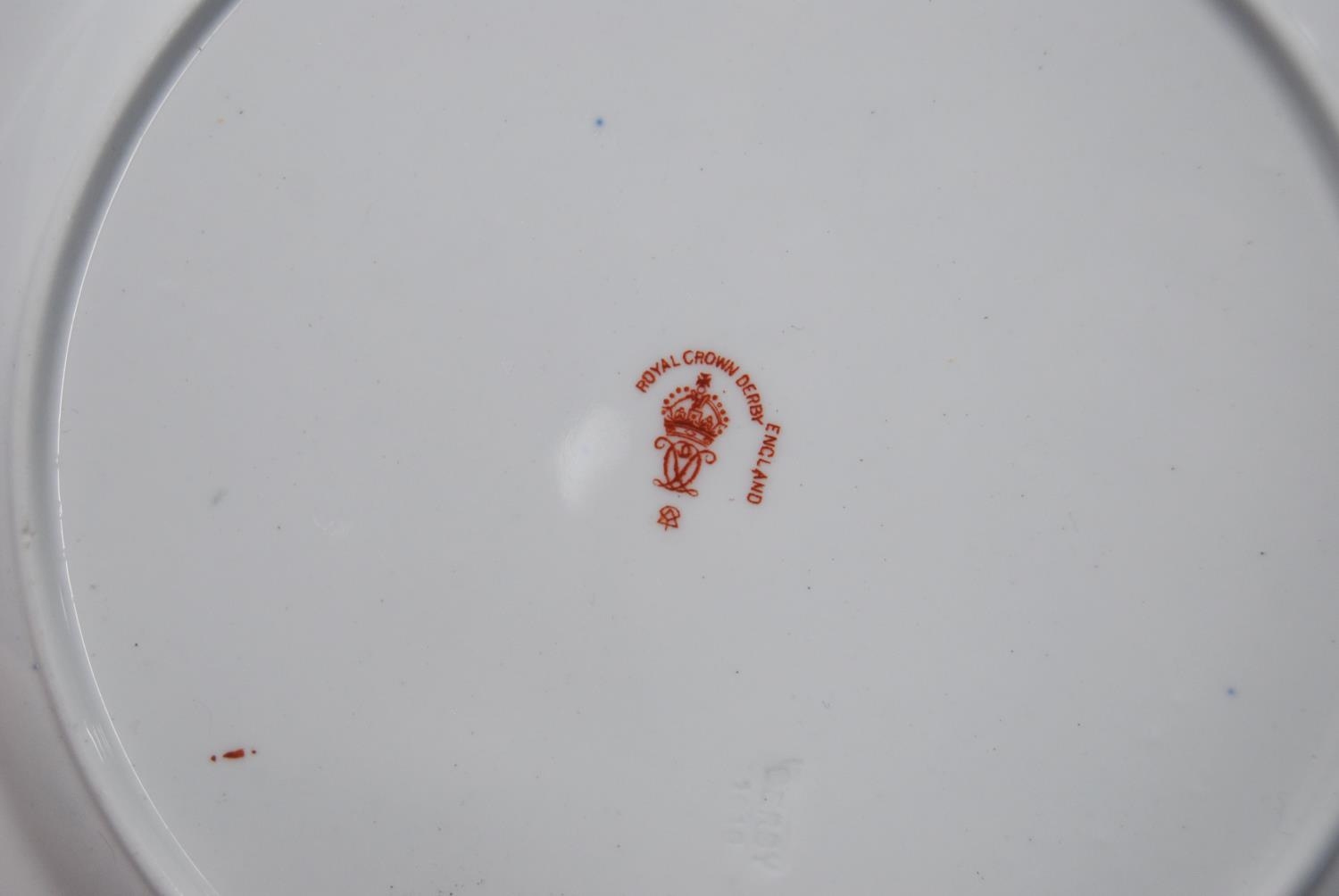 Royal Crown Derby part tea set comprising four side plates, six saucers, six tea cups and sugar bowl, with backstamp, no. 2451, and a pair of similar biscuit plates, no. 8731 stamped to one biscuit plate. (19)