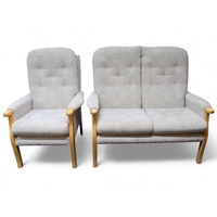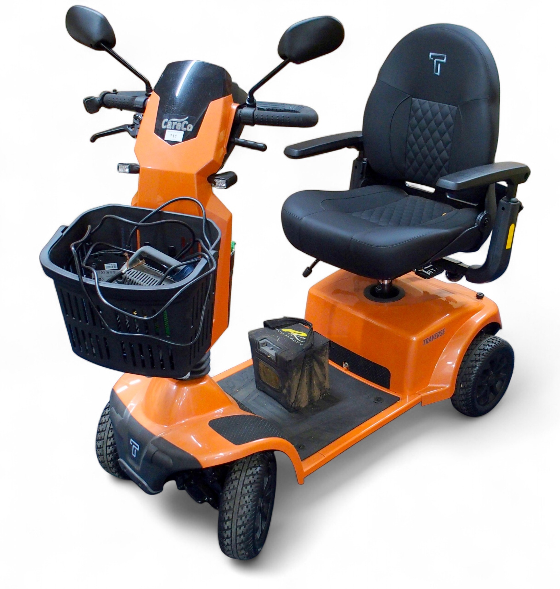 A contemporary battery powered CareCo Traverse mobility scooted with accompanying spare battery, charging leads, canopy and folding ramp