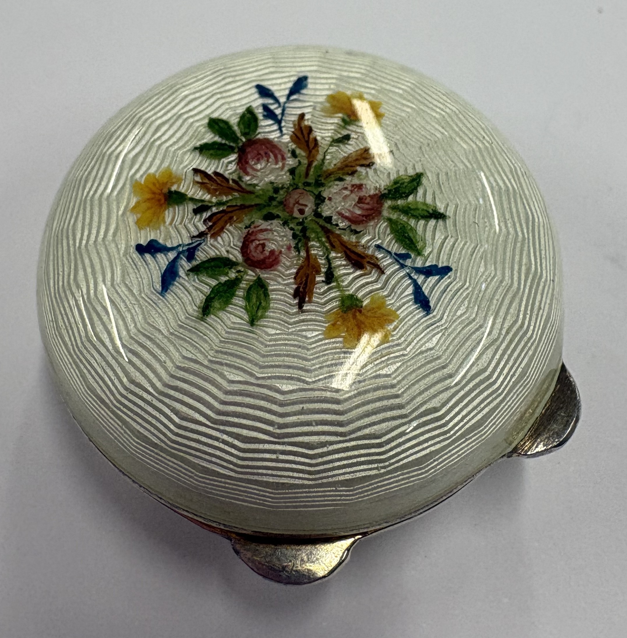 FLORENCE: A late 20th Century Italian Sterling silver and enamelled pill box with floral decoration, marked to base. Approx. 34 grams. Est. £300 - £400.