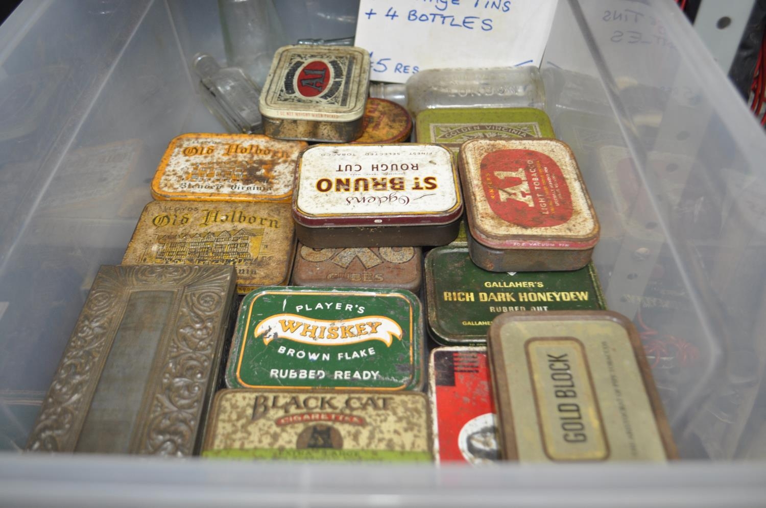 SELECTION OF VINTAGE TOBACCO TINS AND APOTHECARY BOTTLES ETC