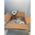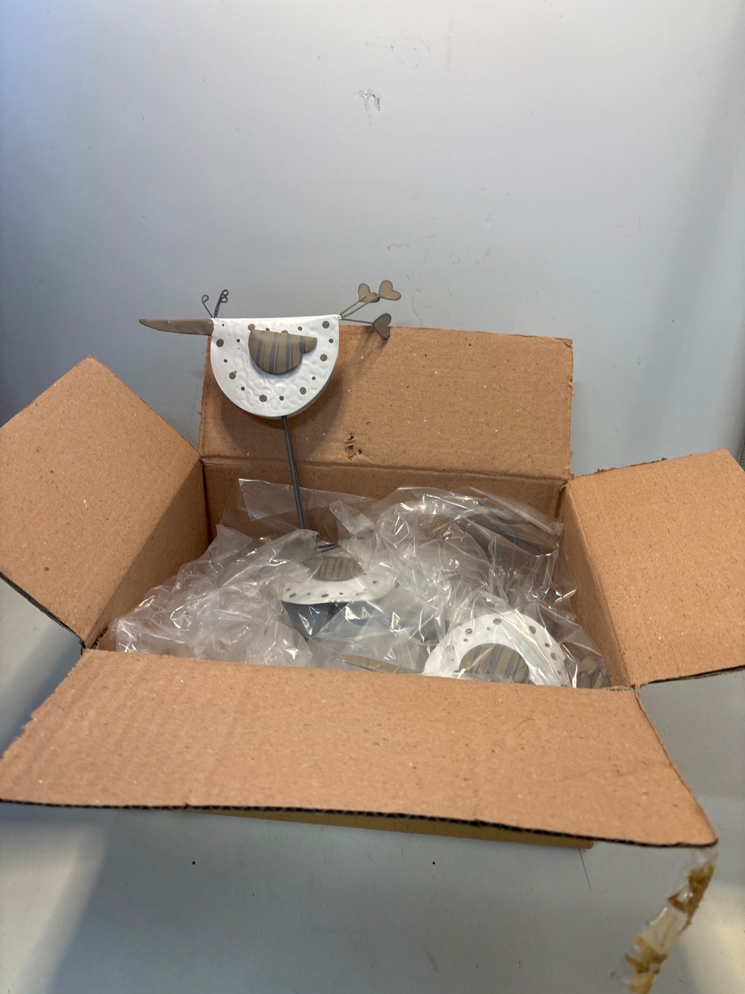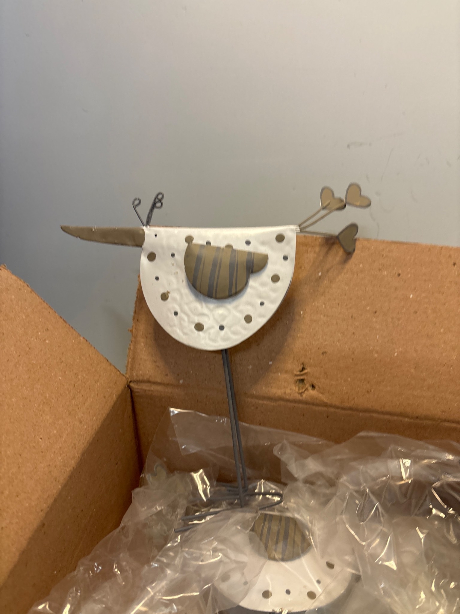 6 Metal bird sculptures with white details, boxed.