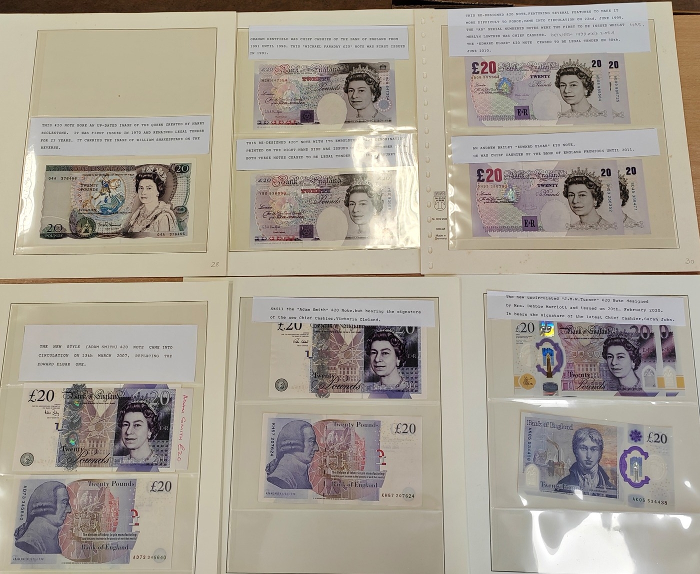 Collection of uncirculated £20 banknotes includes D.H.F Somerset 04A 376486, plus Kentfield (2), Lowther (2), Bailey (4), Cleland (2), Sarah John (3). Qty 14 (R)