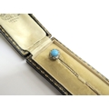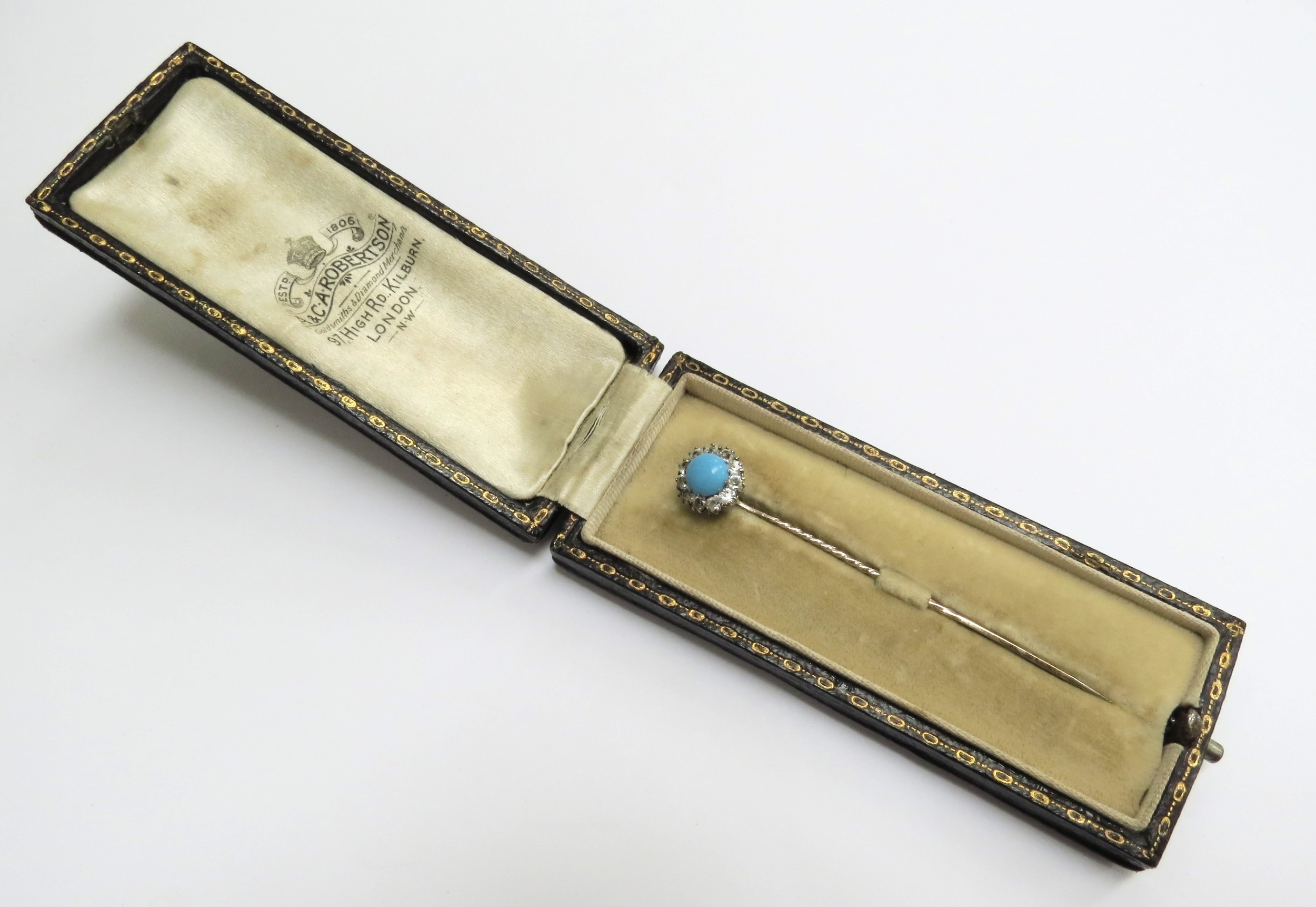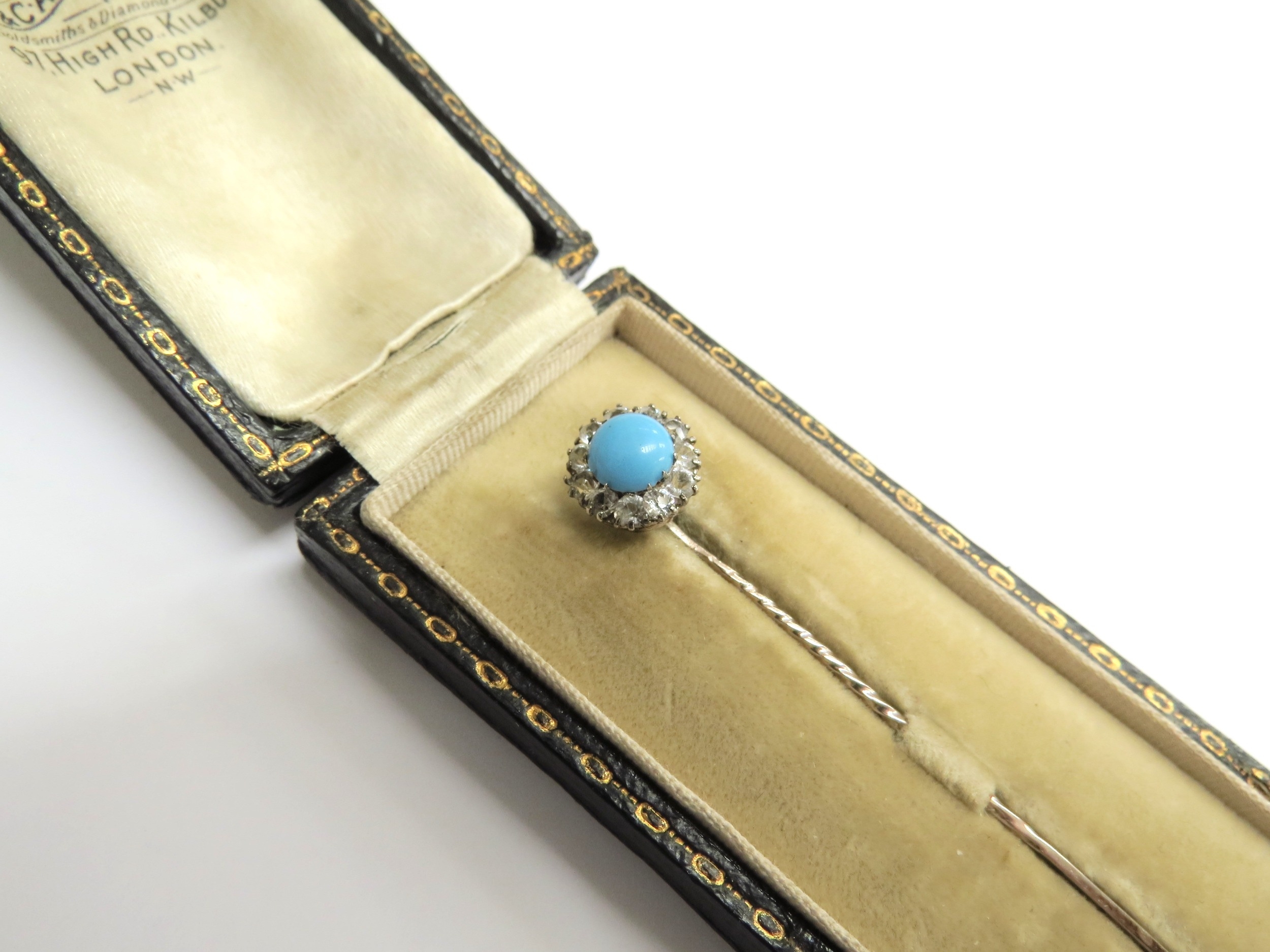 A yellow metal stick pin with turquoise and paste cluster, in fitted box