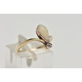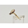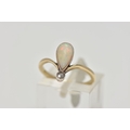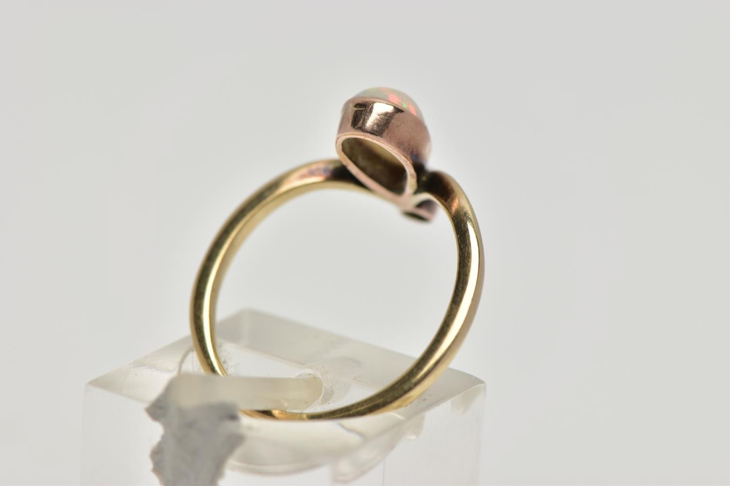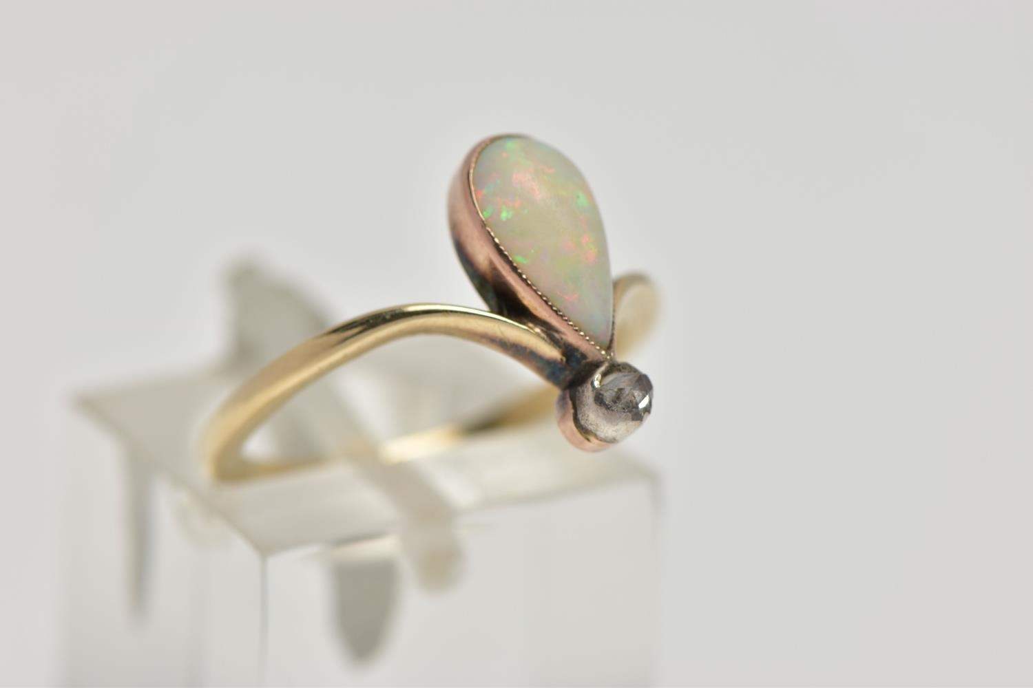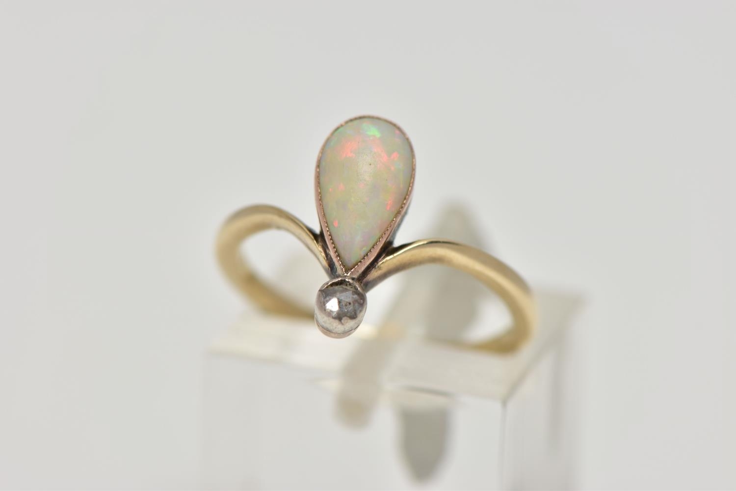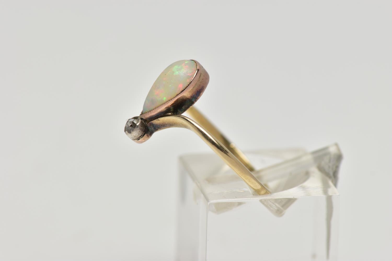 A YELLOW METAL OPAL AND DIAMOND RING, milgrain collet mounted pear shape opal cabochon and a single rose cut diamond, curved shoulders leading onto a polished band, unmarked, ring size K, approximate gross weight 1.9 grams (condition report: the opal has some abrasion which makes it appear dull, general light wear, would benefit from a gentle clean, overall condition good)