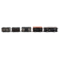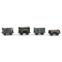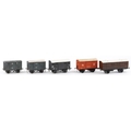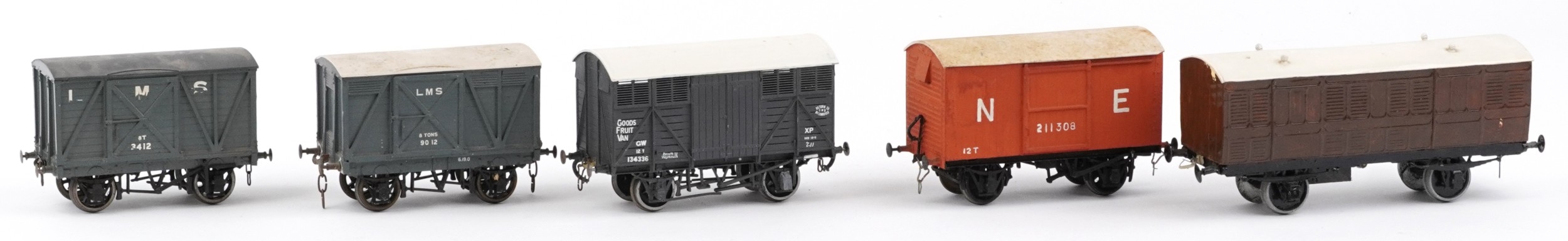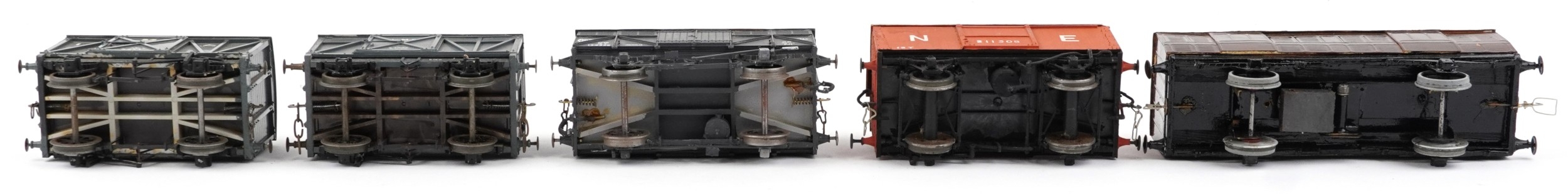 Five vintage O gauge model railway wagons, the largest 18cm in length.