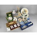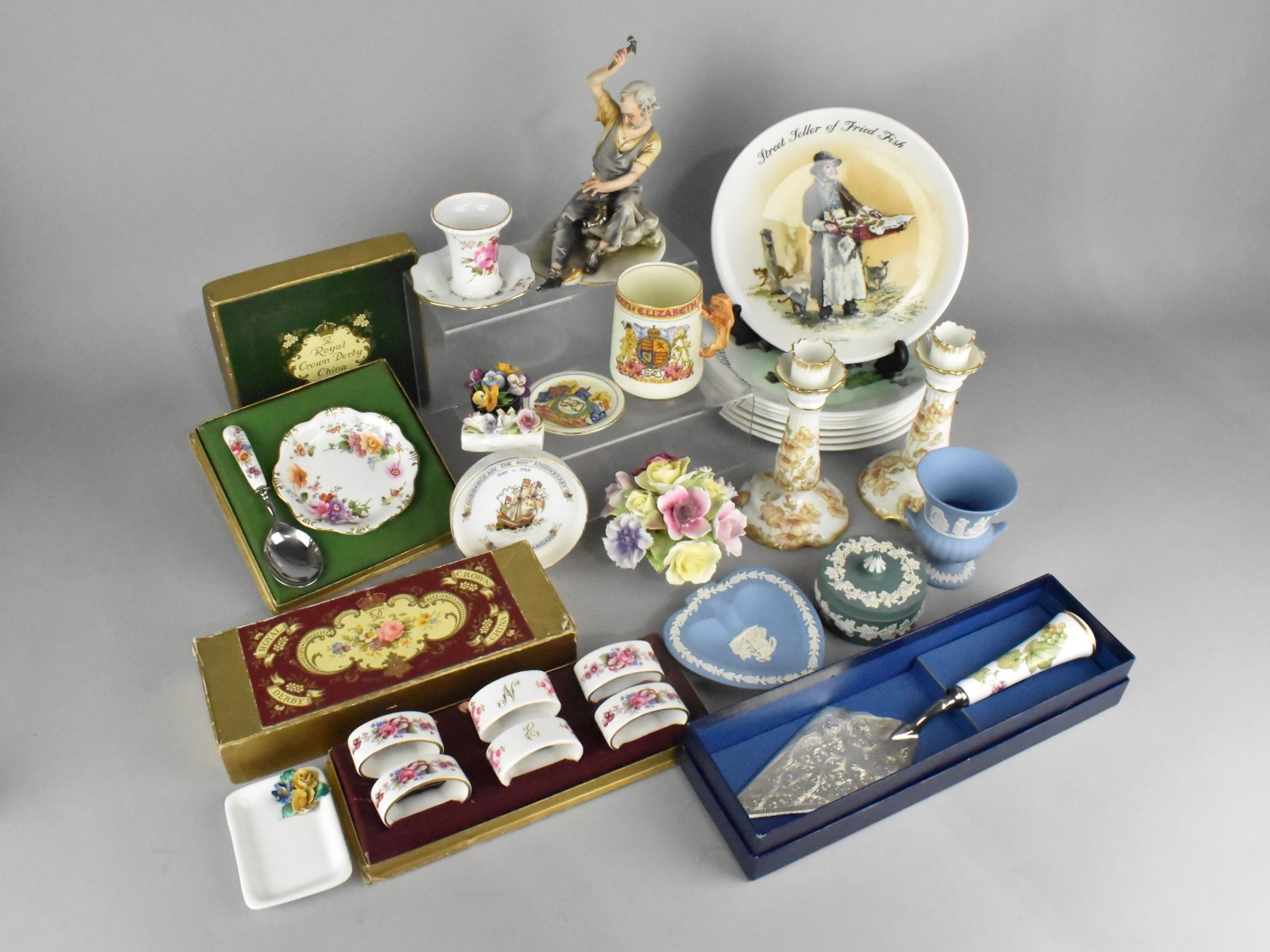 A Collection of Various Ceramics to Comprise Wedgwood Jasperware, Wedgwood Series Plates, Royal Crown Derby 'Derby Posies' Boxed Set of Six Napkin Rings, Dish and Spoon Set, Royal Worcester Ceramic and Silver Plated Trowel, Early 20th Century Aynsley Candlesticks (Condition Issues), Capodimonte Figure of Cobbler etc