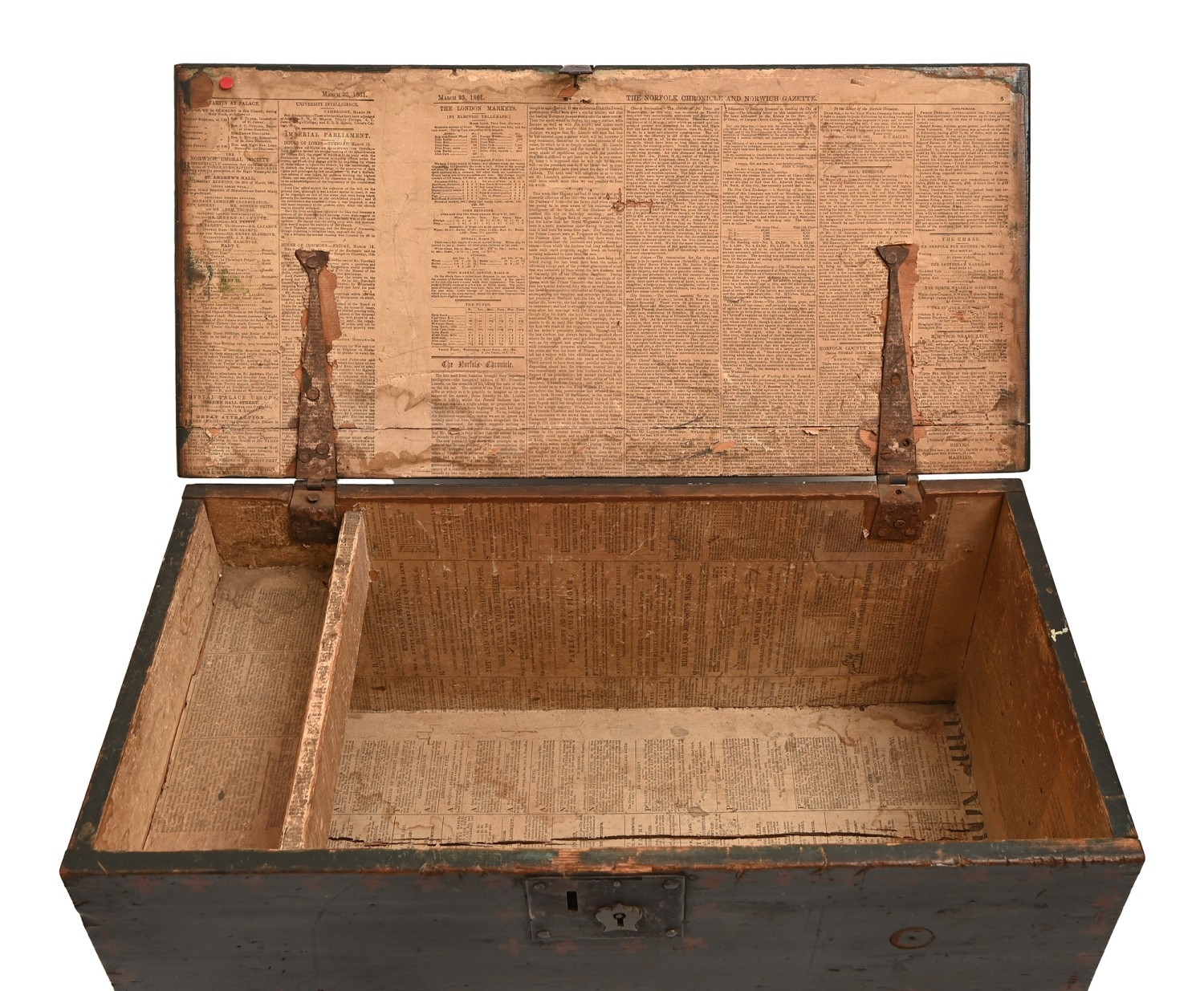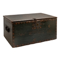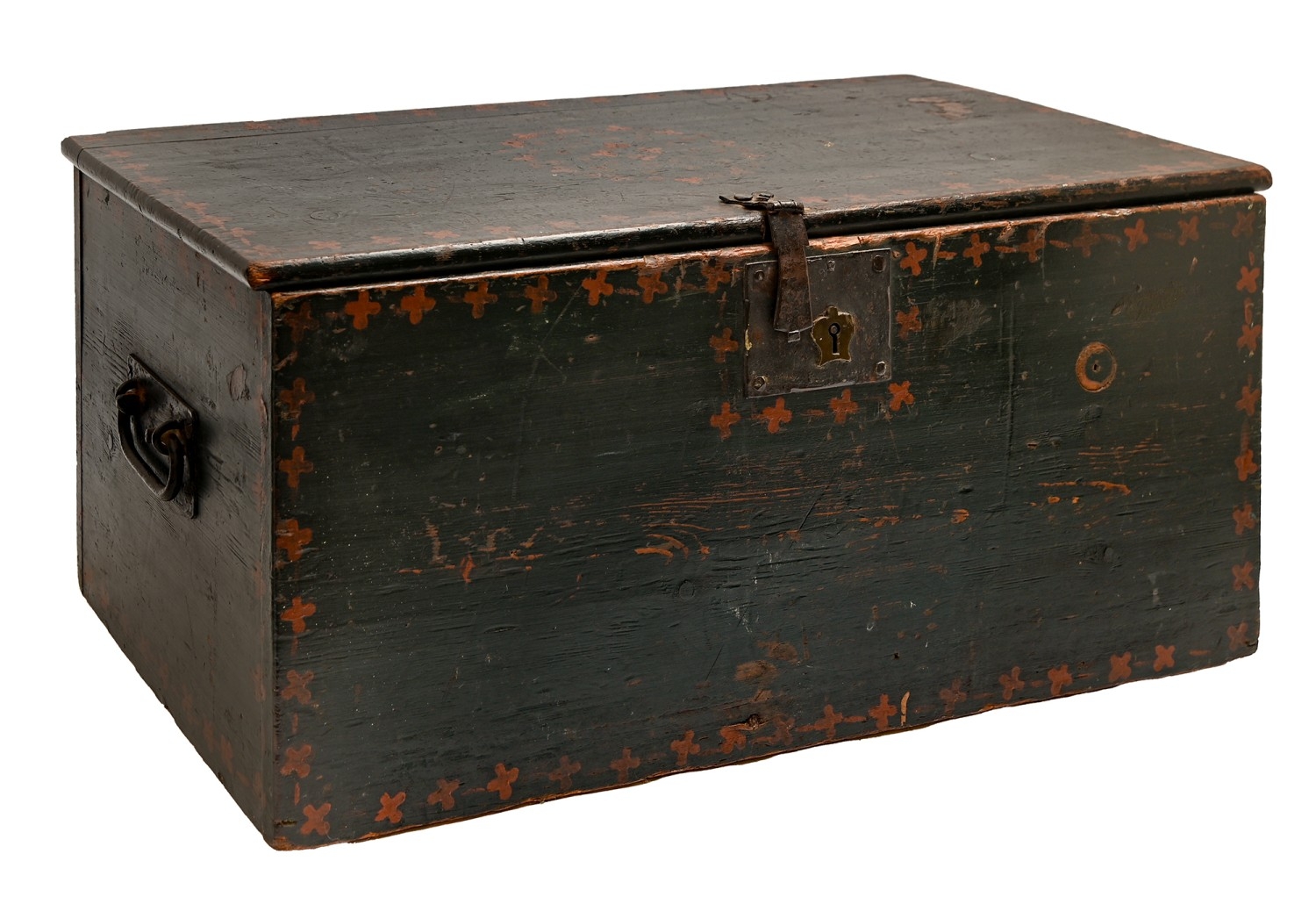 A George III painted pine trunk, the interior with a till, twin iron handles, 28cm h; 63 x 31cm