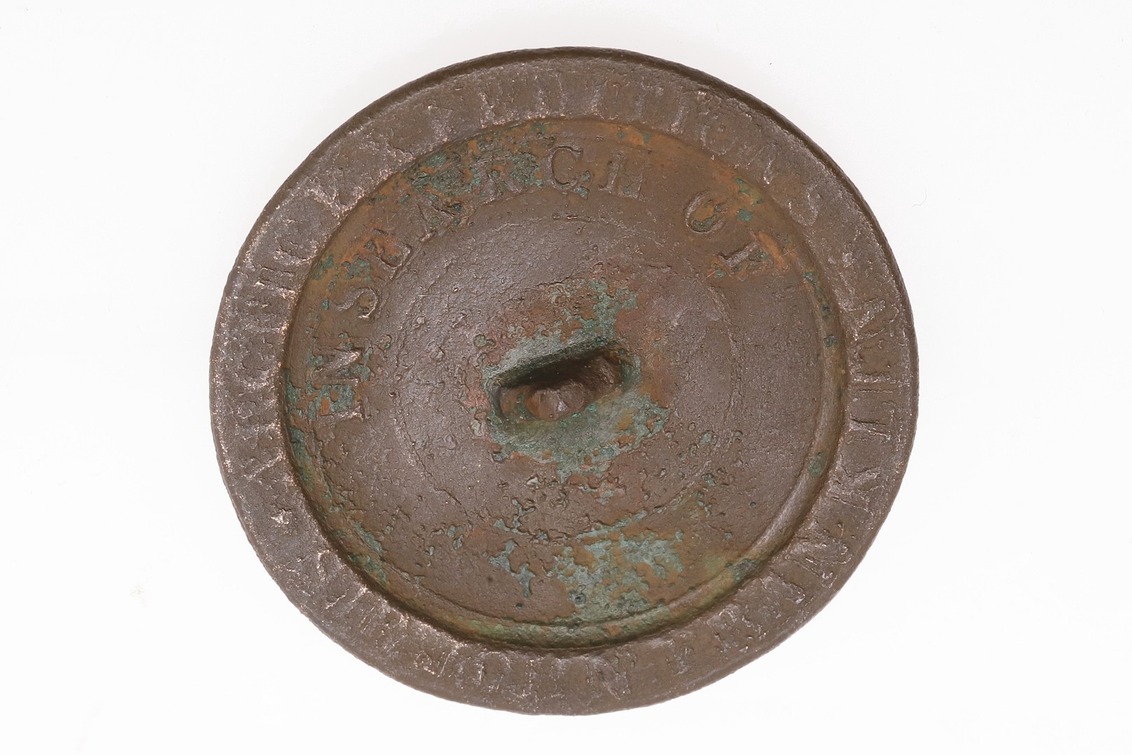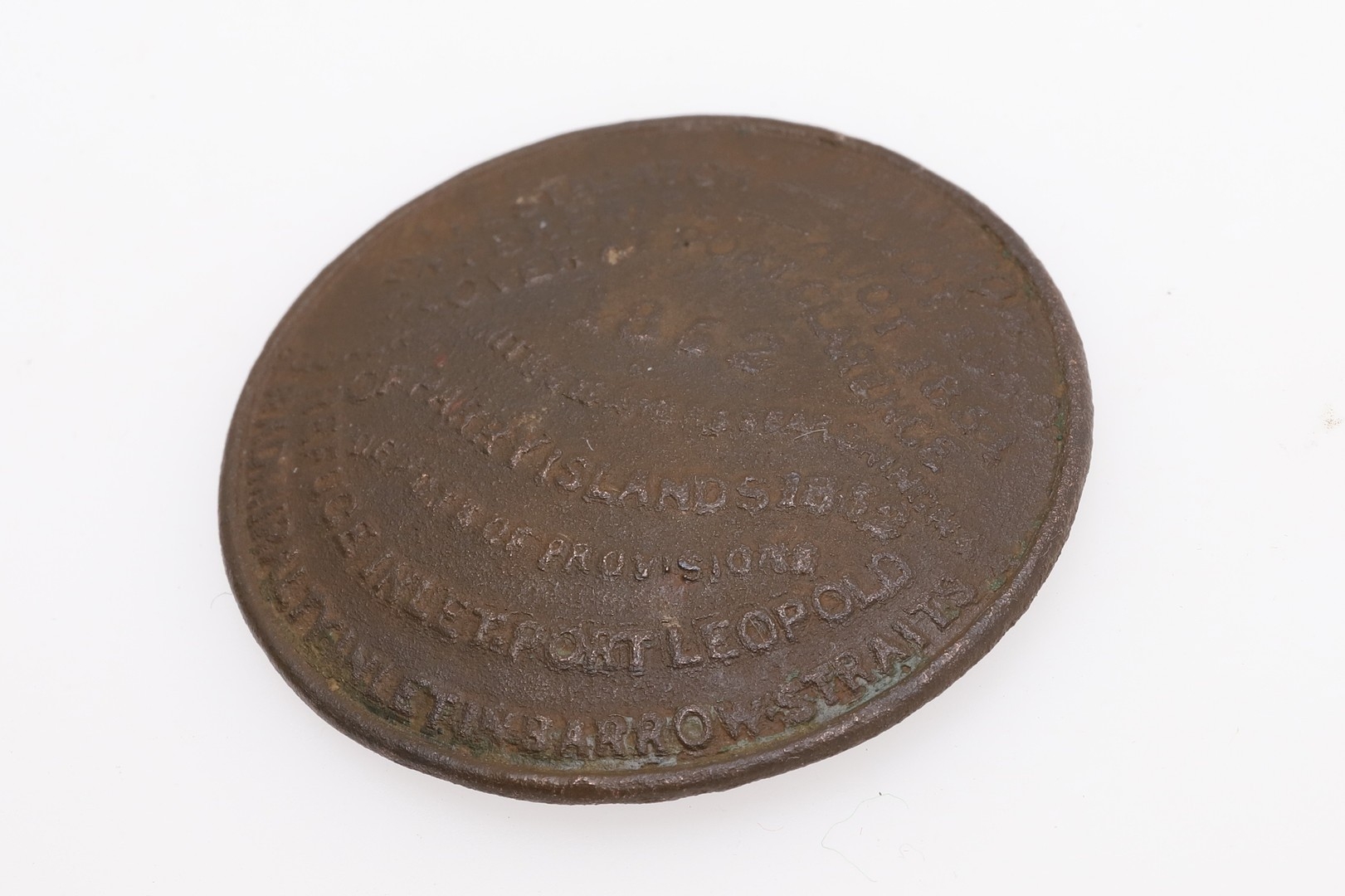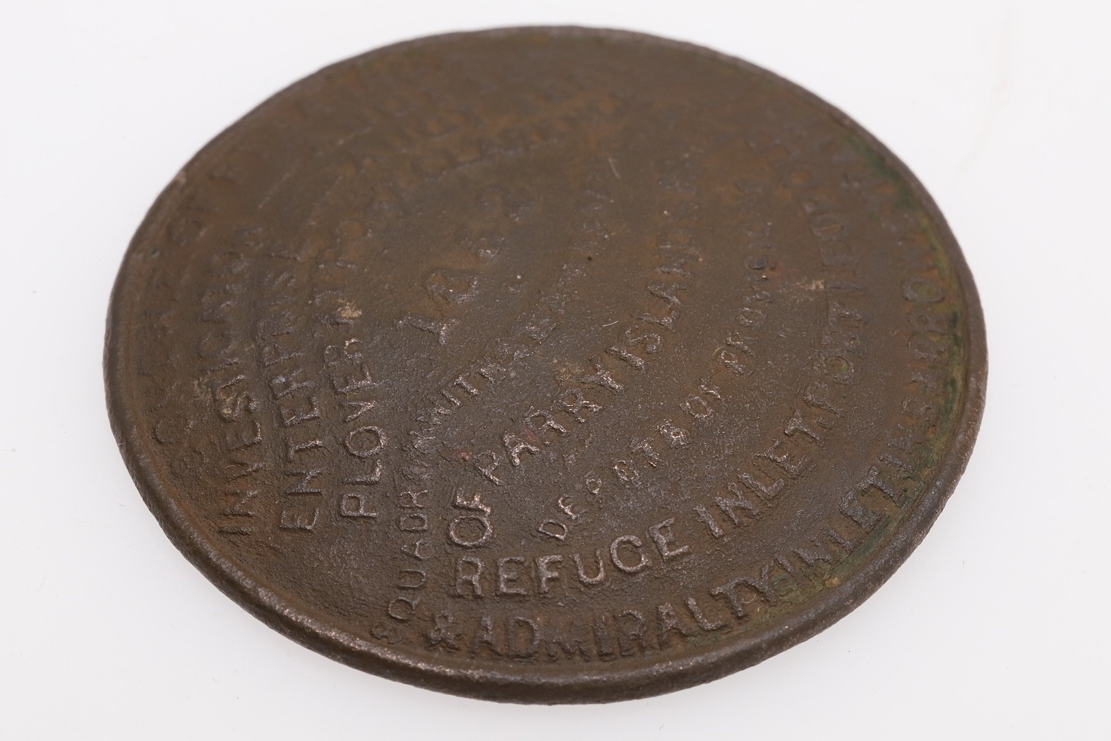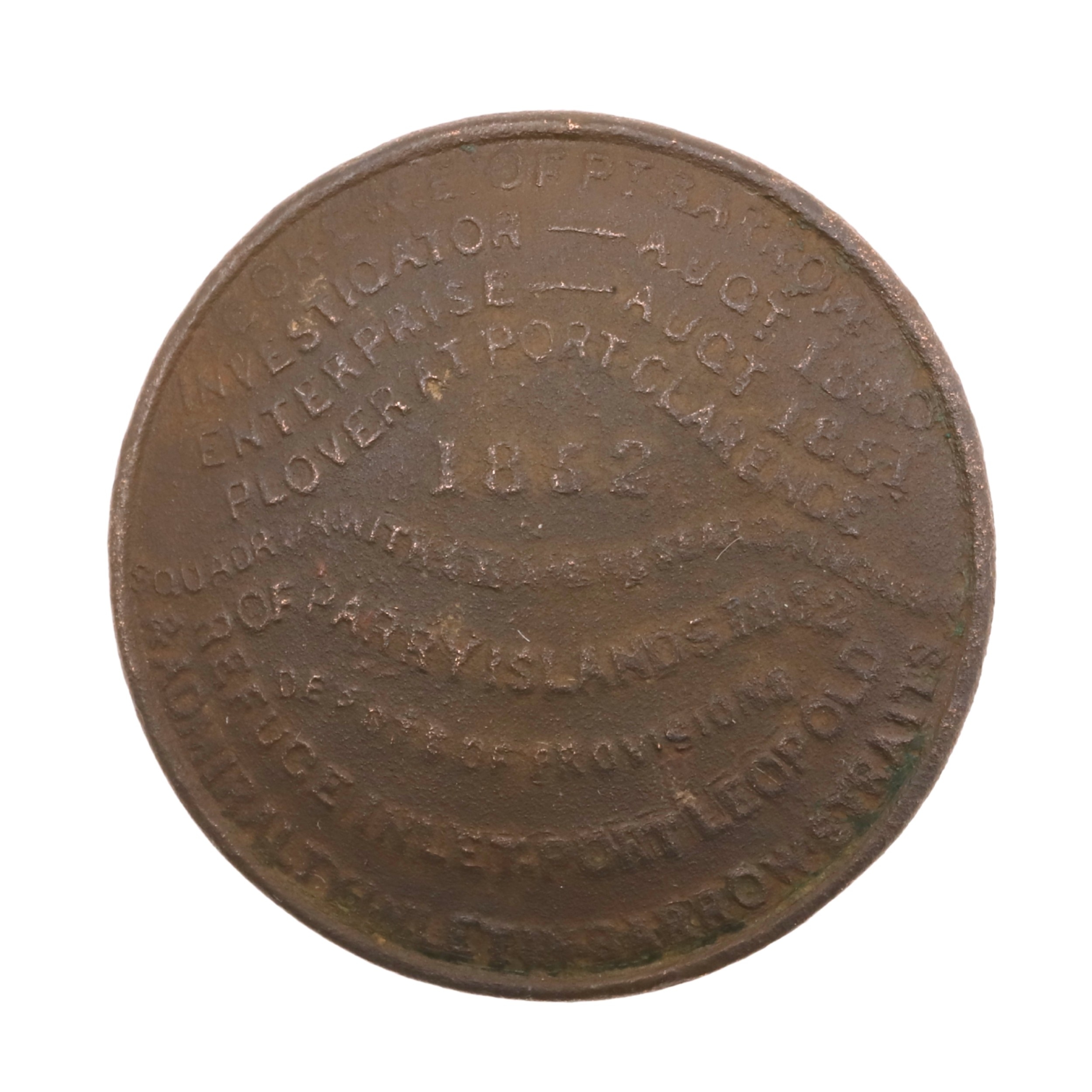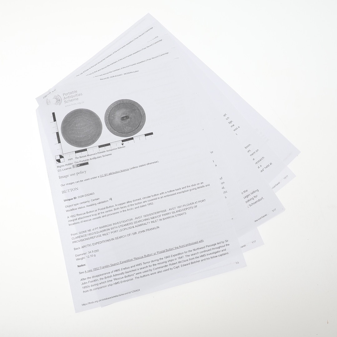 AN 1852 FRANKLIN SEARCH EXPEDITION 'RESCUE BUTTON' OR 'POSTAL BUTTON'. An 1852 'Rescue Button' or 'Postal Button' for Franklin's lost expedition to find the North West Passage of 1845. The button detailing the location of stores of provisions and rescue ships. "1852 Gone N.E. of Pt. Barrow. Investigator - Augt. 1850. Enterprise Augt 1851. Plover at Port Clarence. Squadron with steamers searching N& W of Parry Islands 1852. Depots of provisions. Refuge inlet. Port Leopold & Admiralty inlet in Barrow Straits." The reverse "Arctic Expeditions in search of Sir John Franklin." 3.4 cm Following the end of the Napoleonic Wars the Admiralty needed new goals for its most ambitious Captains, and Arctic exploration was to be one of these. Specifically the search for the North West Passage and to journey to the North Pole. Franklin's was one of the most celebrated of these expeditions, and fuelled by the efforts of his wife, the search for his ships and crew was almost more famous than the expedition itself. The expedition took two ships, HMS Erebus and HMS Terror captained by Francis Crozier, the most modern and best equipped ships of their time. Sir John Franklin, an experienced Naval Officer who had fought at Trafalgar, felt the discovery of the North West Passage might be the crowning achievement of his career. An experienced polar explorer he was known to the public as 'The man who ate his boots' following problems on a previous voyage, there were few better candidates to lead the expedition. At the time a voyage which was considered 'the greatest single expedition of discovery Britain had ever mounted'. With 129 men and supplies for three years the two ships headed north to complete some of the last few unexplored gaps on the Victorian map. Heading into the otherworldly Arctic where the risk of frost-bite, scurvy, being trapped by the ice, polar bear attack, or the numerous other perils of exploration in such inhospitable parts of the world, it is easy to understand the public's interest in such a voyage. The ships were last sighted in July of 1845 and rescue parties were sent as early as 1847. For such expeditions to spend several winters in the ice was not uncommon. John Ross, for instance, was rescued two years after he had been feared dead when he failed to return from his explorations. The numerous rescue expeditions, over thirty in total, began to search from 1848 with three relief ships from the Admiralty, and eventually a £20,000 reward being offered. Unfortunately none were totally successful and all led to further loss of life. Hundreds of balloons spread the message, thousands of printed despatches, rockets, gunshots, drums, messages attached to Arctic foxes, flashing lights and these extraordinary buttons, were all used to try and communicate with the missing men. The buttons were given to Inuit hunters who, it was hoped, might pass them on to the men. Believed to have been used between 1852-54 by Commander Robert McClure of HMS Investigator and its companion ship HMS Enterprise, and by Captain Belcher and others during the multi-ship squadron's search the buttons were disseminated far and wide. How many buttons were produced is not known. This is probably only the 5th example known of this extraordinary artefact, almost unbelievably a detectorist find from West Dorset (DOR-D32A63). The other four include one in the Smithsonian Institution which has been used as a pipe bowl on an Inuit pipe, and most recently an example was sold by Bearnes in Exeter. An image of this button is to be included in Brian Read's forthcoming work on buttons.