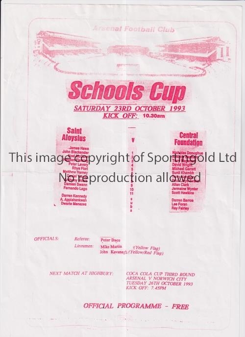 AT ARSENAL / SCHOOLS CUP 1993 Single sheet programme for St. Aloysius v Central Foundation 23/10/1993, horizontal fold. Generally good