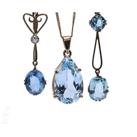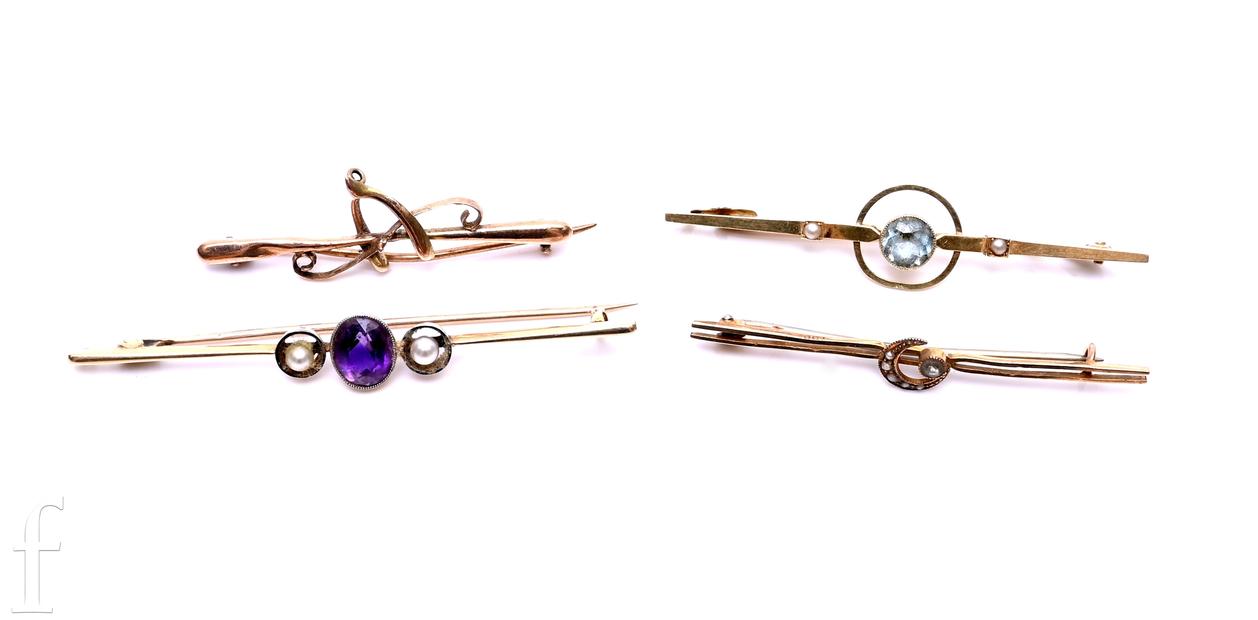 An amethyst and seed pearl brooch, circa 1900, the circular mixed-cut amethyst collet set with two seed pearl highlights, total weight 3.6g, 6.3cm long, an Edwardian aquamarine and seed pearl brooch, the mixed-cut aquamarine millegrain collet set on a knife edge bar with seed pearl highlights, marked '9ct', total weight 3.5g, 5.9cm long, a late Victorian seed pearl and aquamarine bar brooch, marked '9ct', total weight 1.8g, 5.3cm long, and a late Victorian gold brooch, with horseshoe motif, marked '9ct', total weight 1.4g. (4)